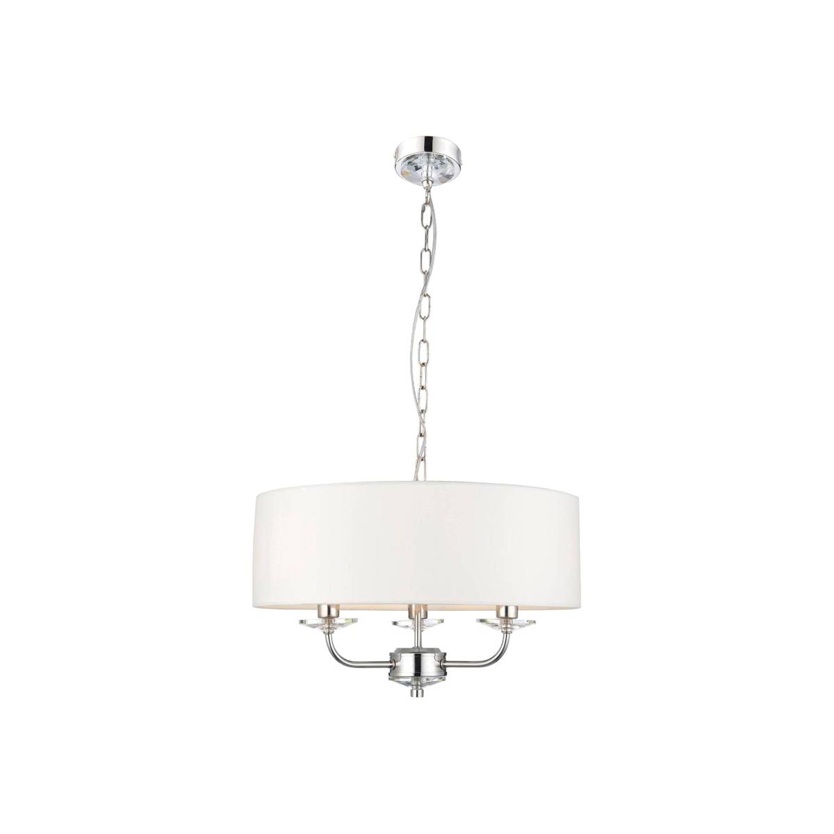 The 3 light ceiling pendant is finished in a bright nickel plate. The 3 arms are complimented with a touch of crystal and the fitting is topped with a narrow, vintage white, faux silk shades. Height is adjustable, dimmable and suitable for use with LED lamps. Matching items available