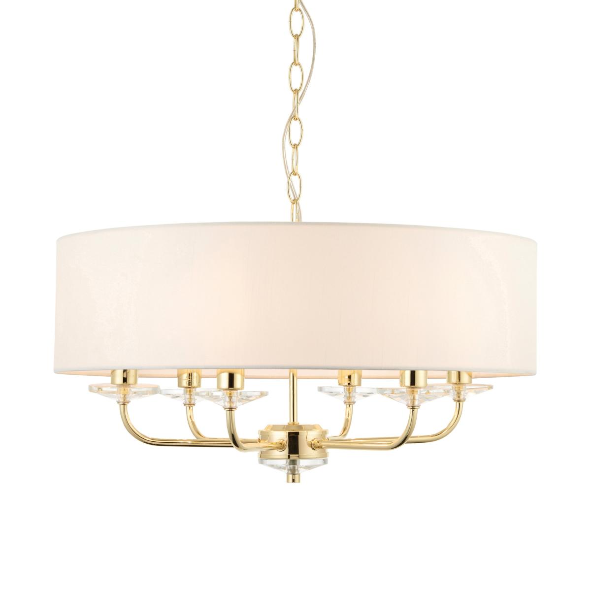 This 6-light ceiling pendant is finished in a brass effect plate. The arms are complemented with a touch of crystal and the fitting is topped with a narrow, vintage white, faux silk shade. Height is adjustable, and the fitting is dimmable and suitable for use with LED lamps. Matching items available.