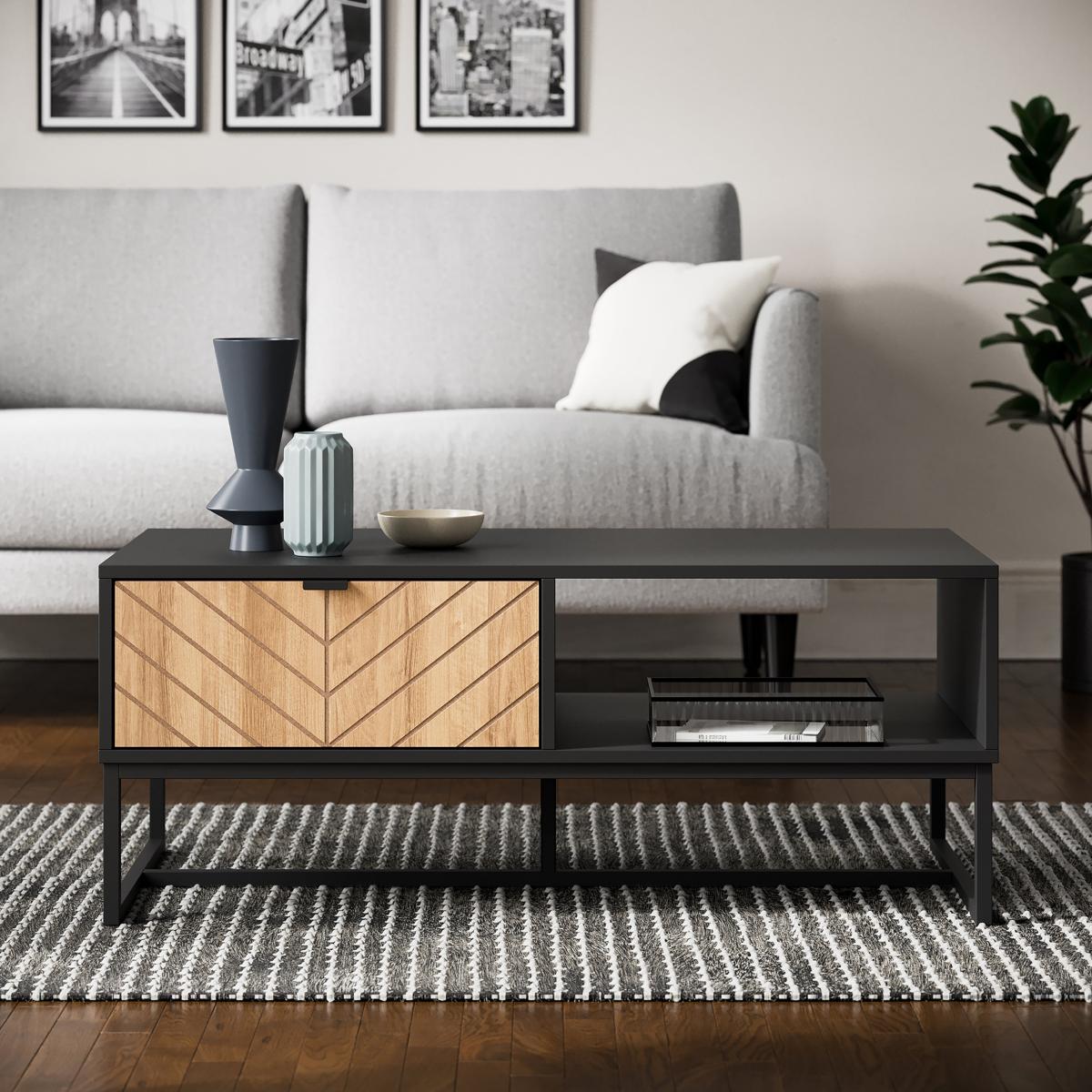 I love this piece for its sleek, modern aesthetic with a touch of warmth from the wooden detail. It's quite versatile and works well in contemporary, minimalist, or Scandinavian-inspired interiors. The dark finish makes it practical for hiding minor stains and fingerprints, making it suitable for everyday living even with guests. Practical styling tips include layering with textured or coloured trays, incorporating decorative books, or adding a statement vase to make it feel curated. Its open shelves also offer handy storage for magazines or remote controls, helping keep your space tidy while maintaining visual interest.