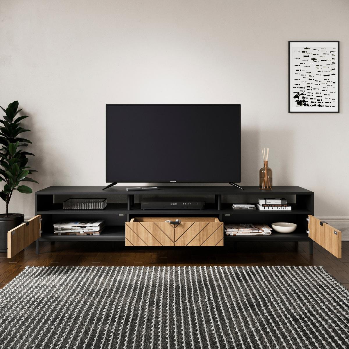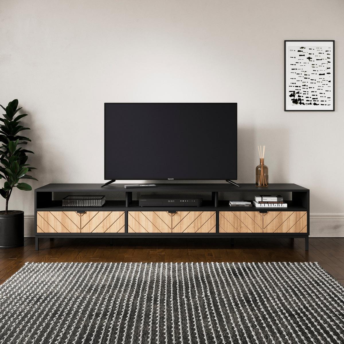 I’m a big fan of the Nixon unit because its mix of matte black metal and patterned timber drawers brings texture without feeling heavy, and it easily handles screens up to 80″. The low profile and slim legs suit both industrial-leaning loft spaces and pared-back Scandinavian schemes, while the generous shelf and drawer storage keeps gadgets and remotes out of sight. For styling, tuck cables behind the centre shelf and use matching baskets or boxes on the open cubby to banish clutter. Keep decorations minimal - a couple of ceramic vases, a small stack of coffee-table books and a low-lying plant work well. Hang art or a mirror over your TV to draw the eye upwards and consider a subtle LED strip behind the unit for soft ambient light.