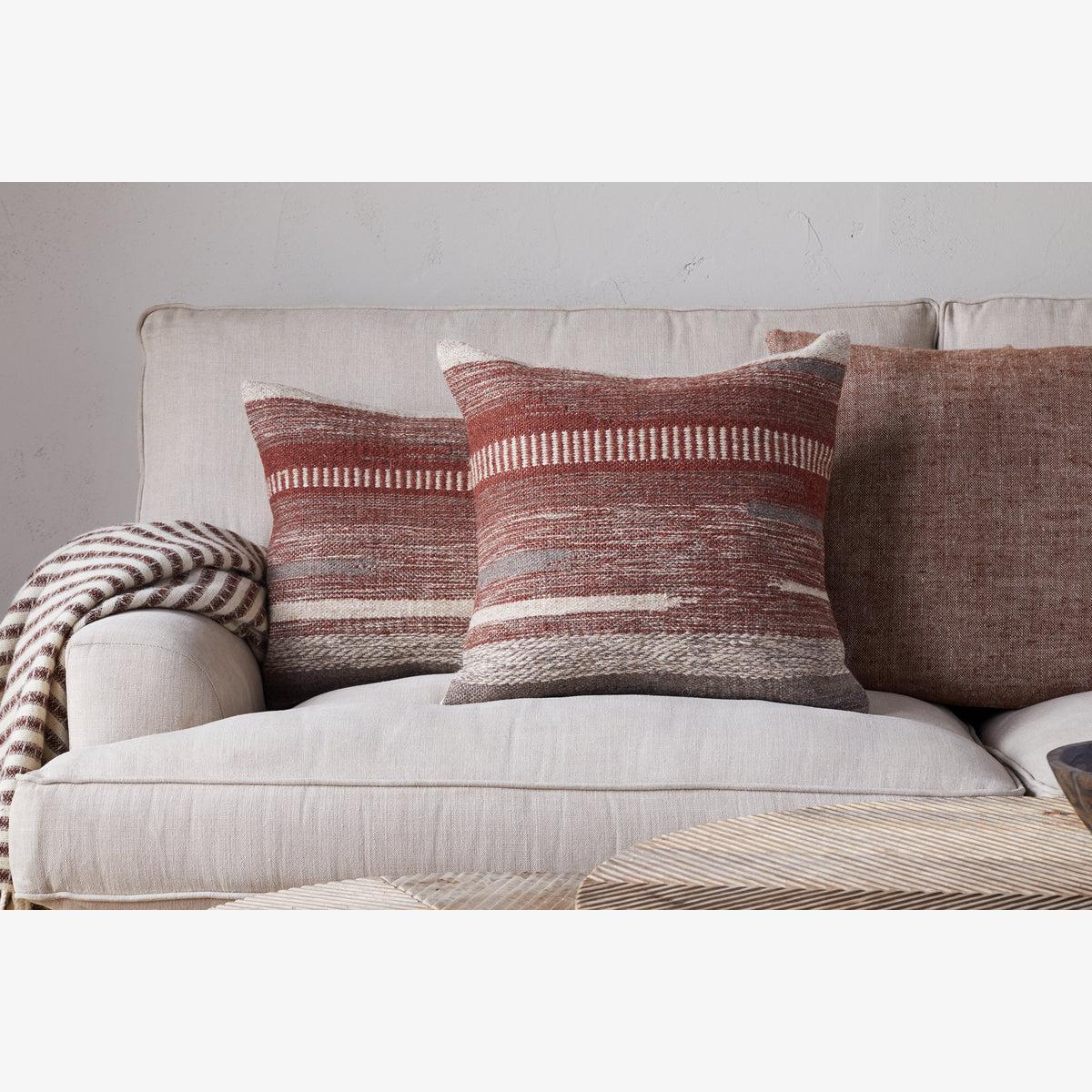 This cushion cover brings warmth and texture to any space with its rich rust tones and intricately woven design. Made from a soft blend of wool and recycled polyester, it offers a tactile finish that-s both inviting and durable. Perfect for layering on sofas, armchairs, or beds, it adds depth, comfort, and a subtle pop of colour to your home.