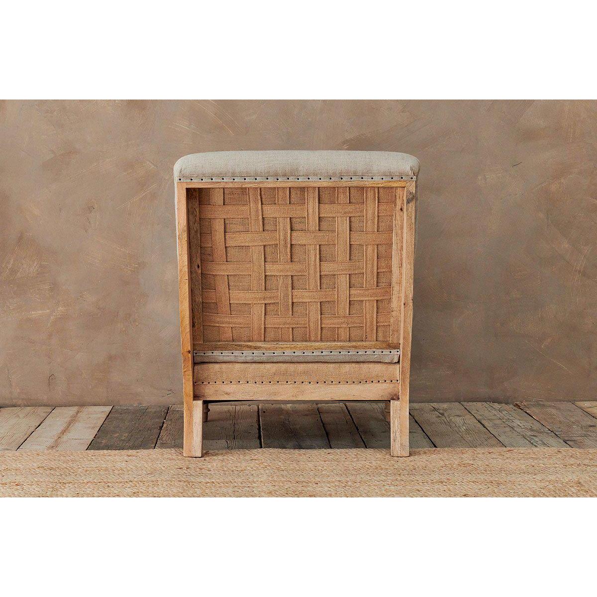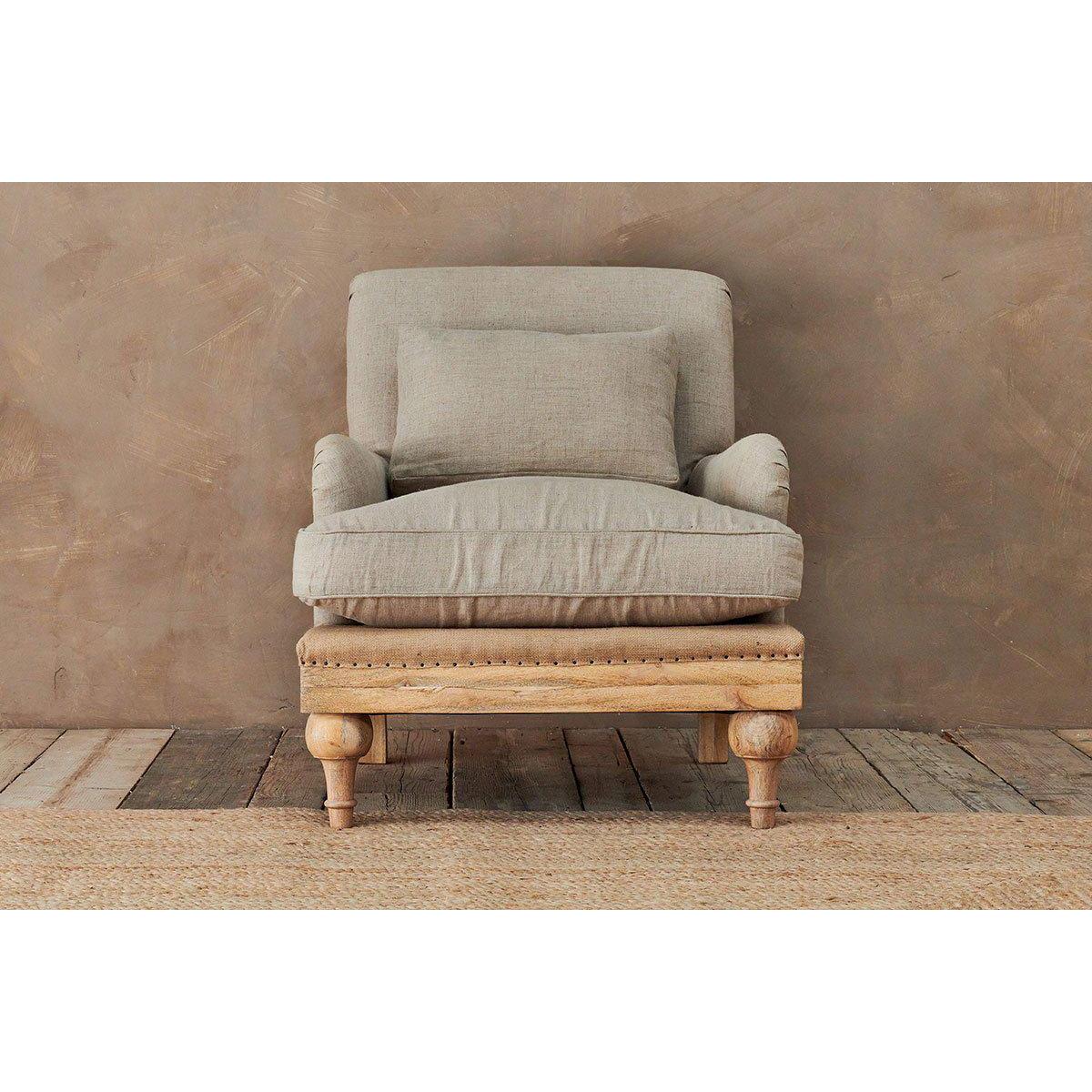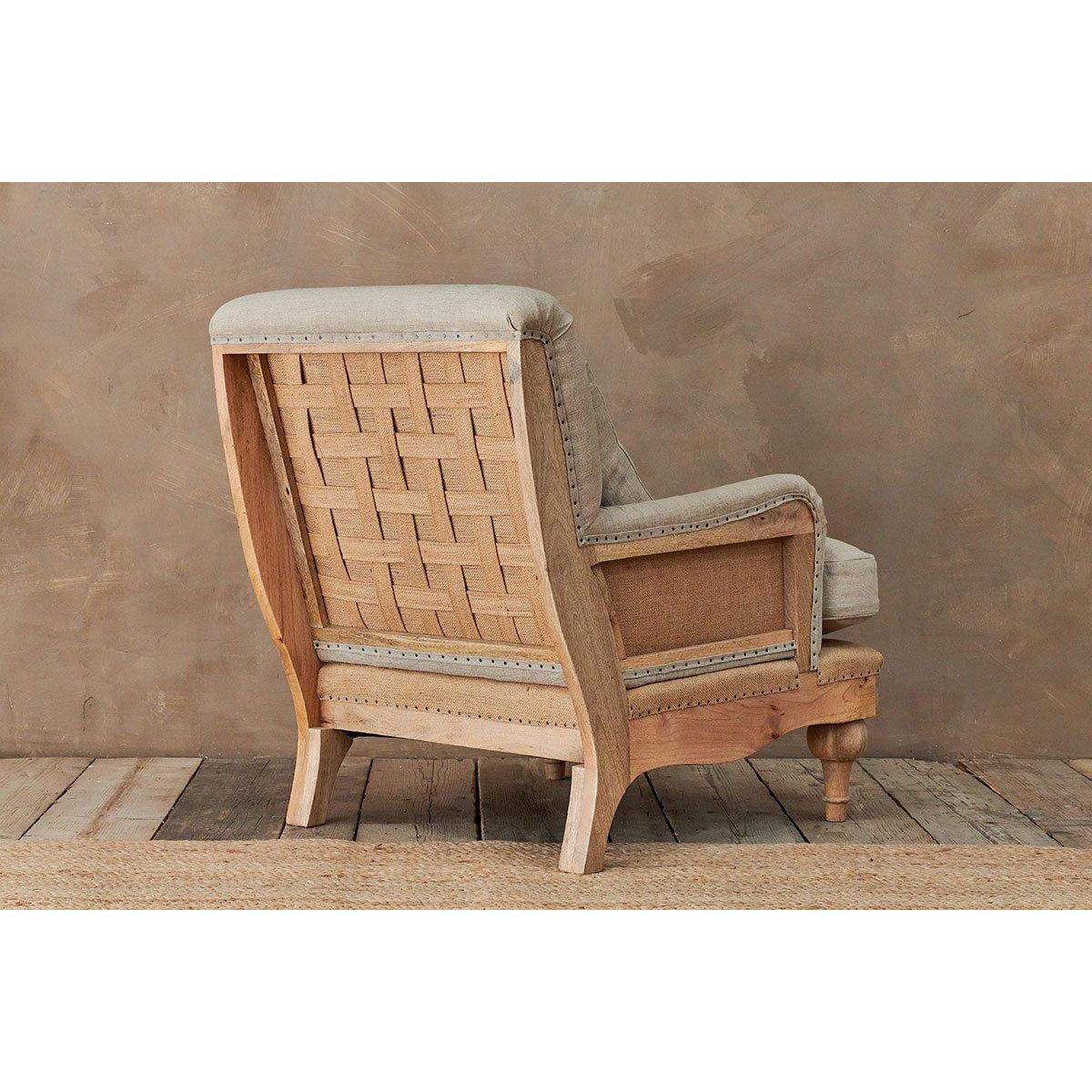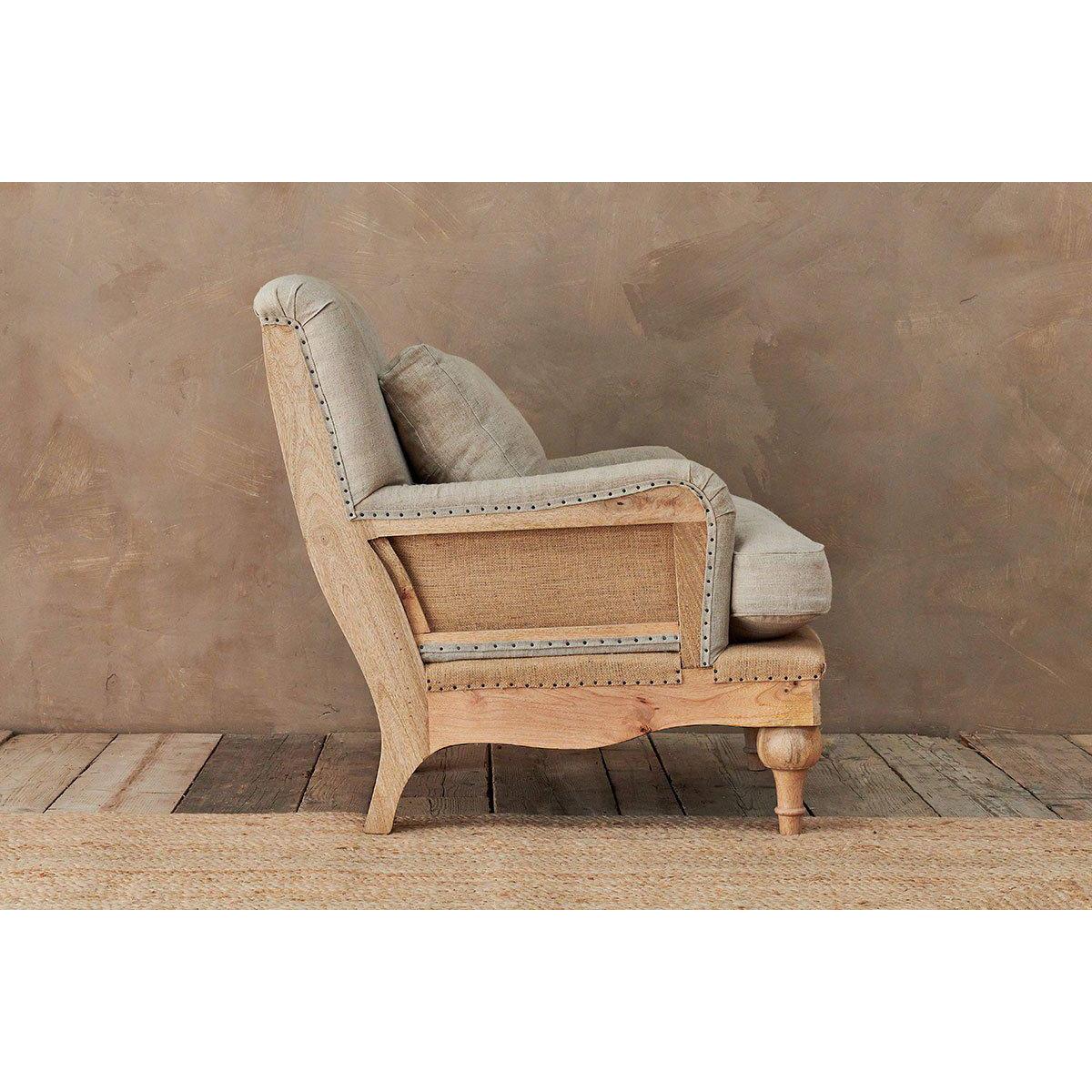 Our Abe upholstered chairs are timeless classics with a twist, the deconstructed back and sides reveals a natural mango wood frame and hemp lining. The front of each chair is upholstered in a tactile and calm stone or charcoal coloured linen. These beautifully crafted pieces make a subtle and elegant addition to a living room or bedroom. | nkuku Abe Deconstructed Linen Armchair | Seating | Stone | 90 x 80 x 90 cm