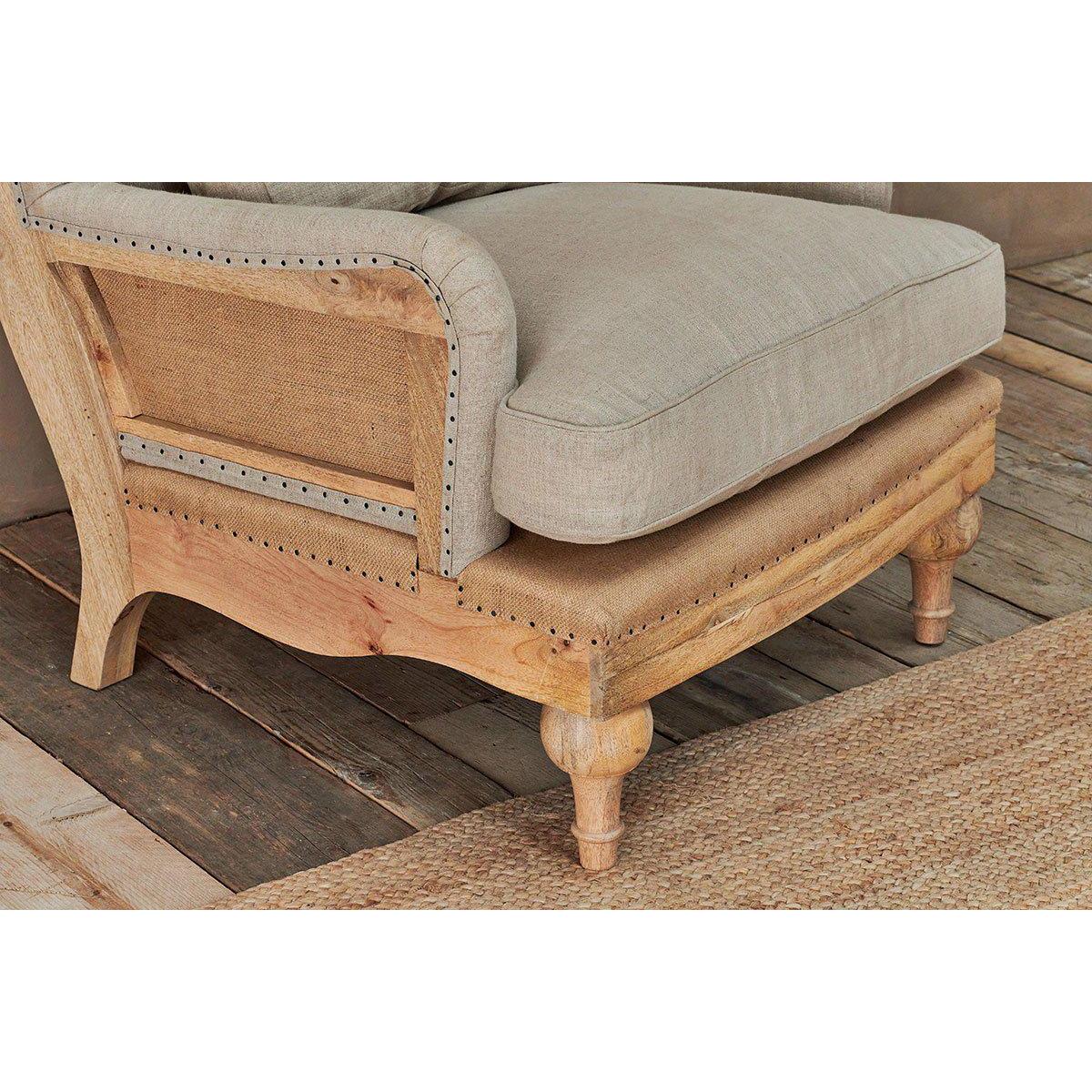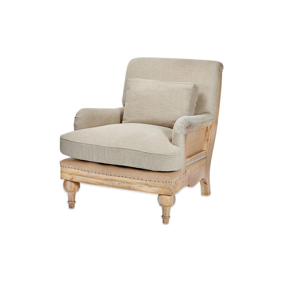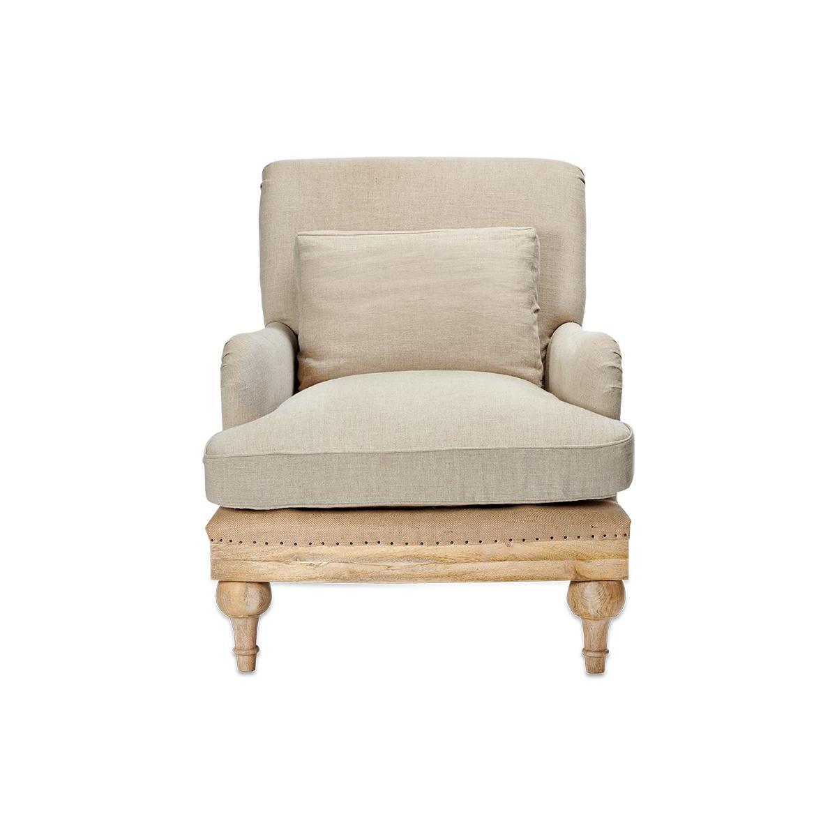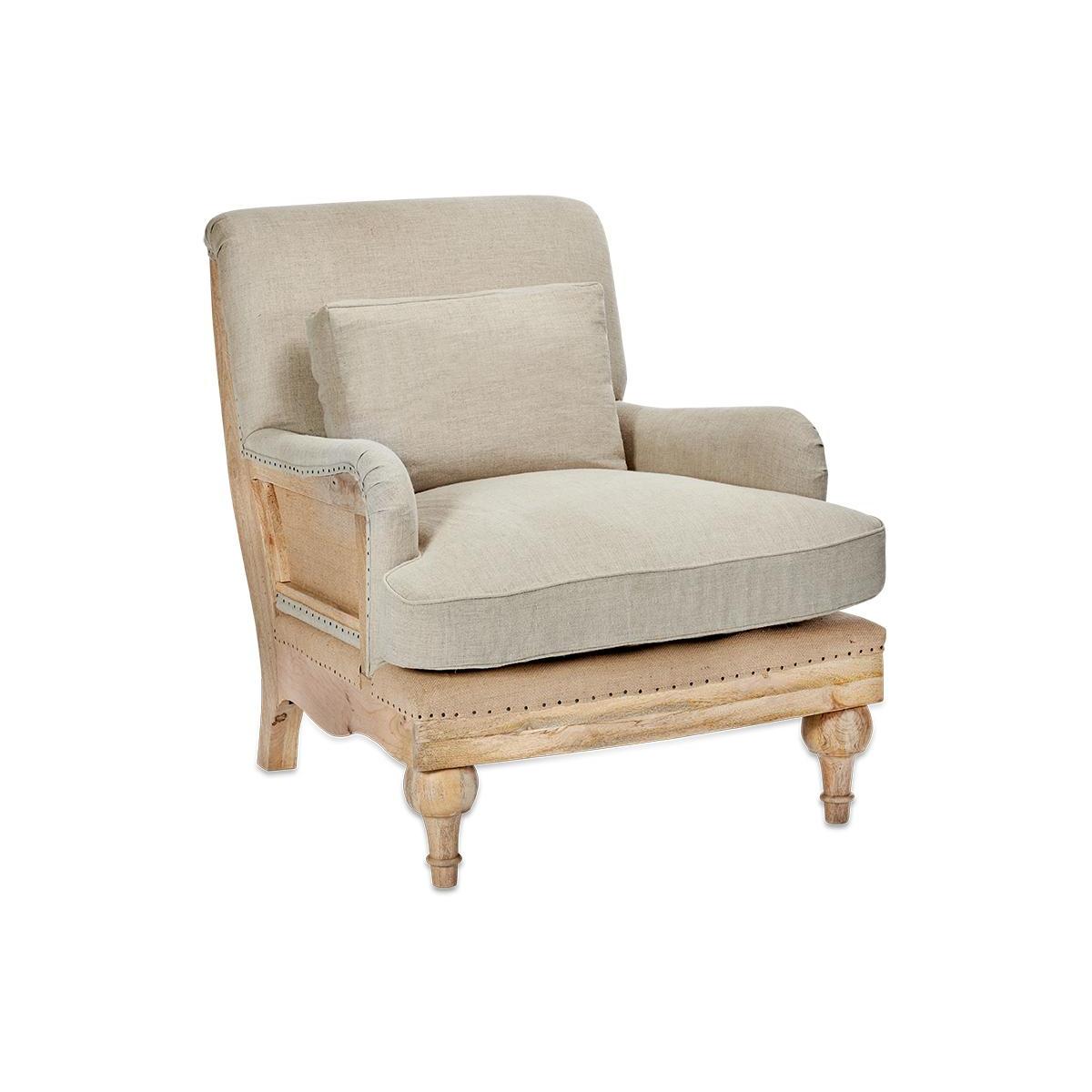Our Abe upholstered chairs are timeless classics with a twist, the deconstructed back and sides reveals a natural mango wood frame and hemp lining. The front of each chair is upholstered in a tactile and calm stone or charcoal coloured linen. These beautifully crafted pieces make a subtle and elegant addition to a living room or bedroom. | nkuku Abe Deconstructed Linen Armchair | Seating | Stone | 90 x 80 x 90 cm