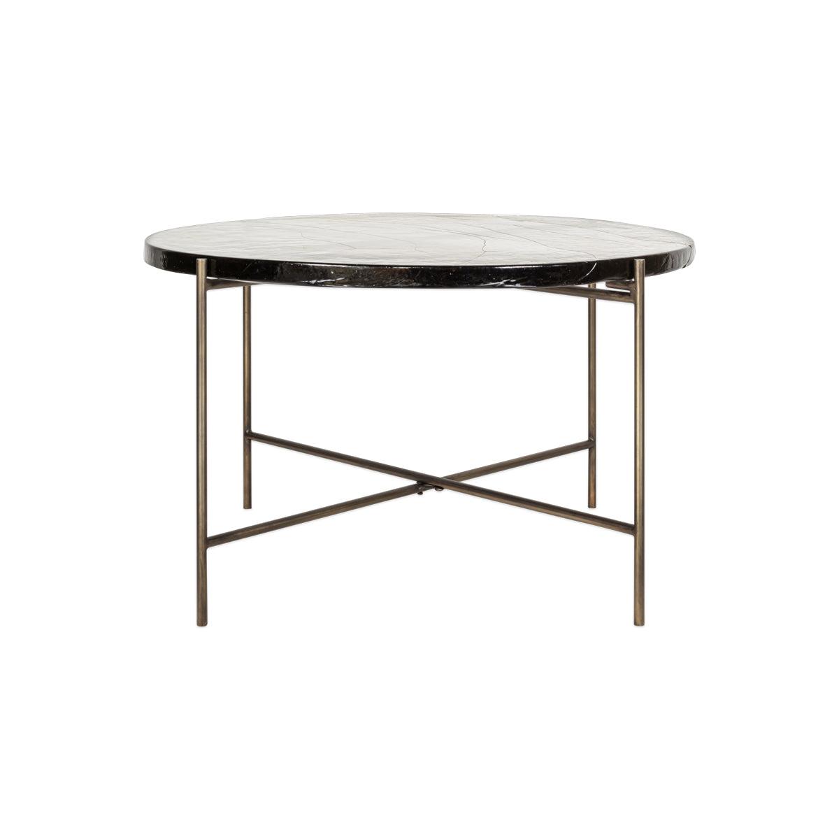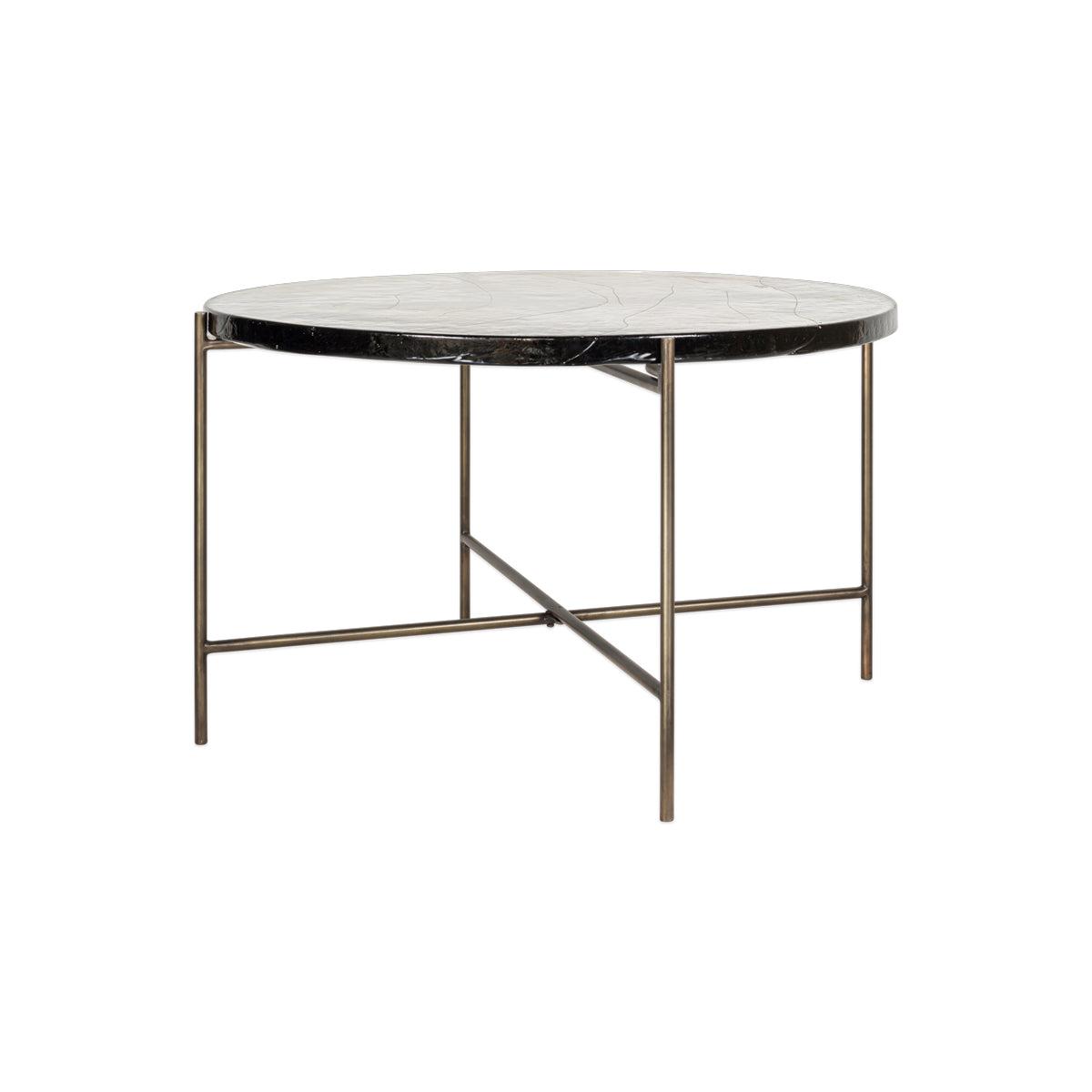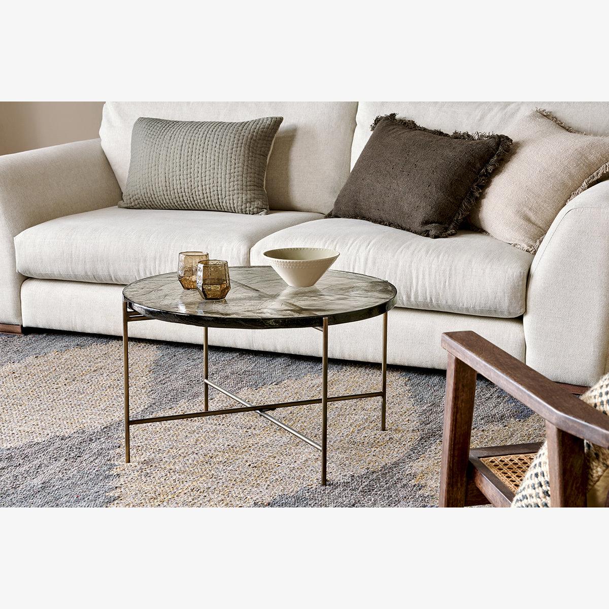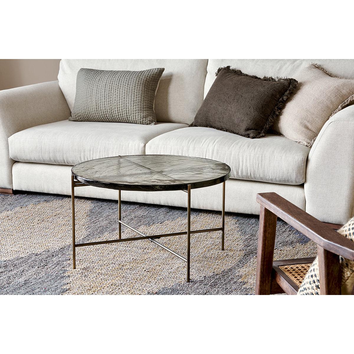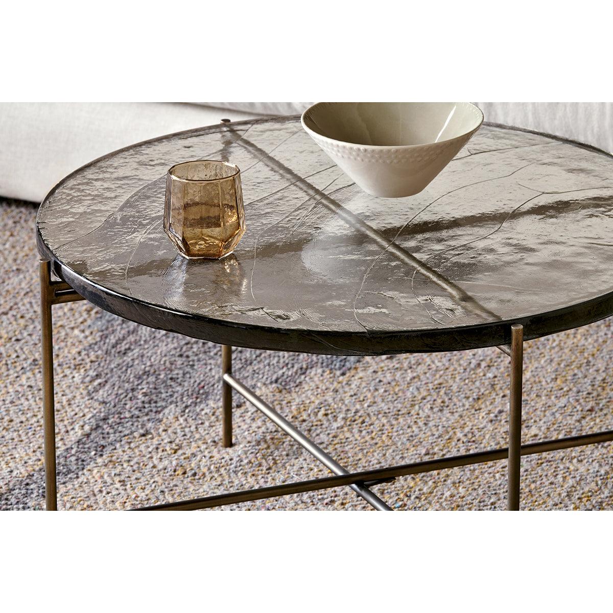 Our circular Aluva Glass Coffee Table has a geometric, timeless design with a base forged from solid iron with an antique brass finish. Perfect in any living space, it becomes a focal point for the room, adding a sophisticated feel to a scheme. The separate glass top slots neatly onto the frame and has been sand cast, a technique dating back to the 15th Century where the design is carved into sand and molten glass poured in. When cooled, the sand is removed to reveal the cast glass to be smooth on the surface but with a wave like pattern and the occasional air bubble, giving the finished piece a beautifully textured, unique finish. There is a matching side table in the collection.