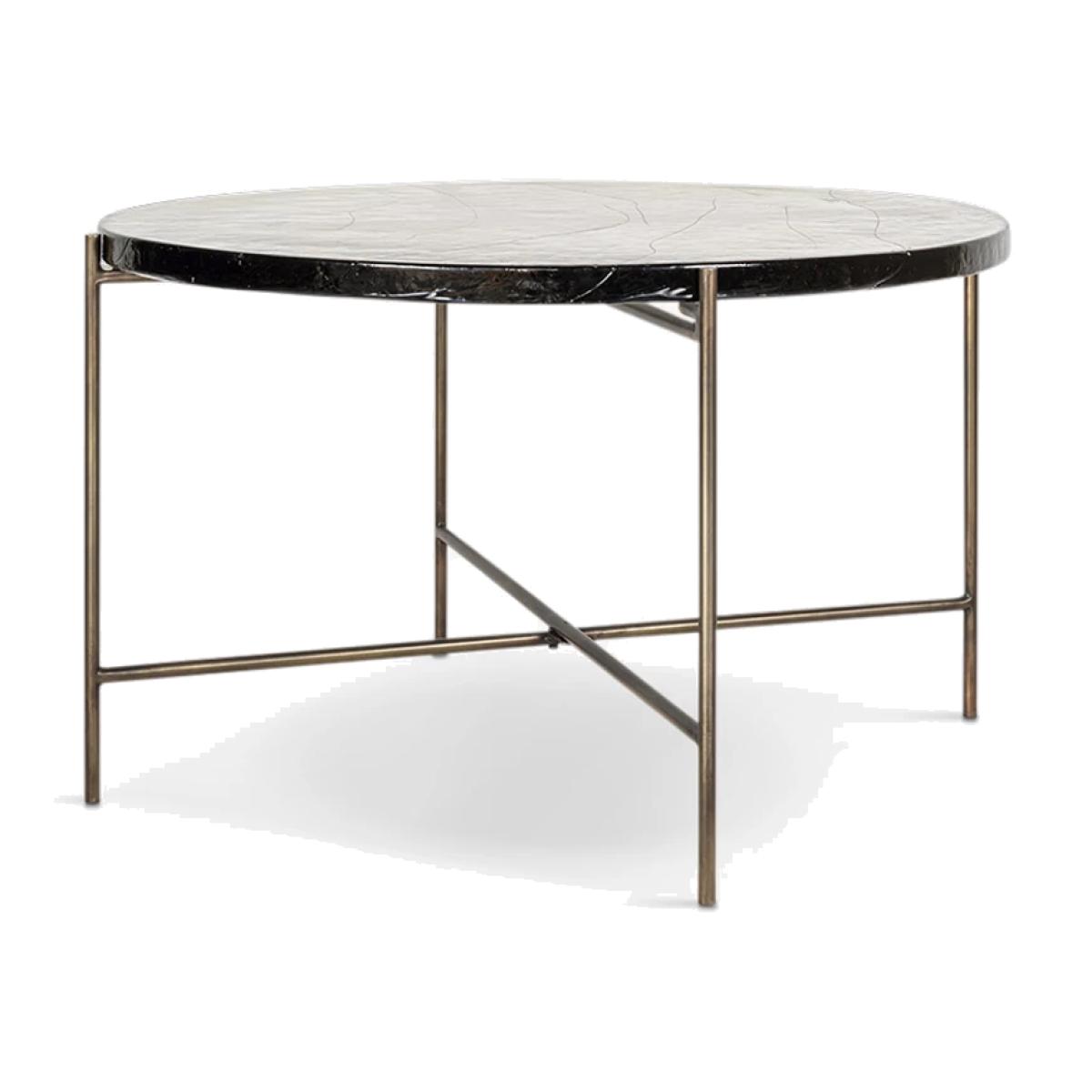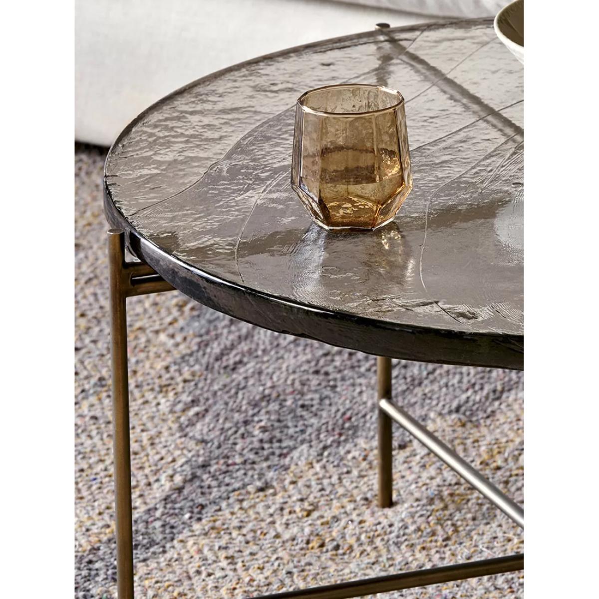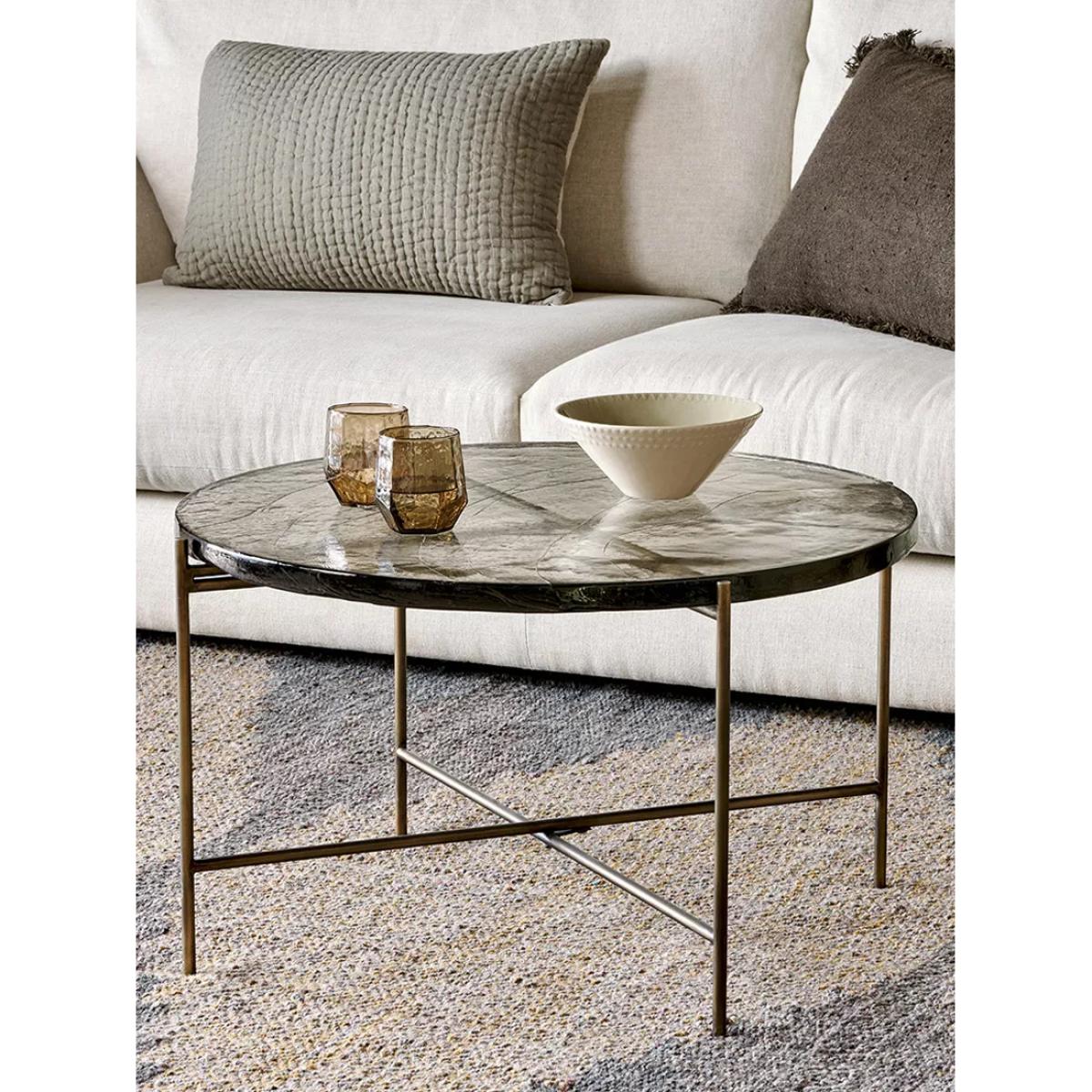 Nkuku's circular Aluva glass coffee table has a geometric, timeless design with a base forged from solid iron with an antique brass finish. Perfect in any living space, it becomes a focal point for the room, adding a sophisticated feel to a scheme. The separate glass top slots neatly onto the frame and has been sand cast, a technique dating back to the 15th century where the design is carved into sand and molten glass poured in. When cooled, the sand is removed to reveal the cast glass to be smooth on the surface but with a wave-like pattern and the occasional air bubble, giving the finished piece a beautifully textured, unique finish.