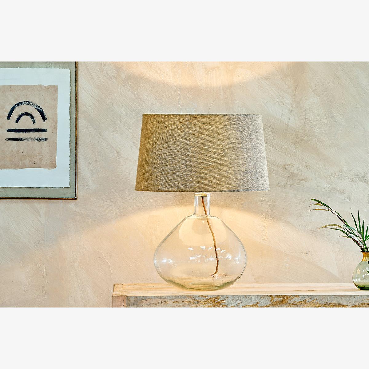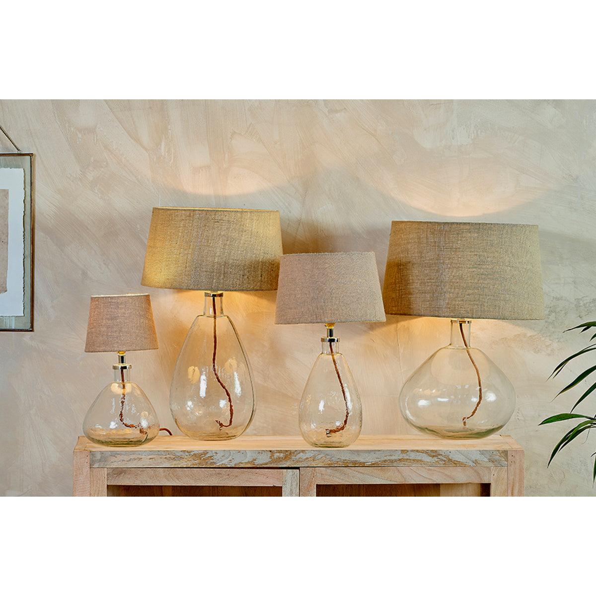 We think this elegant lamp base is divine. It is crafted from recycled glass by skilled artisans in Rajasthan. The hammered effect is created by hand when the glass is molten giving a beautiful textured and imperfect finish. This unusual table lamp is hand blown by skilled artisans. Each of these glass table lamps has a timeless design which mean they'll look elegant in any home. Style with our Dia Jute Lampshades (sold separately).Large wide lamp is pictured with the extra large sized Dia Jute Lampshade.
