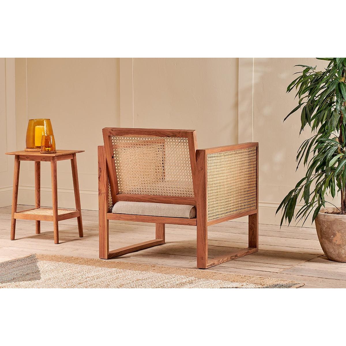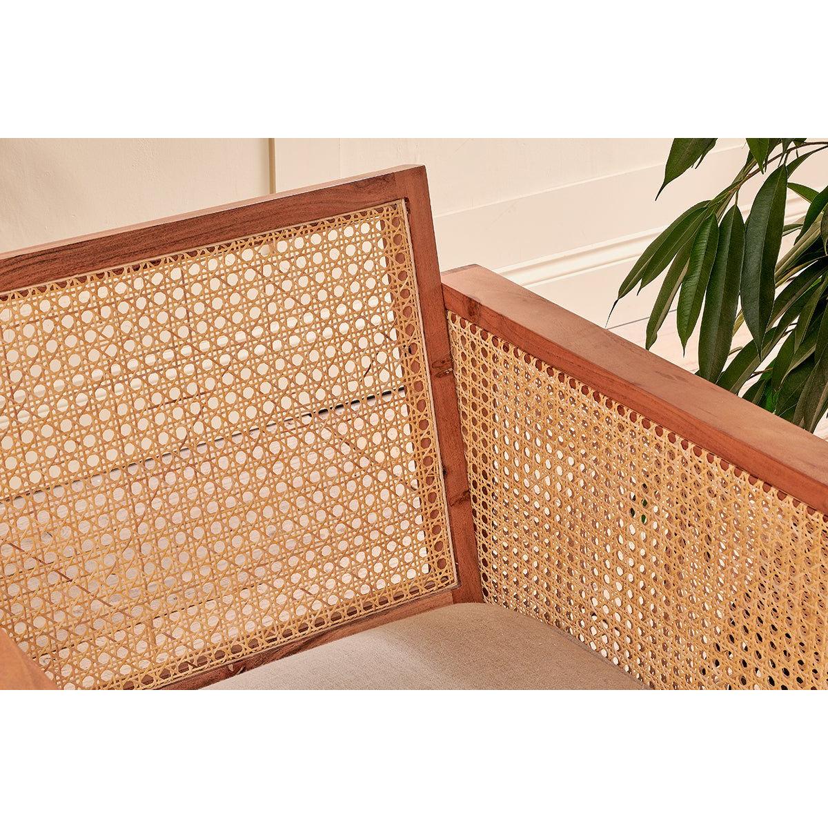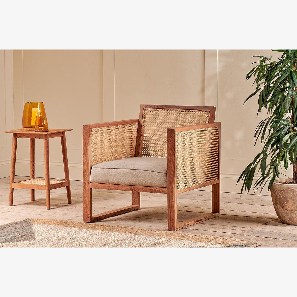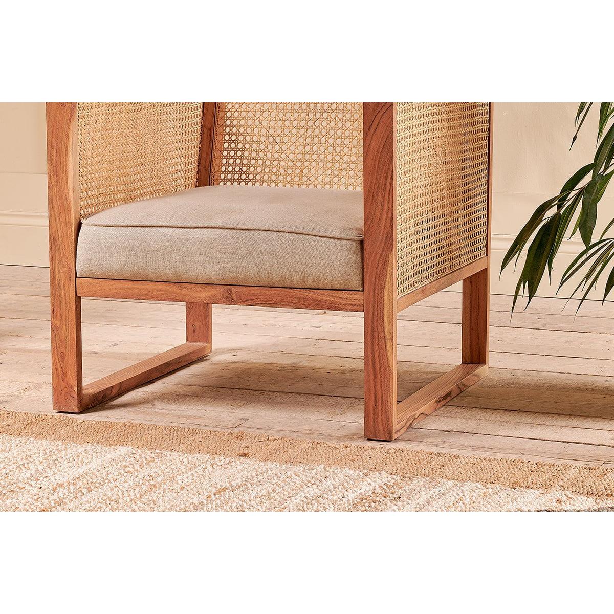 The Balibar cane armchair marries contemporary design with timeless natural materials. The box like design gives the Babliar a club chair feel, that is enhanced with the warm tones of acacia wood. The sandblasted finish adds character and texture. The handwoven cane celebrates the age old tradition of cane work. The rattan is split into thinner threads to create a lighter material that is easier to weave. The light, airy qualities of which compliment the acacia wood. The natural linen upholstered seat adds a softness to this eye - catching armchair.