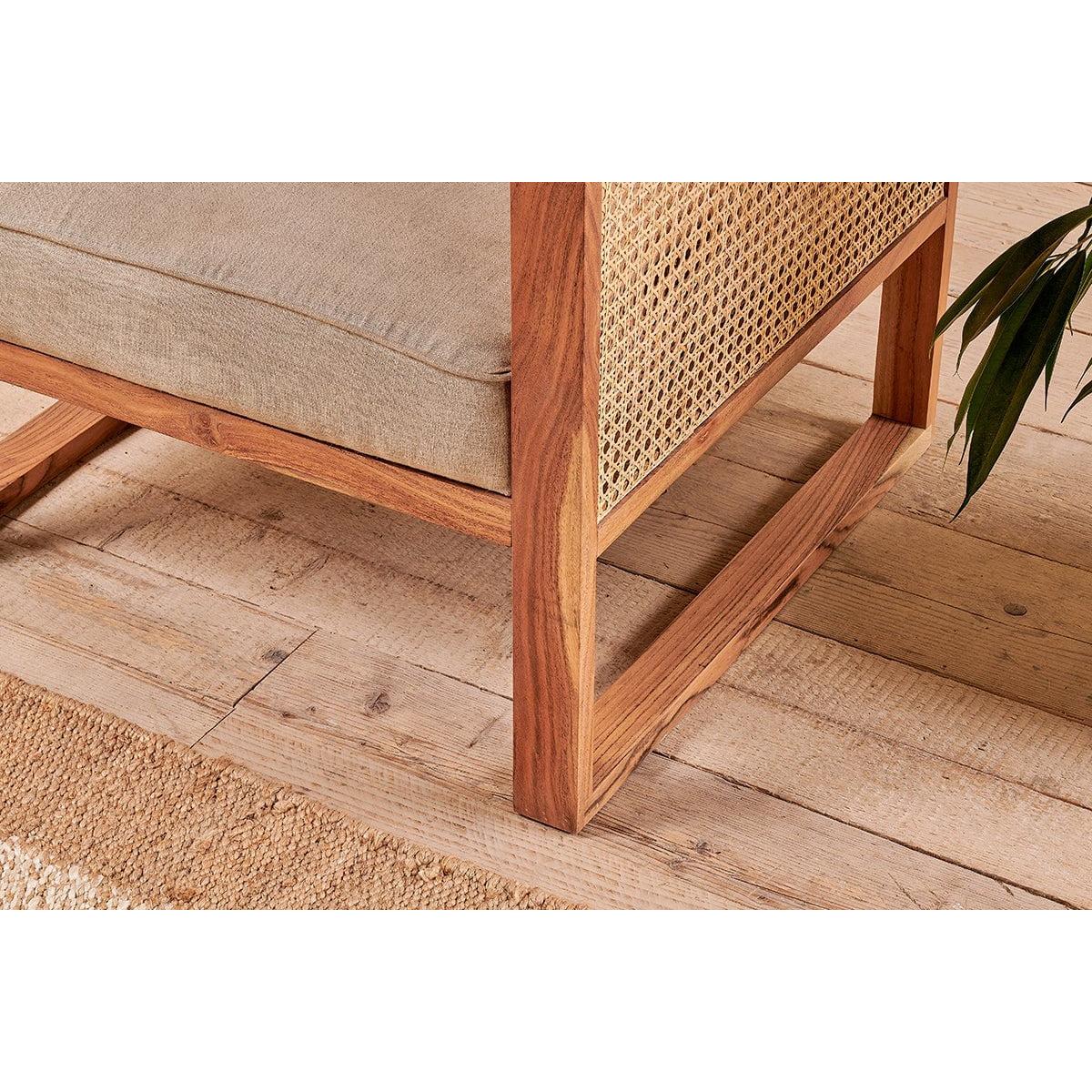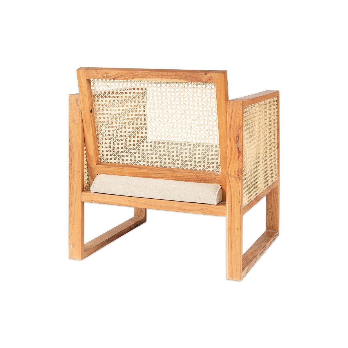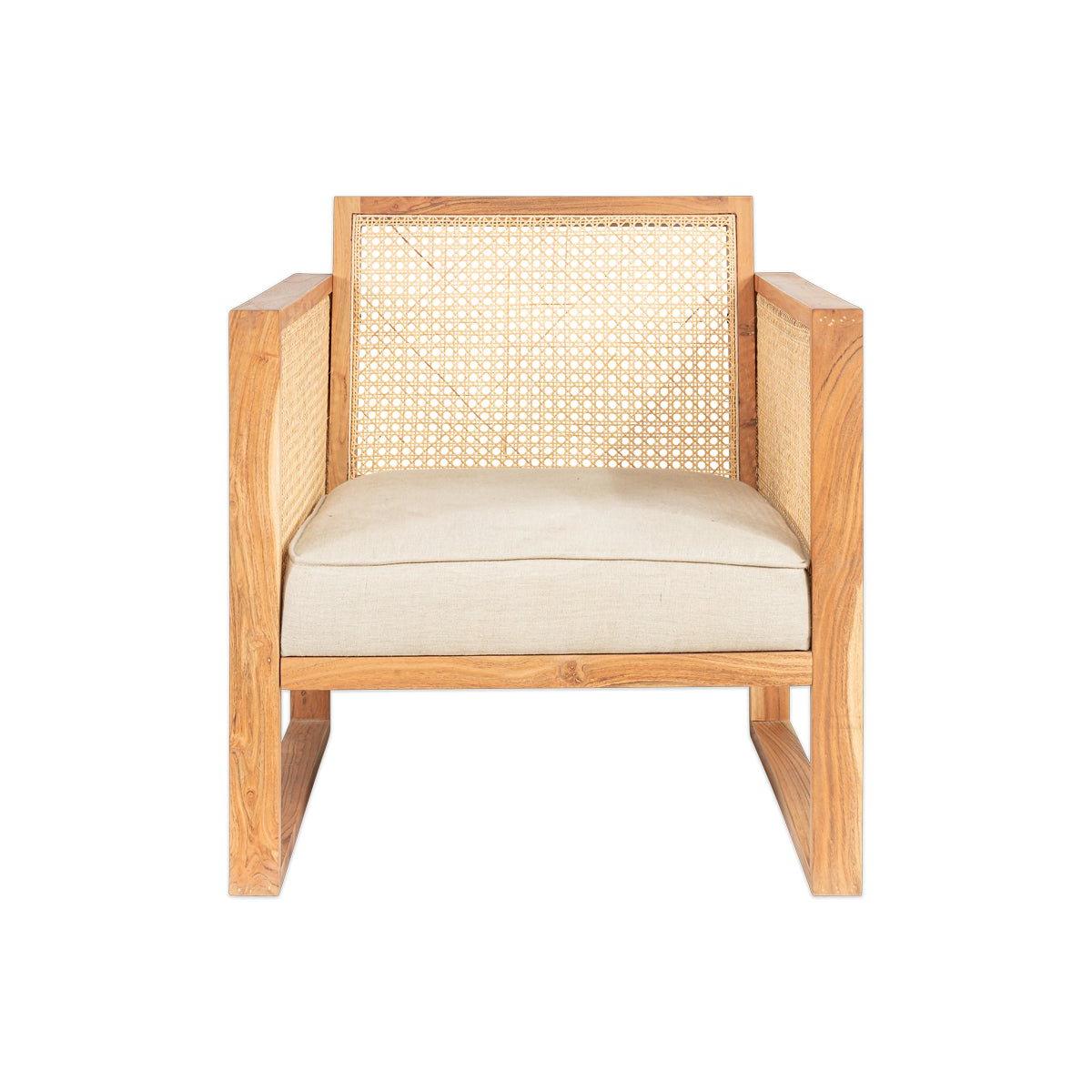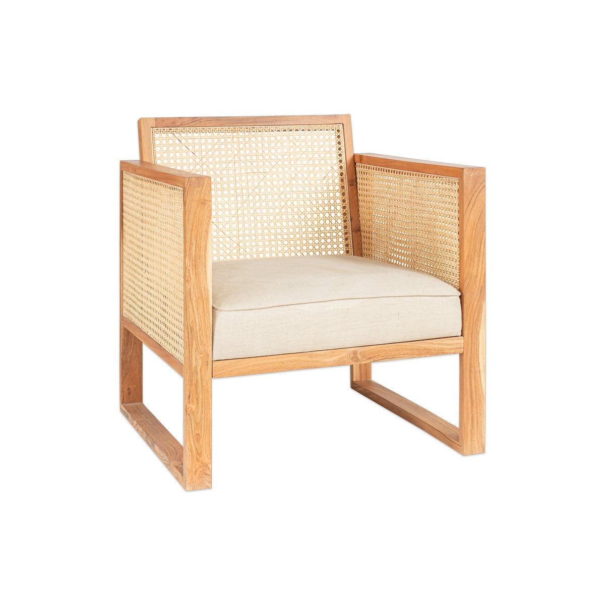 The Balibar cane armchair marries contemporary design with timeless natural materials. The box like design gives the Babliar a club chair feel, that is enhanced with the warm tones of acacia wood. The sandblasted finish adds character and texture. The handwoven cane celebrates the age old tradition of cane work. The rattan is split into thinner threads to create a lighter material that is easier to weave. The light, airy qualities of which compliment the acacia wood. The natural linen upholstered seat adds a softness to this eye - catching armchair.