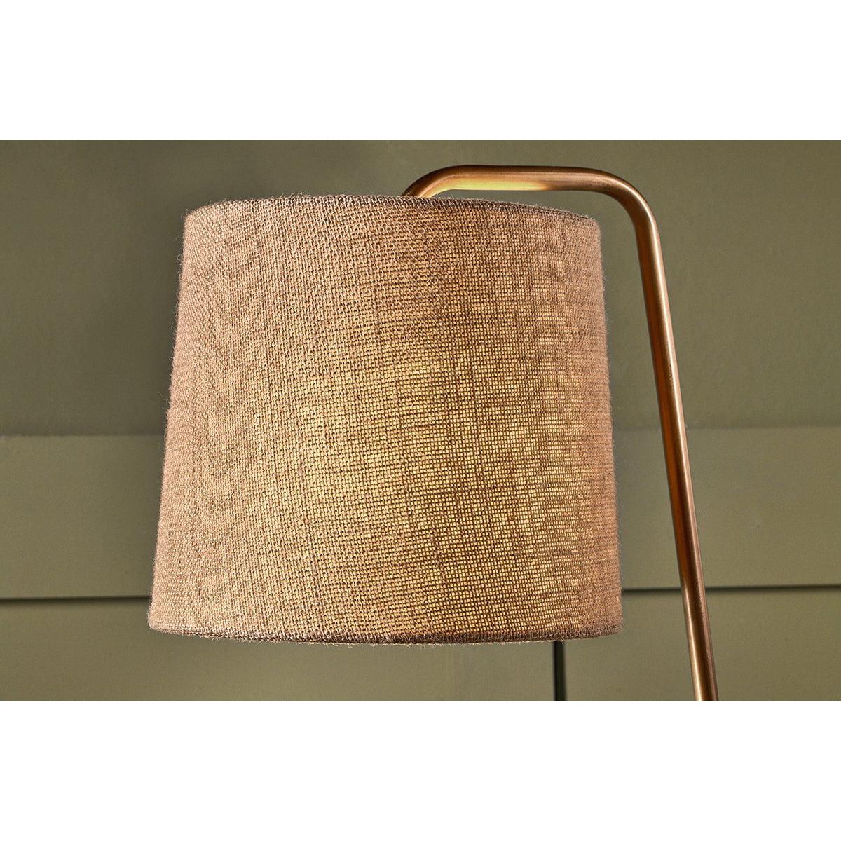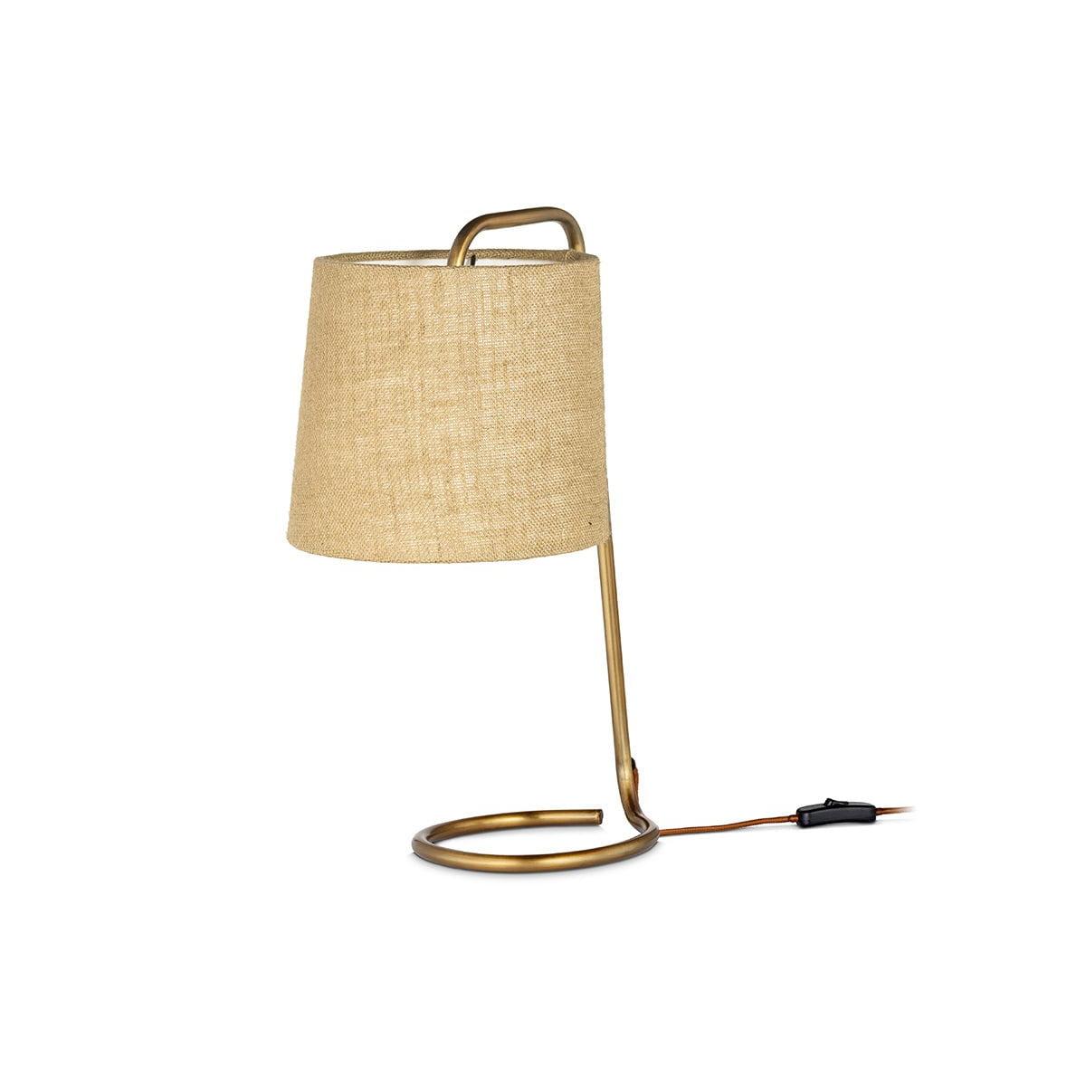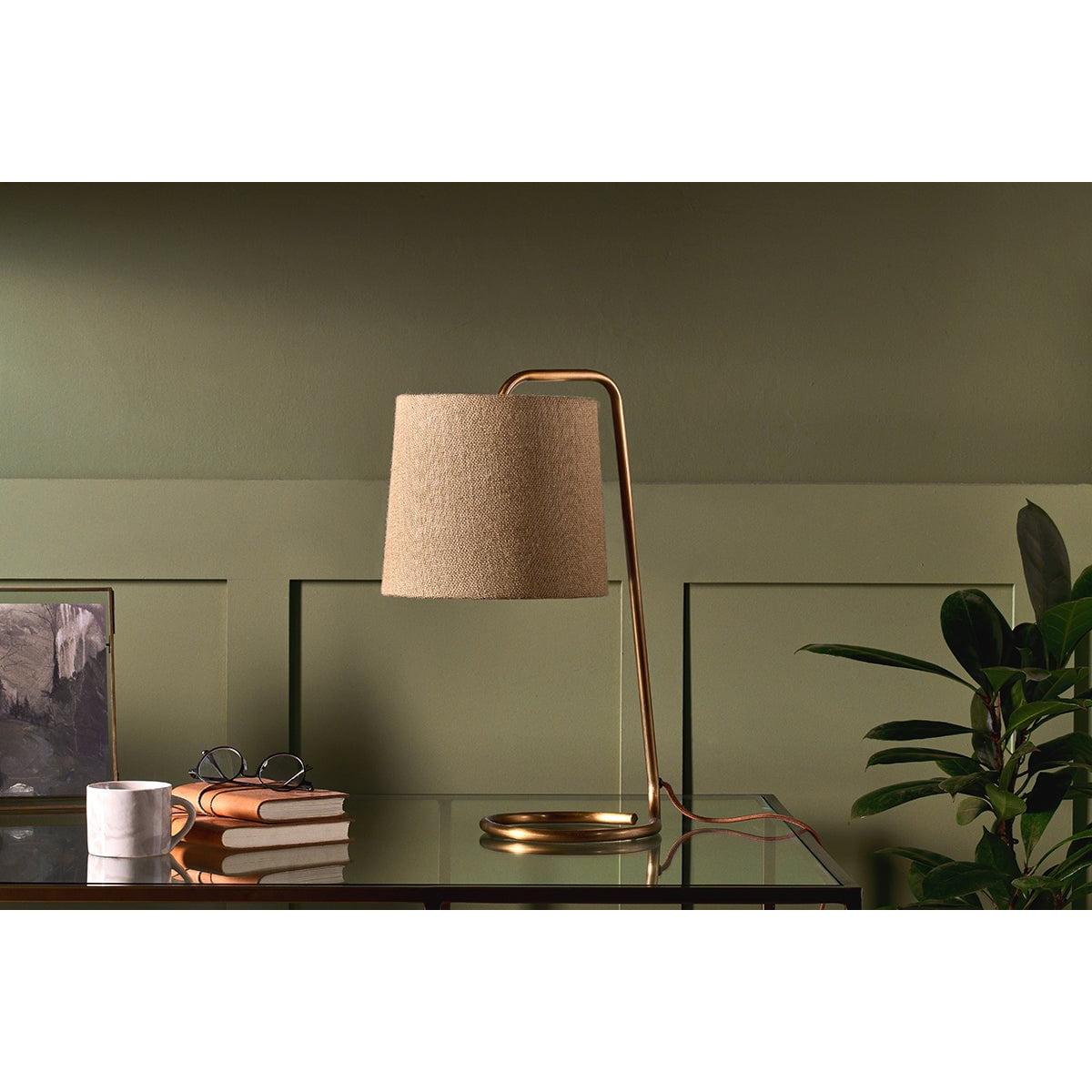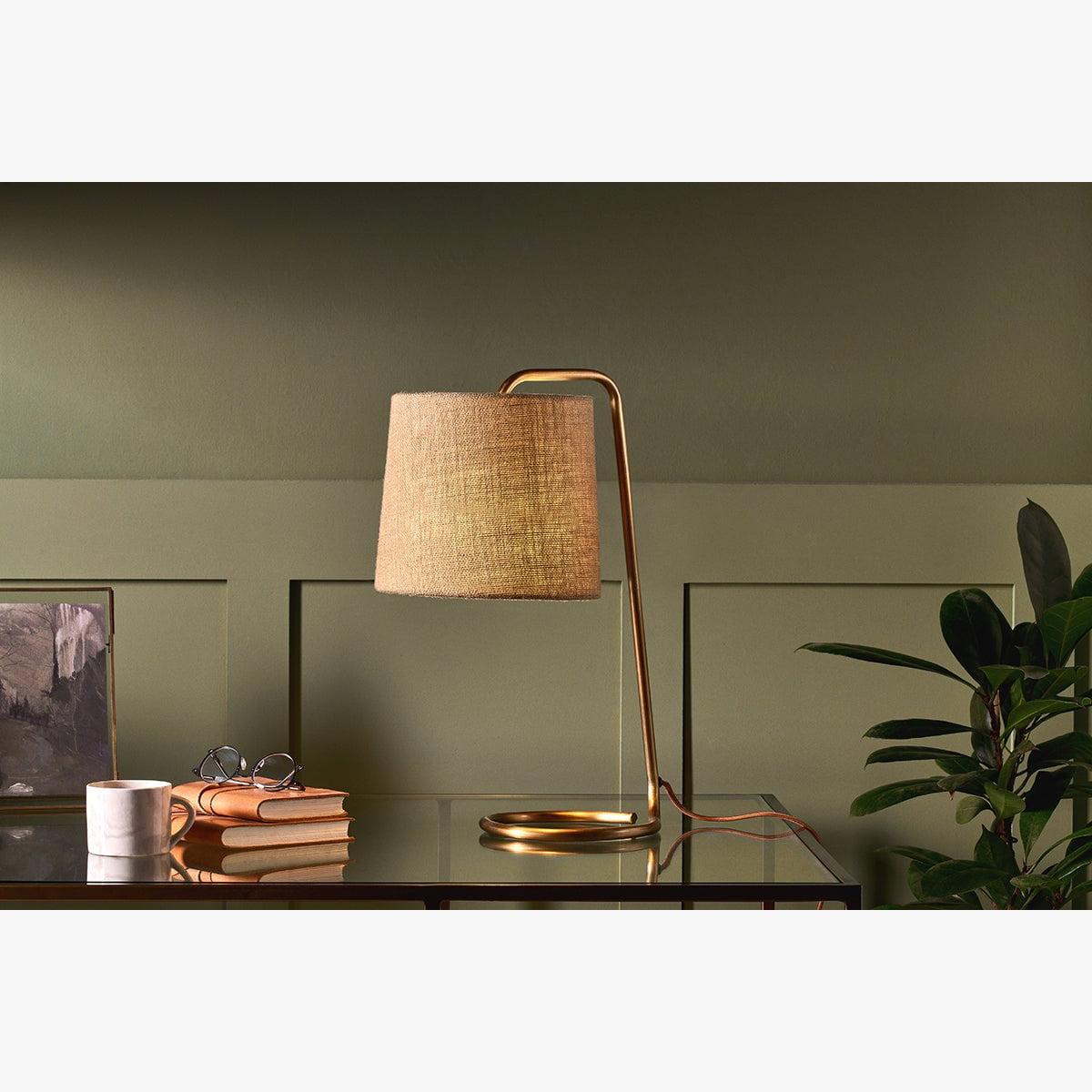 The simple yet elegant curve of our Belda desk lamp gives it a sophisticated, contemporary feel. Its warm brass hue perfectly complements the natural jute lampshade, making it a stylish addition to any tabletop. Ideally suited to an office, the light is softly diffused through the textured jute to create a warm, inviting ambience. Jute is a biodegradable and durable fabric with a minimal carbon footprint, bringing a sustainable quality to this lamp.