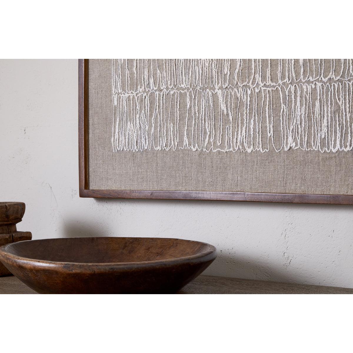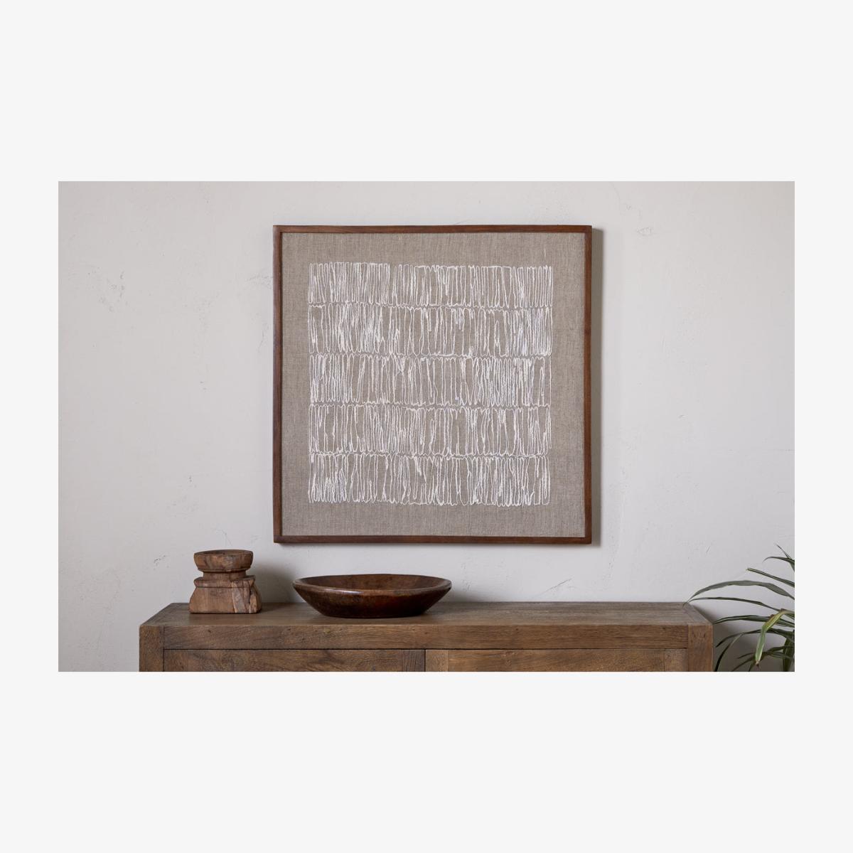 This hand-stitched wall art draws inspiration from traditional Indian Brahmic script, reinterpreted in a creative, textural design. The calming palette of walnut, olive grey, and soft white adds a quiet, grounding presence to any living space. Framed in sustainable mango wood, it balances thoughtful craftsmanship with natural materials. Pairs beautifully with our Samaya wall art for a harmonious display.
