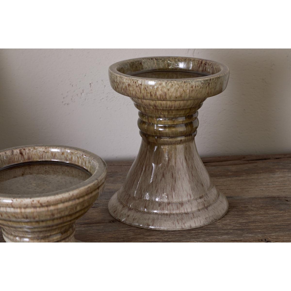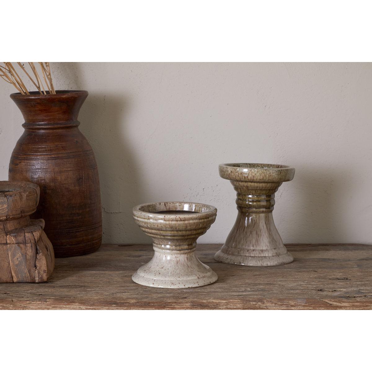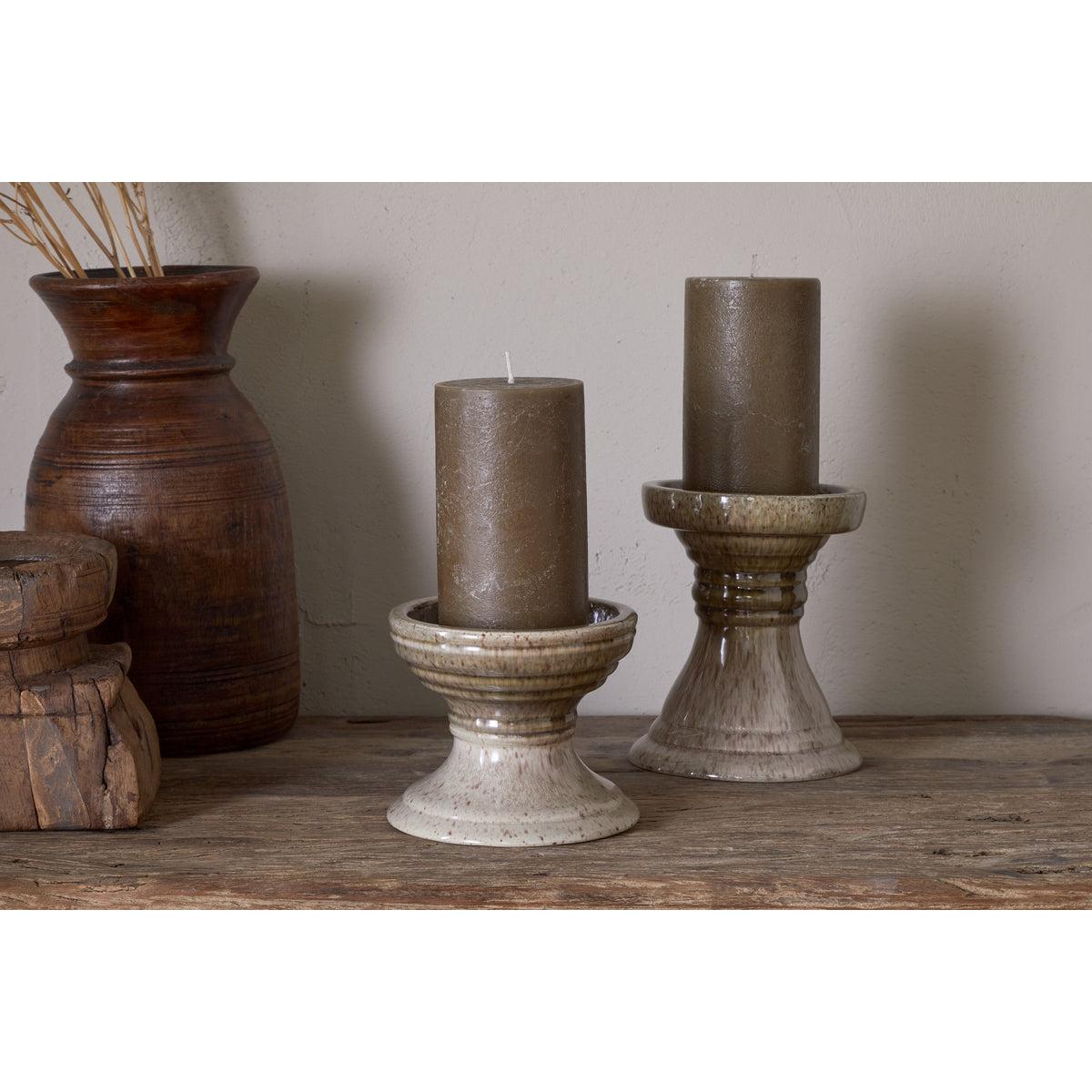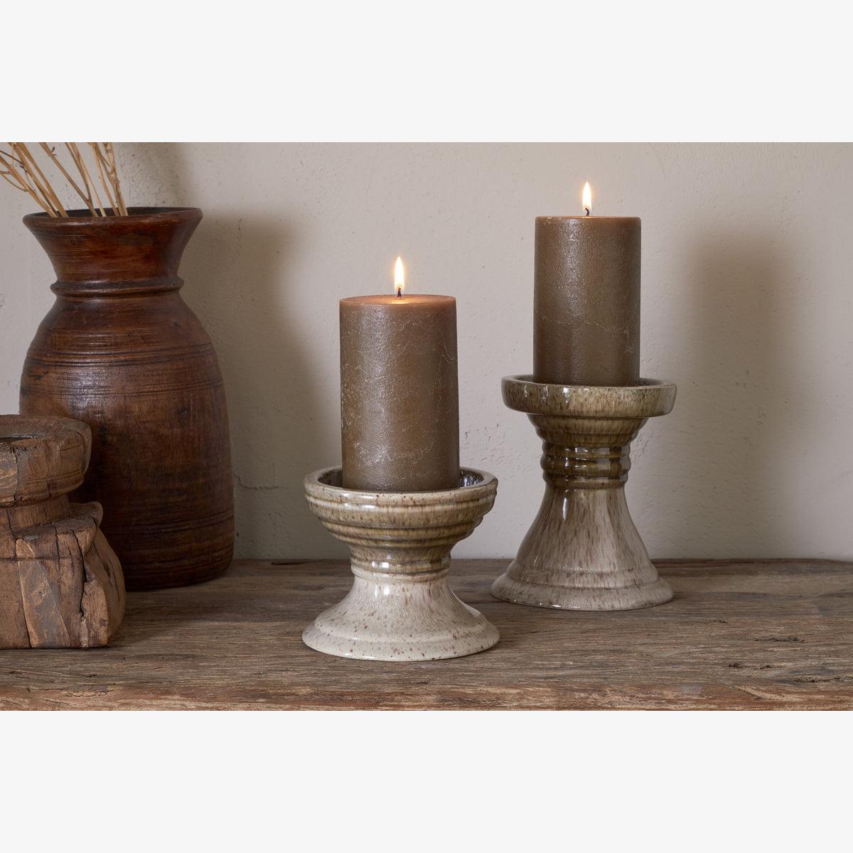 With their clean lines and soft two-tone palette in olive and grey, these pillar candle holders blend effortlessly into any interior setting. The reactive glaze finish adds an organic, rustic character, making each piece subtly unique. Available in two sizes, they can be styled individually or clustered together for a warm, layered look.