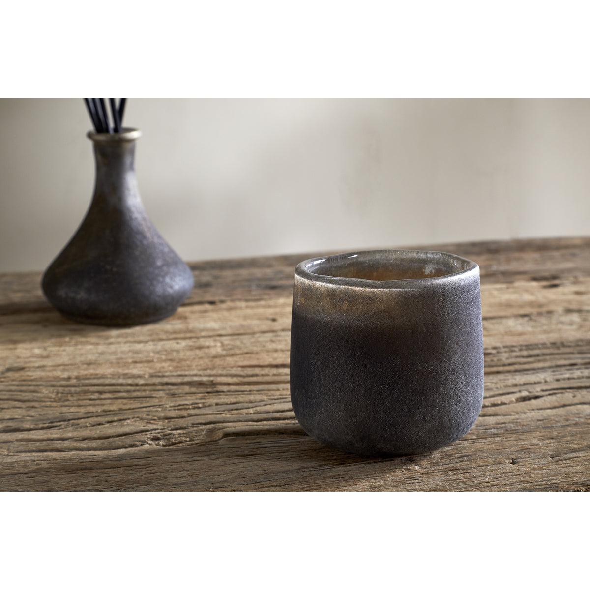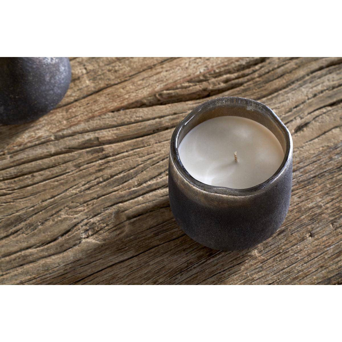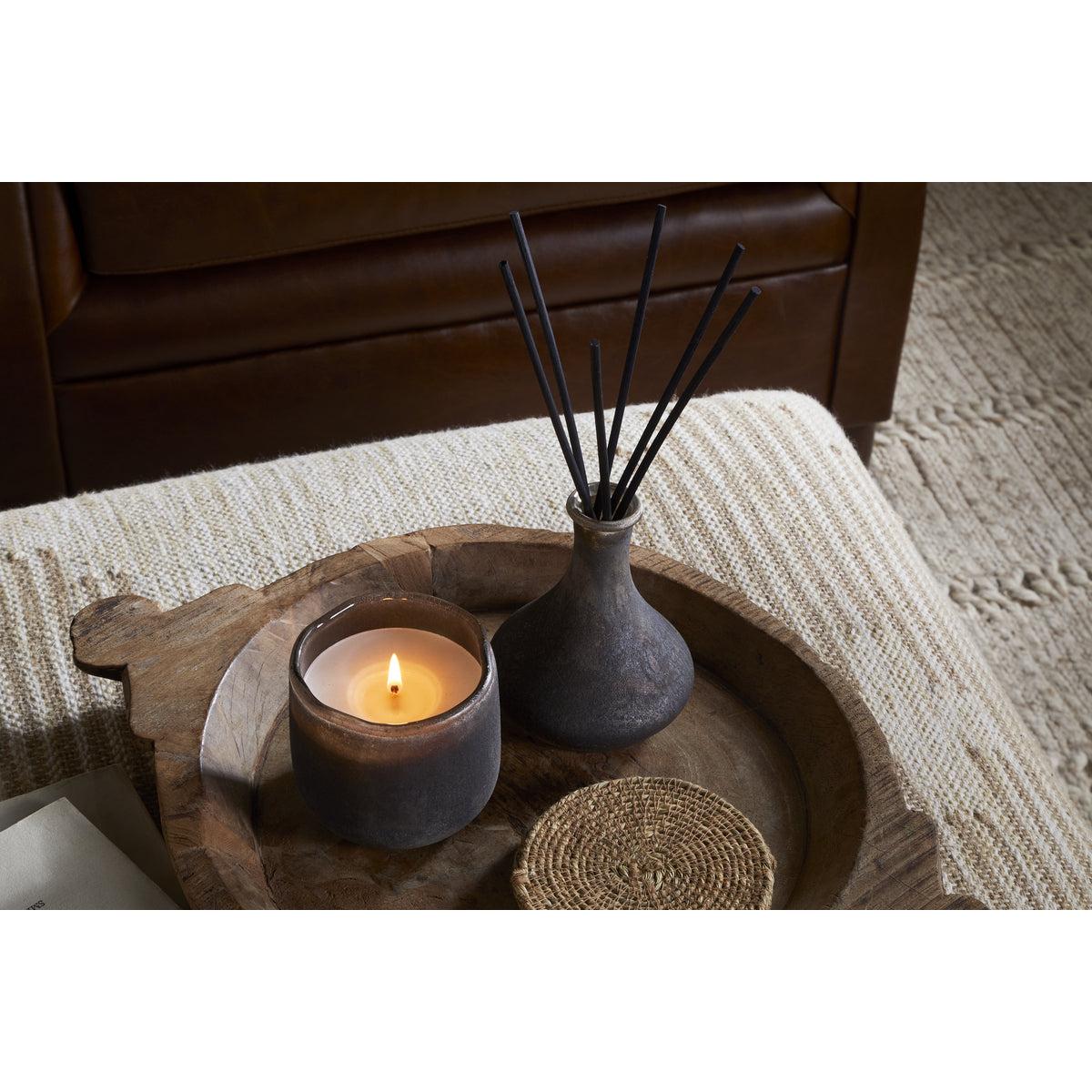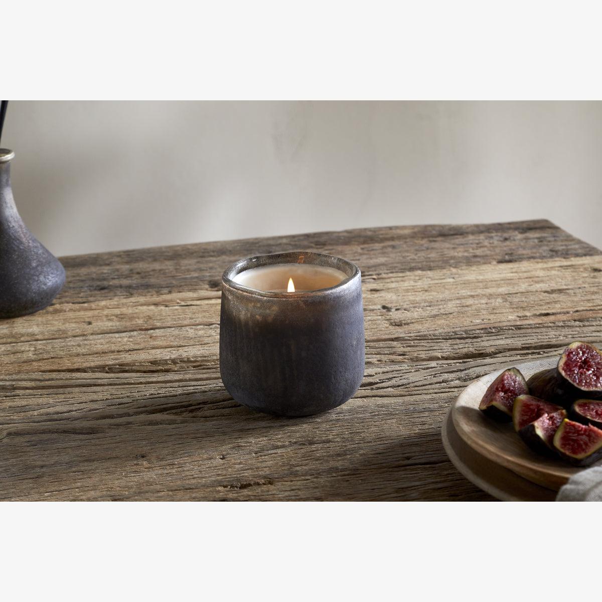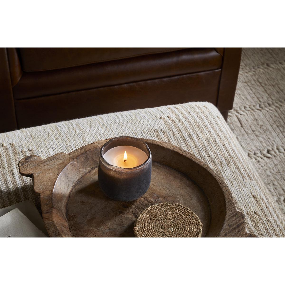 This scented candle is made in the UK by a family-run business, using a bespoke fragrance created exclusively for Nkuku. Woody notes of cedarwood, aromatic smoke, and honeyed fig evoke the warmth and comfort of a crackling fireside. The vessel is finished in one of Nkuku's iconic textured styles and intended to be reused once the candle has burned through.
