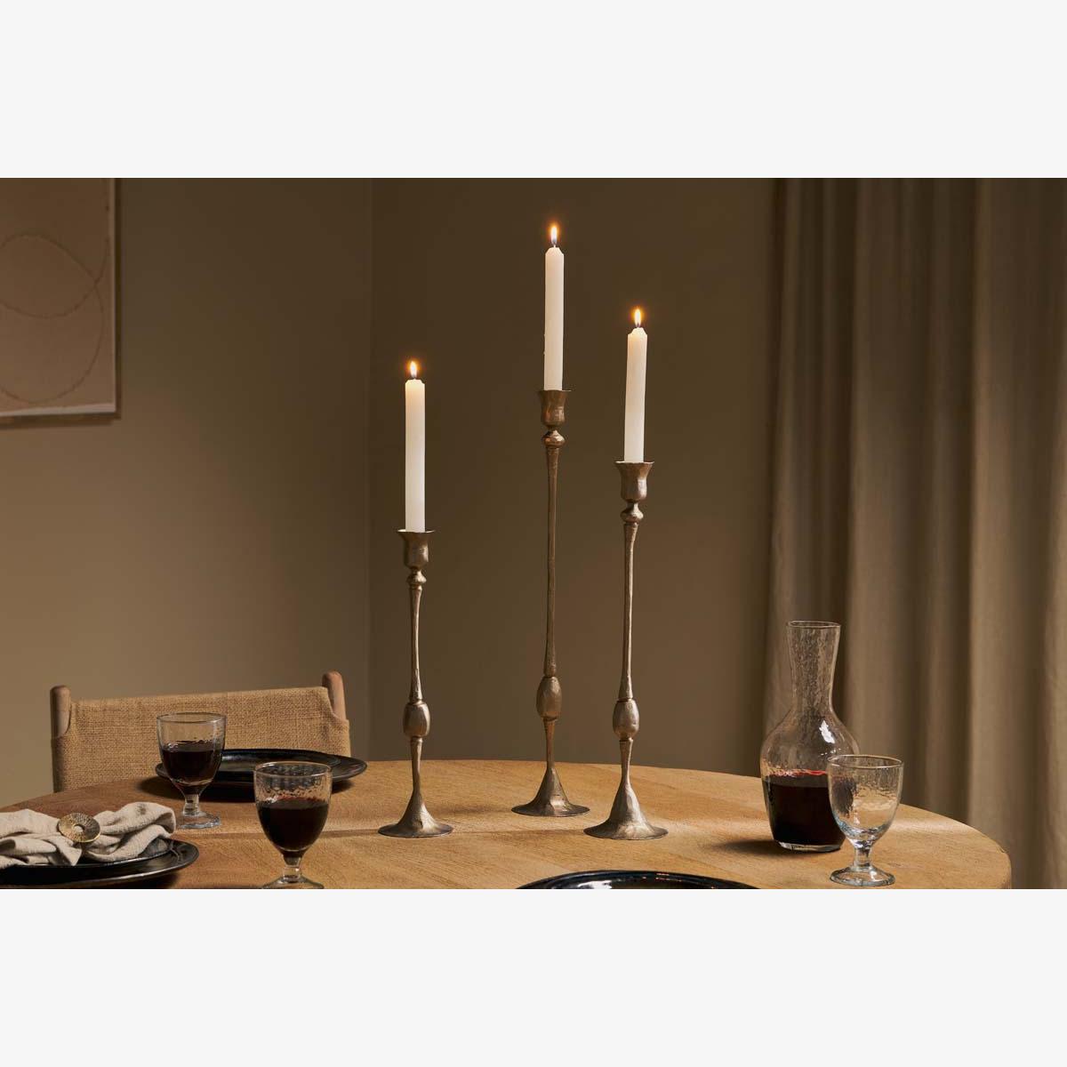 I love this piece for its timeless, antique brass finish, which adds a touch of vintage elegance to any setting. The large size makes it a real statement piece, perfect for centrepieces on dining tables or as a mantel decoration. It works well in both traditional and modern interiors, especially when paired with other Brass or metallic accents. For practical styling, try grouping it with smaller candle holders at varying heights to create visual interest or setting it on a wooden or neutral-toned surface to highlight its warm, antique finish. It’s especially effective in spaces that favour warm lighting or candlelit ambience, adding a cosy yet sophisticated feel.