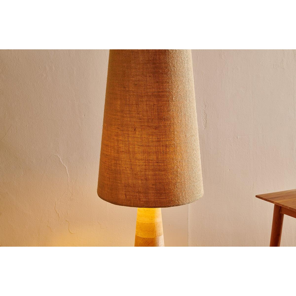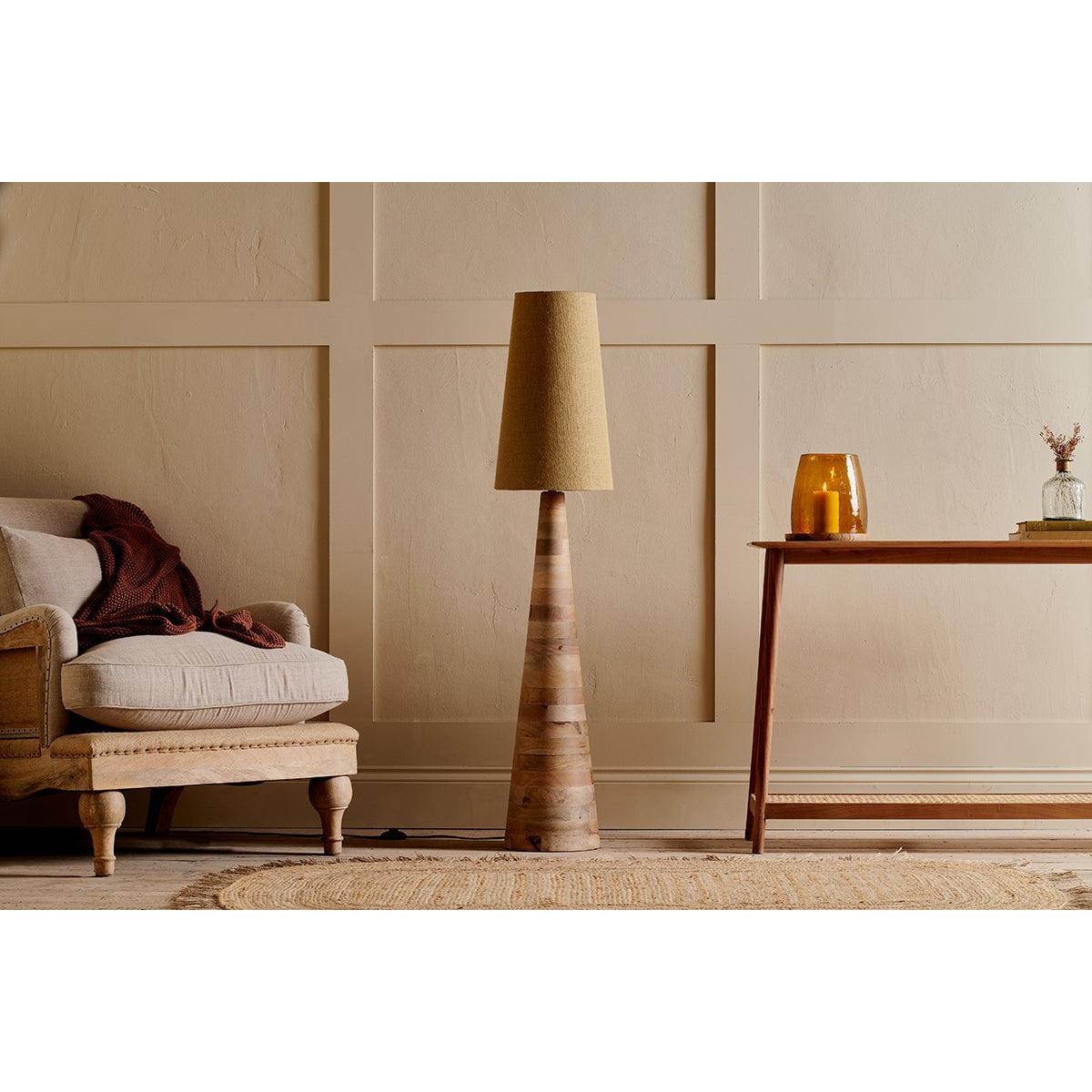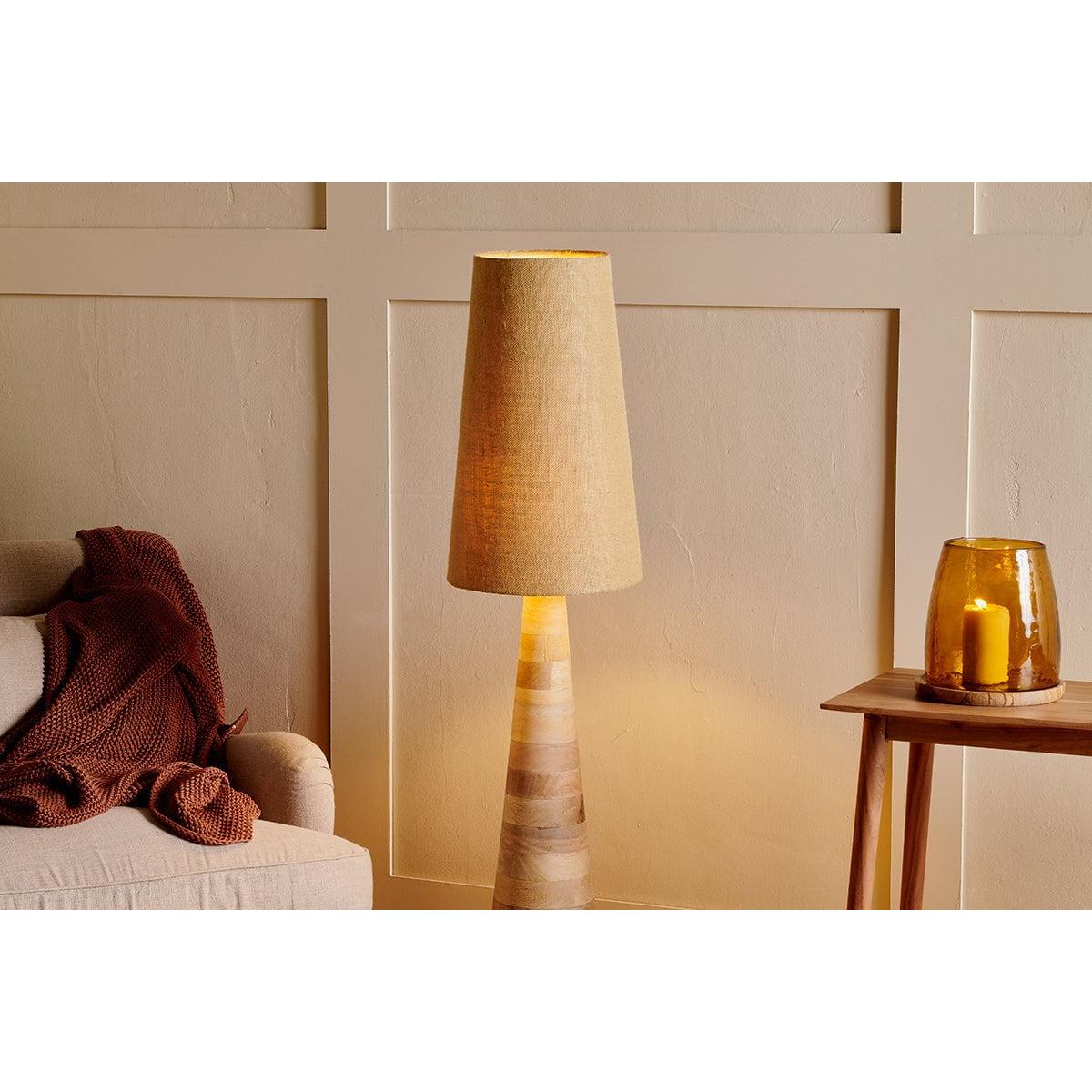 The Chameli floor lamp is the perfect blend of design and sustainability. The intricate patchwork of mango wood pieces makes use of smaller cuttings left over from furniture production. The mango tree is a sustainable crop with a relatively fast growing cycle and they are only harvested once they have stopped bearing fruit. The pieces of wood showcase the individual natural tones of mango wood, creating an interesting natural patina. The cone shape of our Chameli floor lamp feels modern and fresh; the shape complements our dia lampshades perfectly. A floor lamp is a great way to light a dark corner, or book mark the end of a sofa. Bringing natural materials into your home helps creating a calming environment and keeps a connection with a nature.