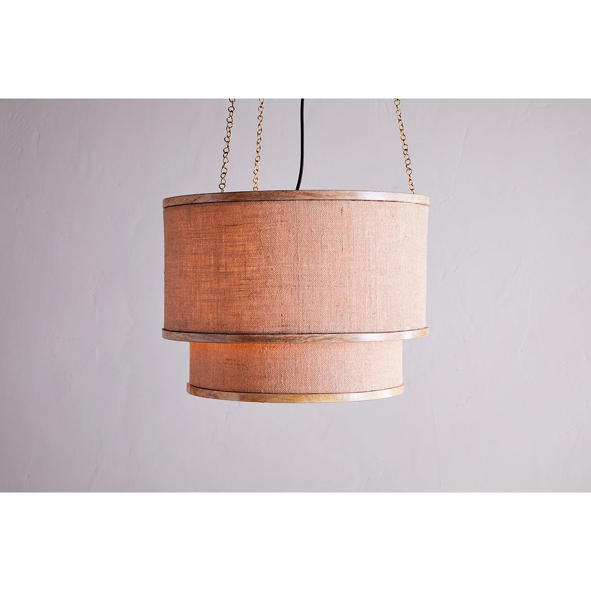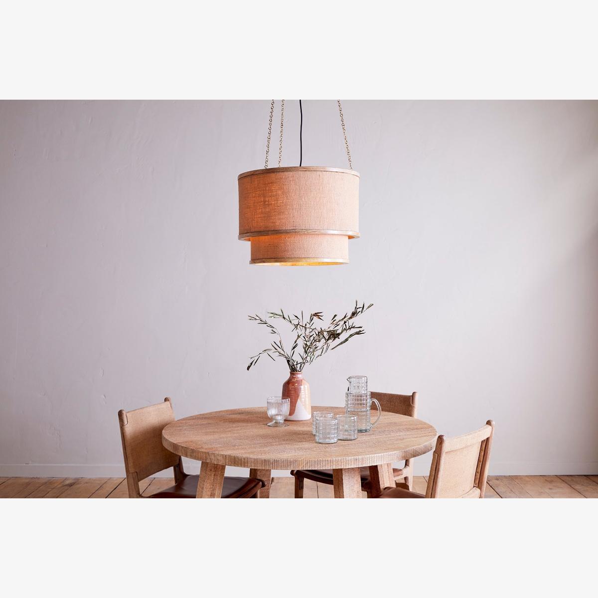 Combining two of our favourite natural materials – and , this statement design brings to mind a rustic country house style. The mix of solid wood frame and woven fabric in complementary neutral tones gives a relaxed, laid-back aesthetic while the silhouette of the two-tiered chandelier creates a focal point that draws the eye. Stunning over a or hung in a lofty or to maximise its effects. When lit, the beautiful mango wood frame reveals the natural beauty of the wood’s grain, while the loose weave of the fabric allows light to diffuse around the room as well as pool beneath. It is colourfast so will not fade over time.