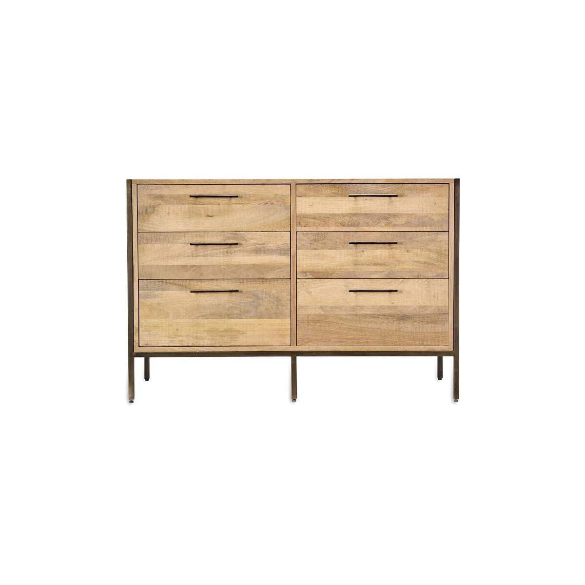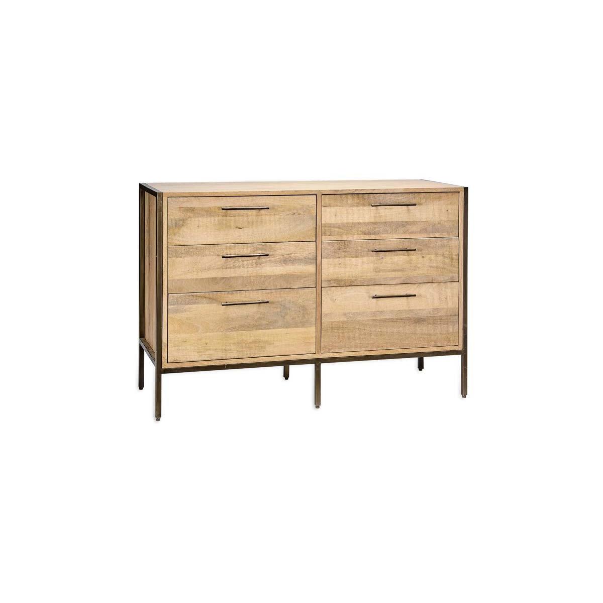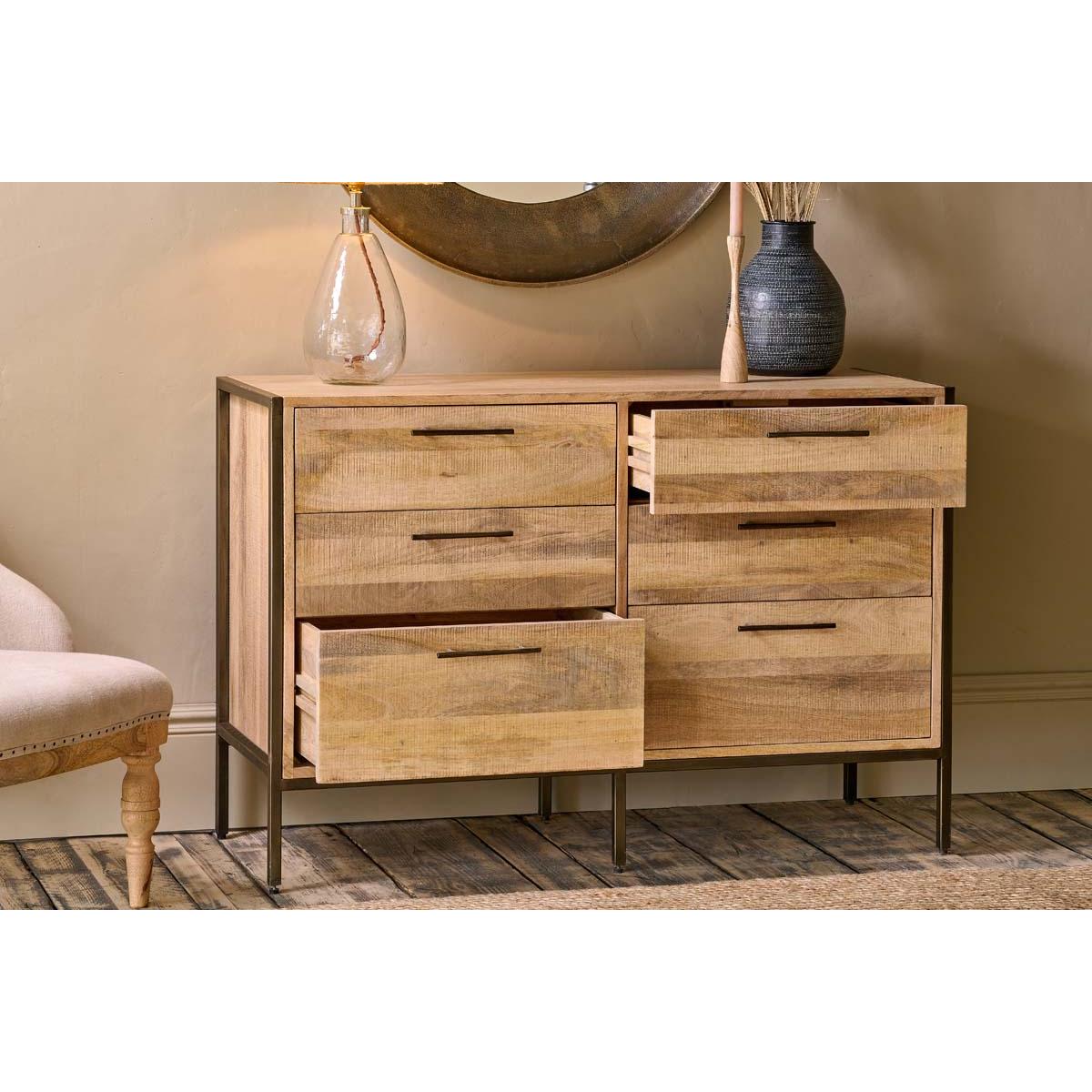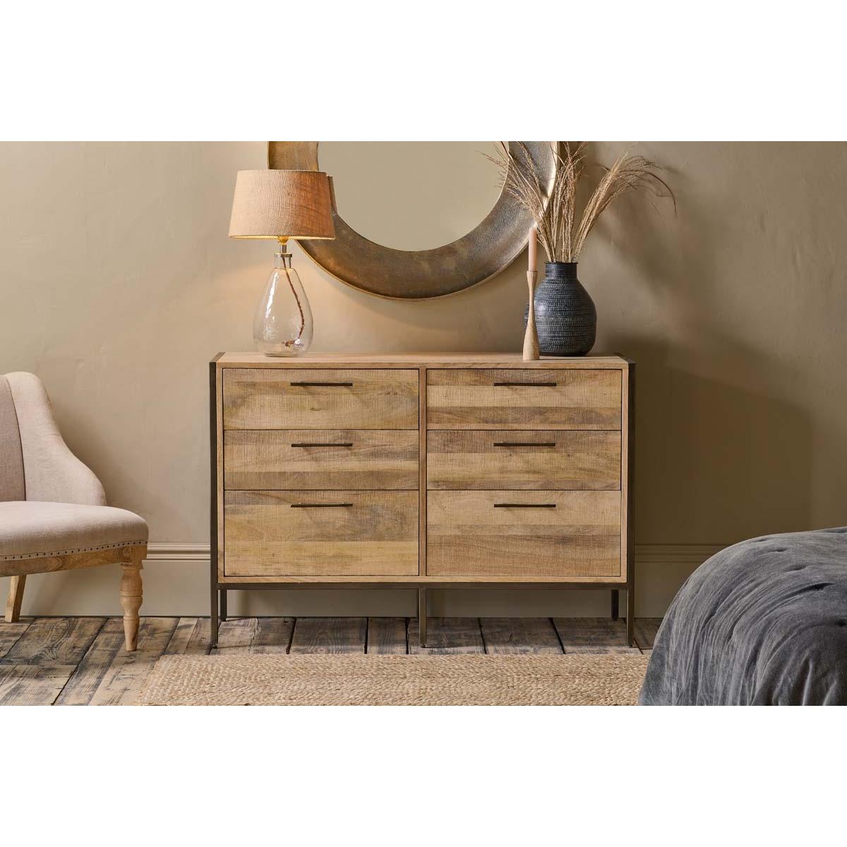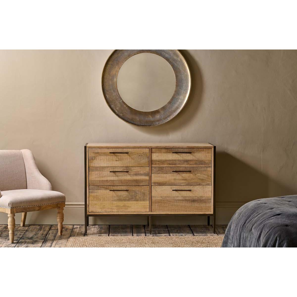 The natural light wood tones of our Dasai mango wood chest of drawers make this a versatile set of drawers that would fit perfectly in a bedroom. The modern design adds a contemporary look with the framework and legs crafted from sturdy iron and the drawer handles have a minimilist rolled bar design. The chest has six practical drawers with plenty of space for clothes. The top of the chest of drawers can be styled with photo frames, a jewellery box and a table lamp for an elegant display. | nkuku Dasai Mango Wood Chest Of Drawers | Bedroom Furniture | Natural