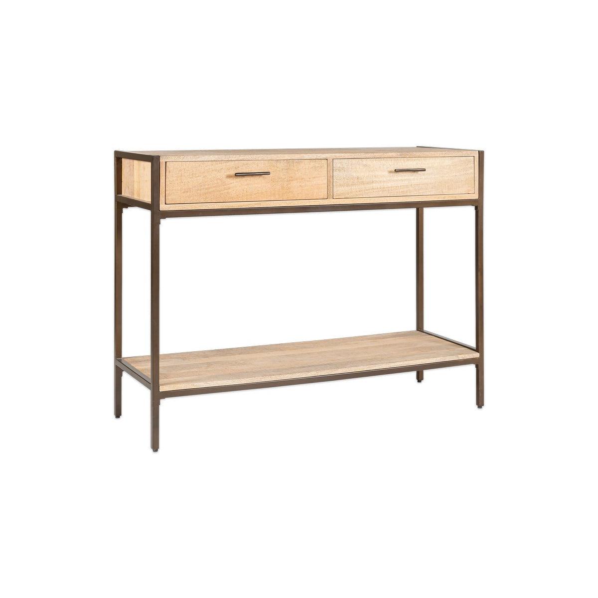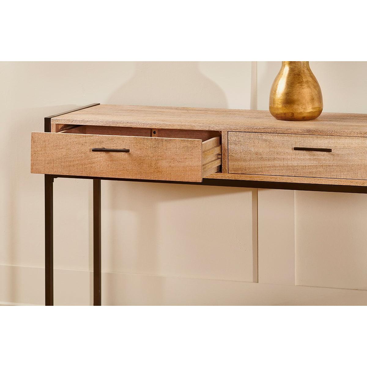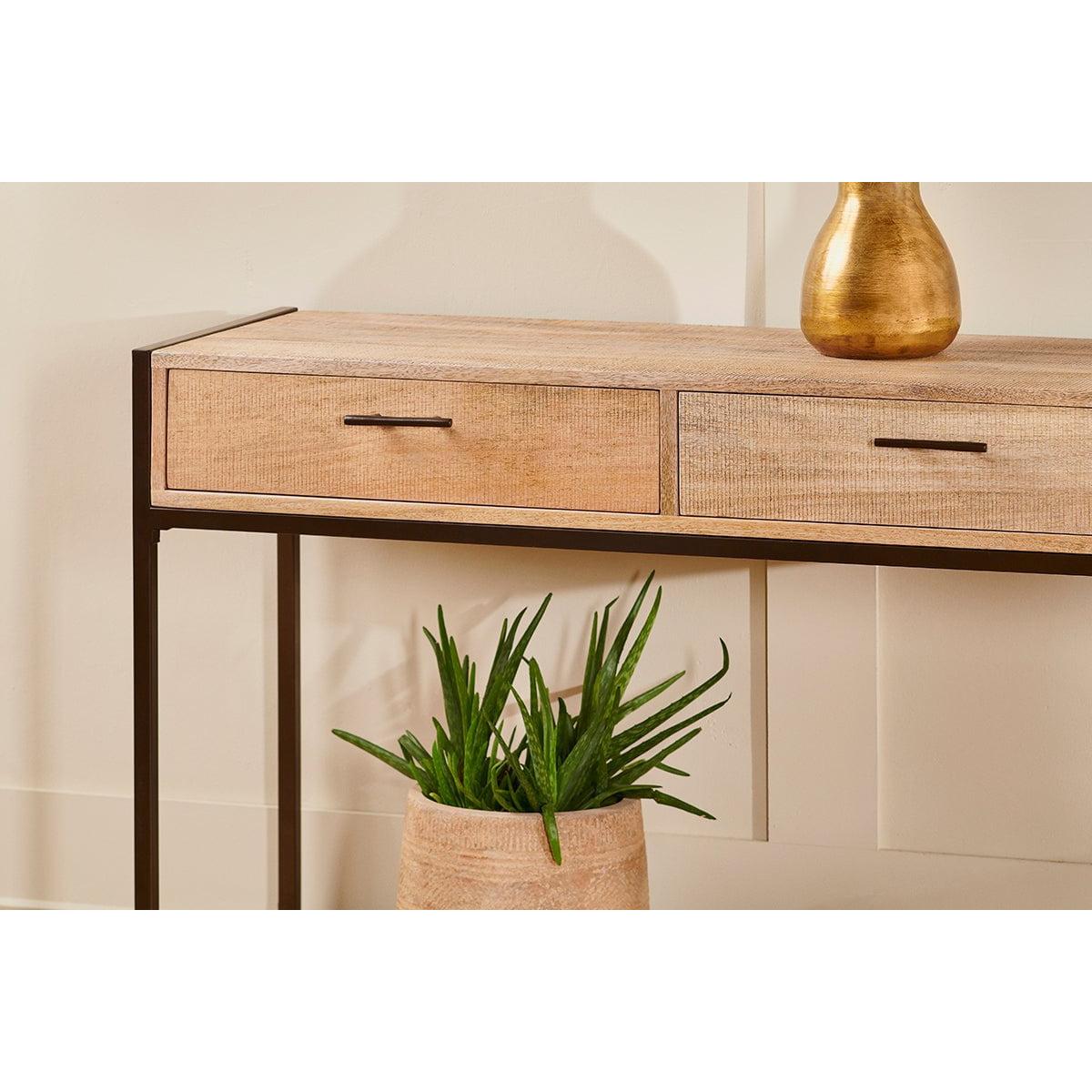 The natural tones of the Dasai wooden console table provide a neutral aesthetic. The piece is crafted from mango wood, a sustainable wood that has an interesting natural grain. The sandblasted finish adds texture and character. The Dasai console has a solid iron framework, that complements the wood and brings a contemporary look to the piece. The practical lower shelf is ideal for storing baskets or objet. The Dasai console table has two drawers that each have a rolled iron bar handle, forged from solid iron using age old techniques. This piece exudes quality and durability.