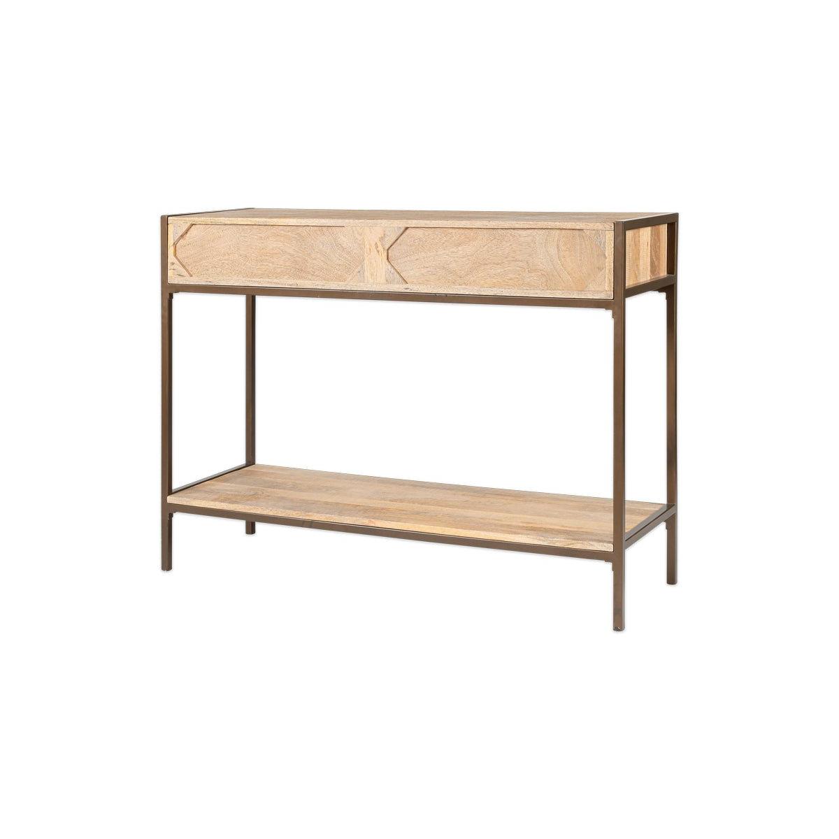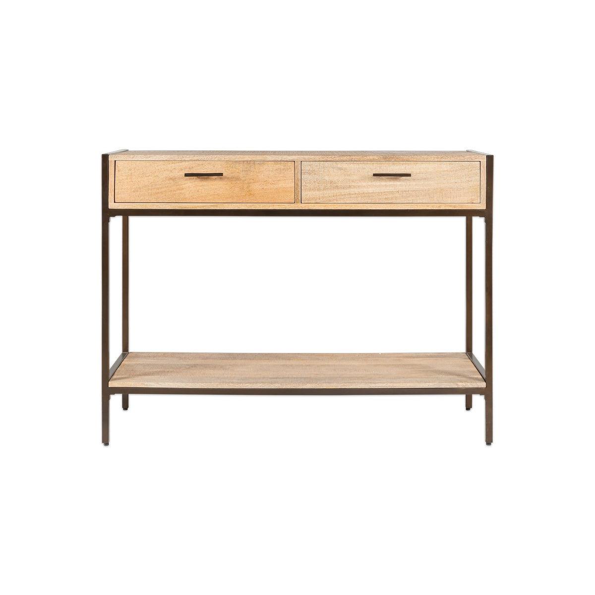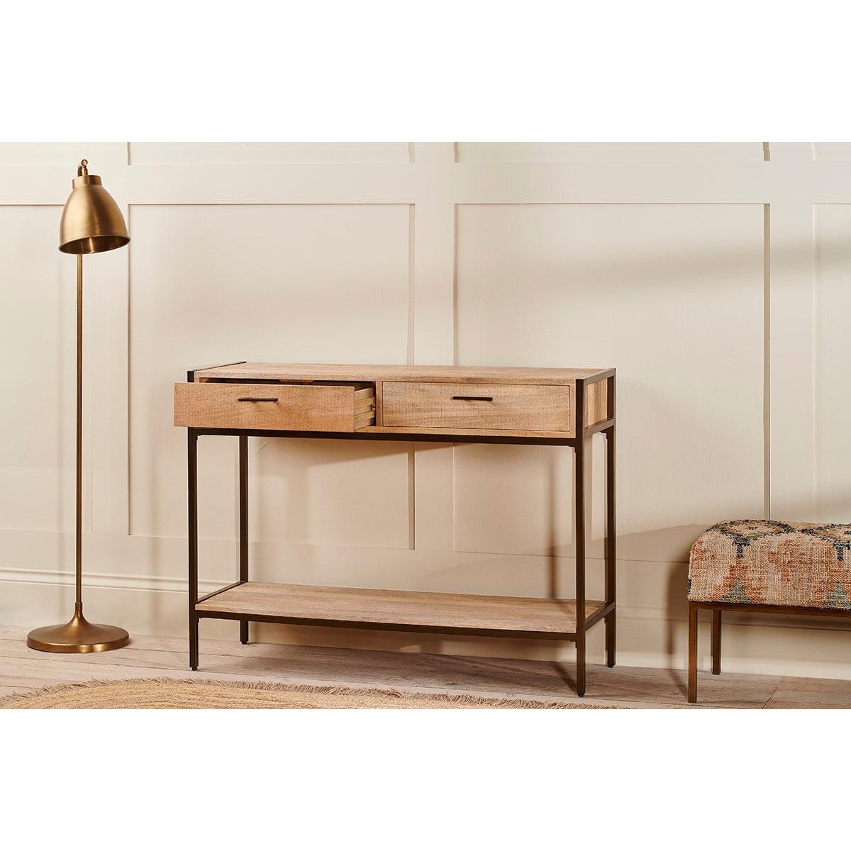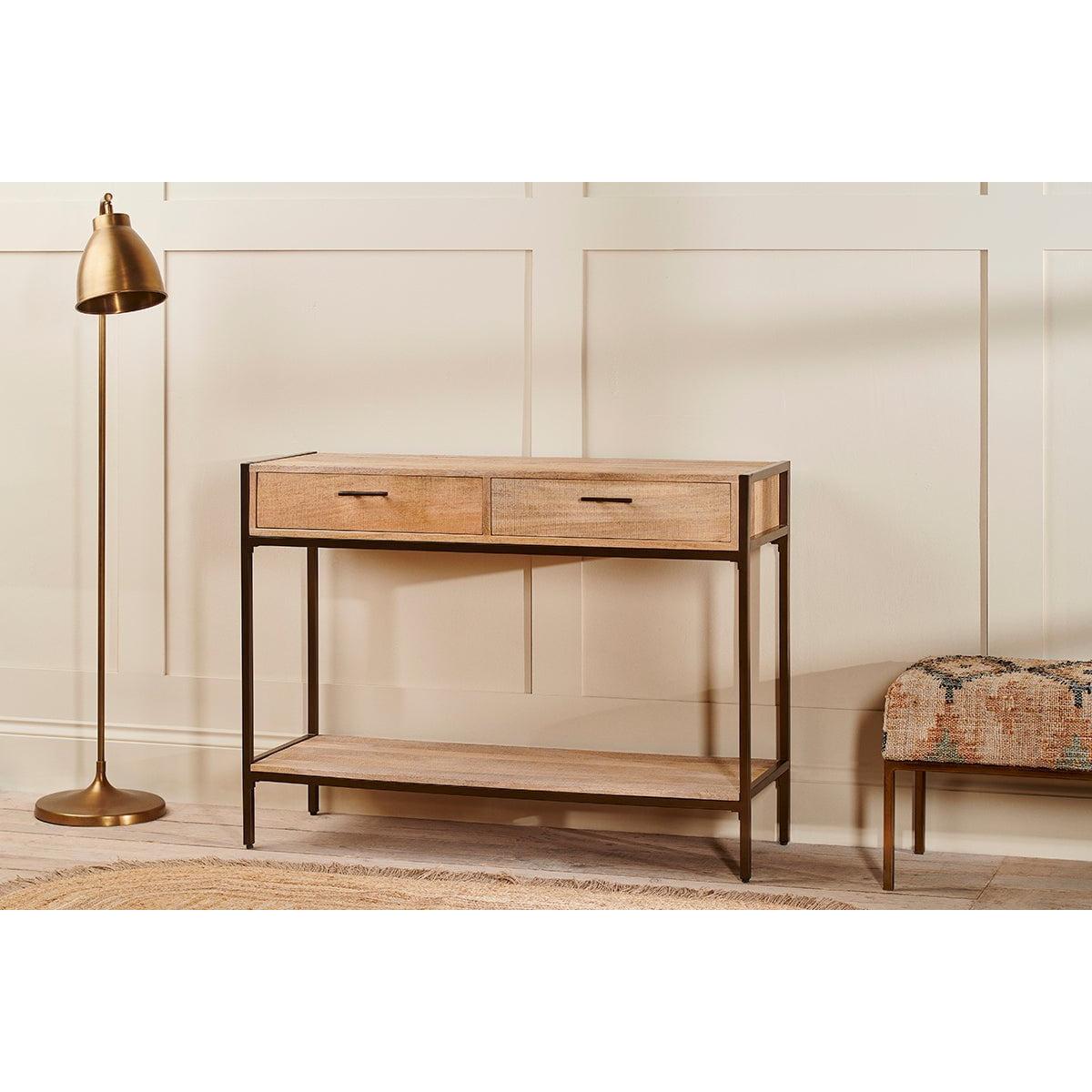 The natural tones of the Dasai wooden console table provide a neutral aesthetic. The piece is crafted from mango wood, a sustainable wood that has an interesting natural grain. The sandblasted finish adds texture and character. The Dasai console has a solid iron framework, that complements the wood and brings a contemporary look to the piece. The practical lower shelf is ideal for storing baskets or objet. The Dasai console table has two drawers that each have a rolled iron bar handle, forged from solid iron using age old techniques. This piece exudes quality and durability.