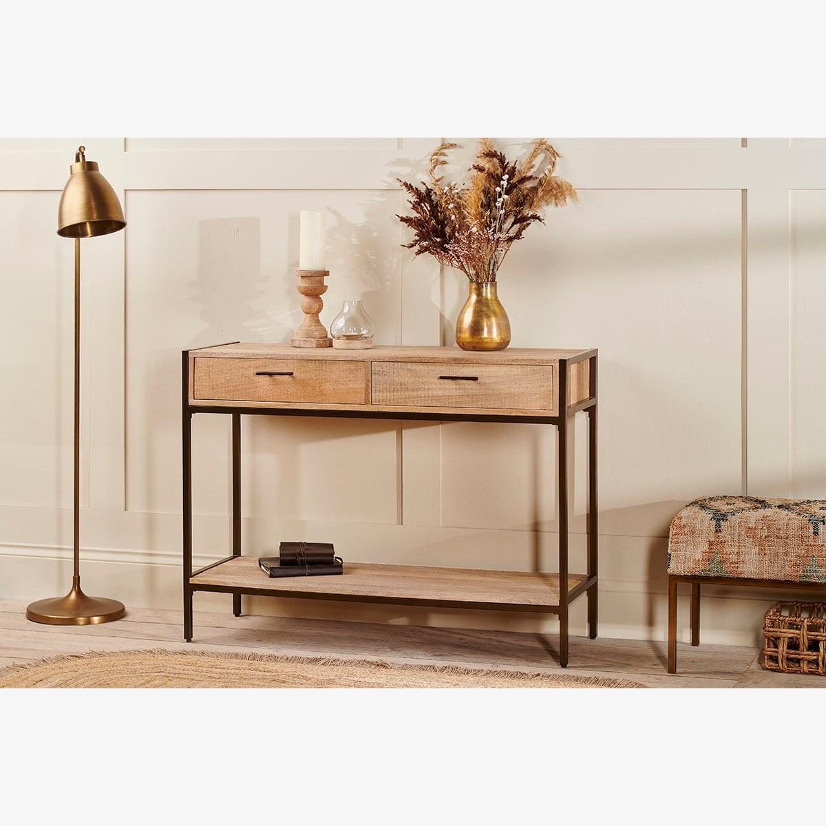 I’m a big fan of this mango wood console thanks to its mix of warm timber and slim metal frame, which makes it equally at home in modern industrial settings or more relaxed Scandi-style halls. The two shallow drawers and open shelf below are perfect for corralling mail or showcasing a few favourite coffee-table books without looking cluttered. For styling, I’d hang a simple round mirror or lean a large print above to add height, then layer a small table lamp, a sculptural vase with fresh or dried foliage and a neat stack of books on the top. On the lower shelf, try a woven basket for scarves and gloves or a couple of baskets in complementary colours to keep everything tidy.
