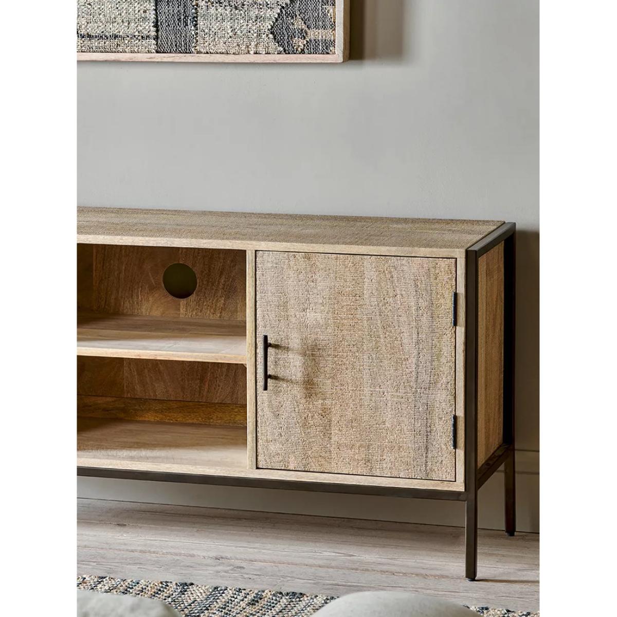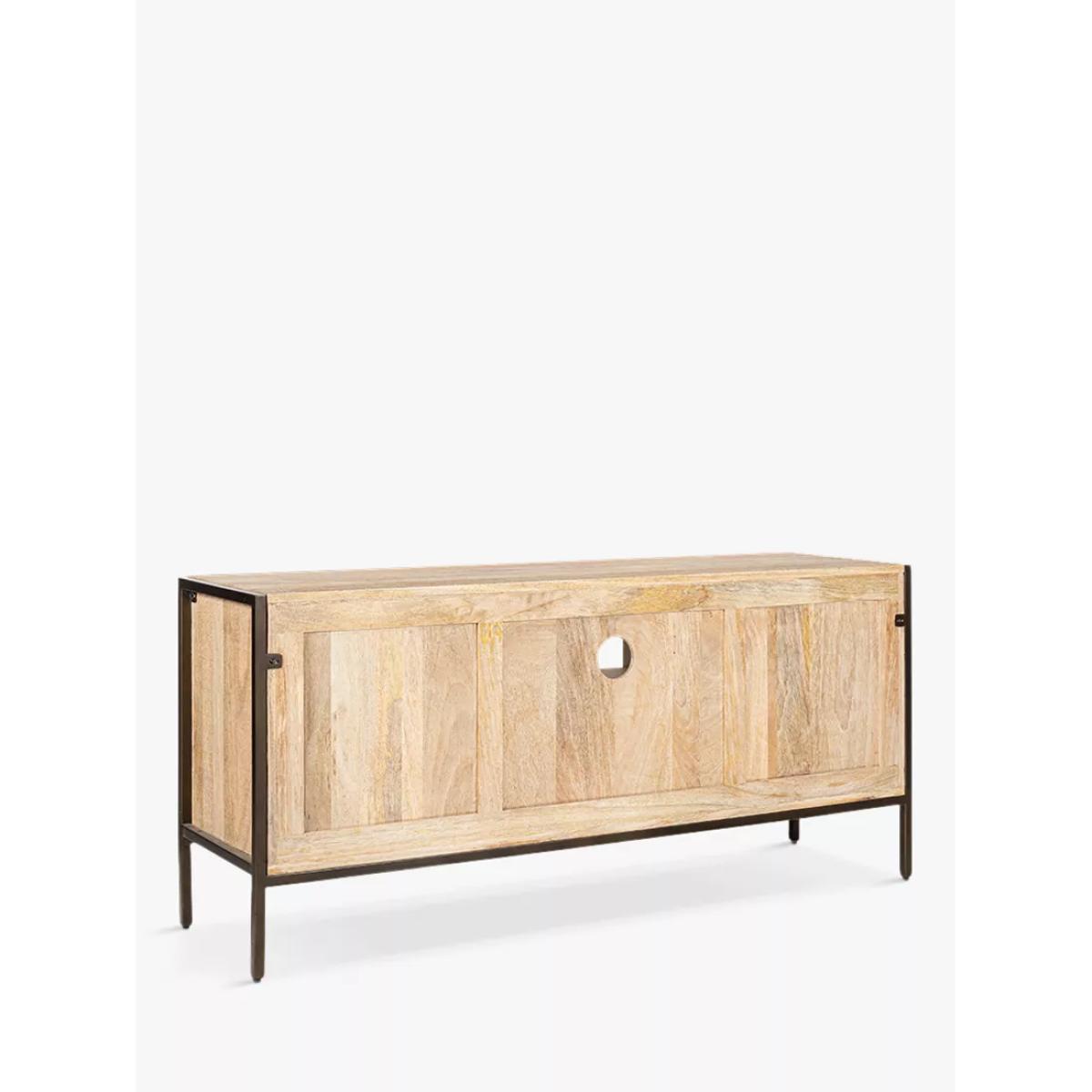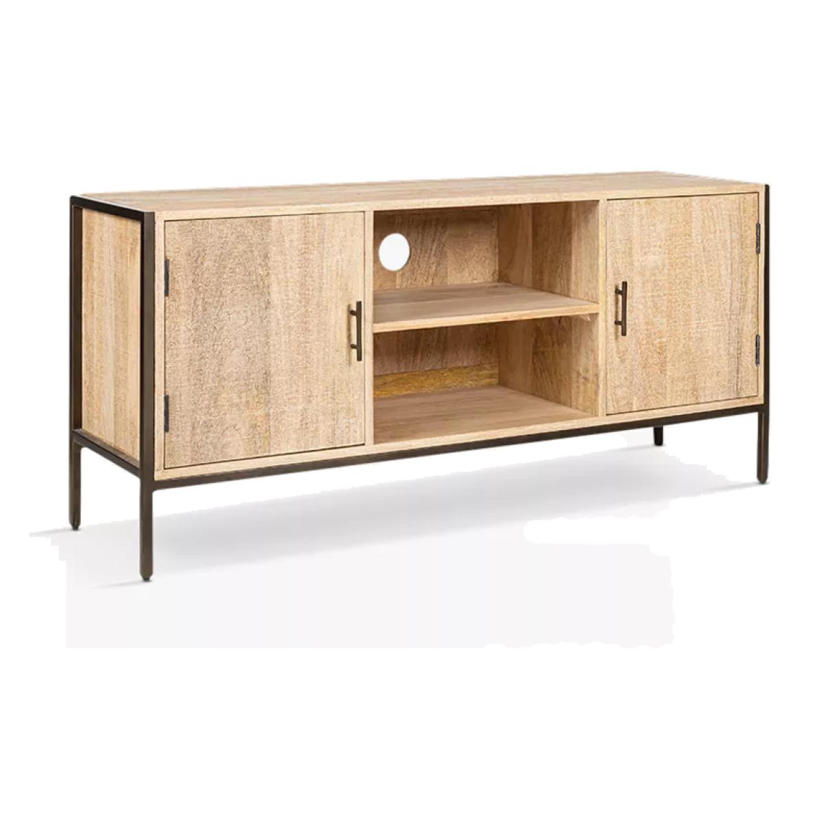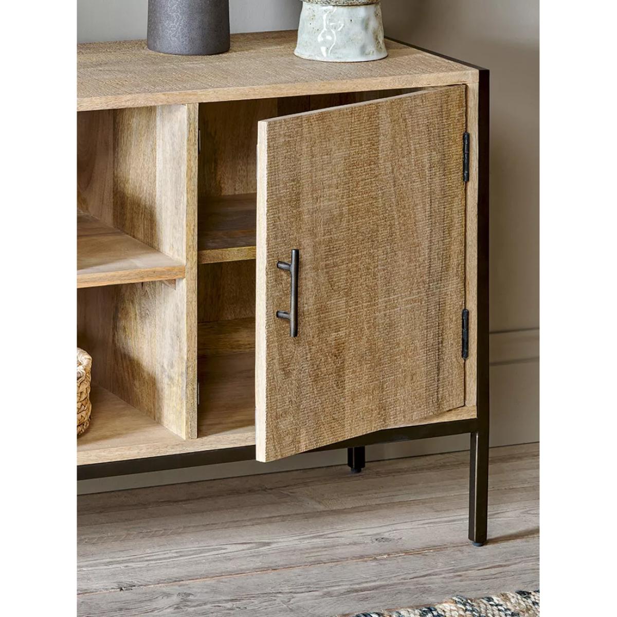 Part of Nkuku's functional Dasai Collection, this media unit will keep wires, consoles, hubs and controls neatly arranged and out of sight, while looking effortlessly stylish in any living space. It's constructed from sustainable mango wood and sand-blasted for added texture to complement the natural grain while contrasting the dark finish of the solid iron framework. Each cupboard has simple iron handles and comes with a single shelf centrally and on each side. This timeless piece works well as a conventional sideboard but has also been designed as a practical home entertainment console with a discreet access point for cables and plugs.