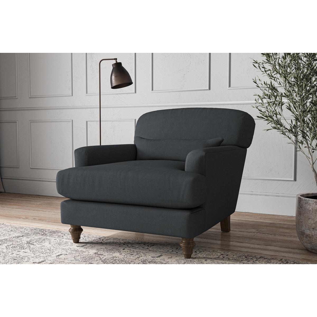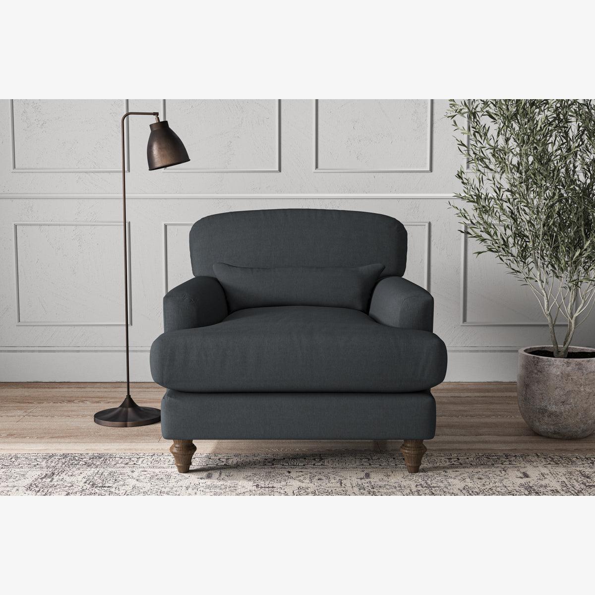 Our Deni armchair is generously proportioned with deep, sumptuous seat cushions for luxurious comfort. Handcrafted from a solid hardwood frame with high-grade steel serpentine springs and foam and fibre wrap filling, this timeless collection celebrates the best of British quality and design. Fine details include in-built back cushions, hand-turned hardwood feet and a separate lumbar cushion for added comfort. Our upholstery fabrics are chosen for their style and quality, where all fabrics are FR treated for domestic upholstery ensuring peace of mind as well as meeting specialist UK furniture requirements. Our curated colour palette offers a variety of sophisticated muted shades. Please note, our white background cut-out photography is shown in Natural for shape and style reference. Fabric Swatch Ordering We recommend ordering fabric swatches before placing your order, giving you the chance to feel the fabric and see your colour choices within your own home. You can order up to 6 free fabric swatches by clicking here. Before placing your order, it's important to take the time to measure the space you intend to place your made-to-order furniture to ensure it fits properly. You can read more in our Sofa Buying Guide.