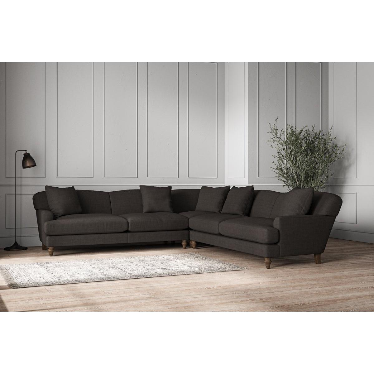 Our Deni grand corner sofa is generously proportioned with deep, sumptuous seat cushions for luxurious comfort. Handcrafted from a solid hardwood frame with high-grade steel serpentine springs and foam and fibre wrap filling, this timeless collection celebrates the best of British quality and design. Fine details include in-built back cushions, hand-turned hardwood feet and a set of five scatter cushions for added comfort. Our upholstery fabrics are sourced from Italy’s finest mills and are chosen for their style and quality. We have selected a beautiful heavyweight, soft washed linen with an outstanding texture. Our linen is perfectly suited to upholstery, with an appealing natural, and tactile feel. It is also heavy and durable. The linen is FR treated for domestic upholstery ensuring peace of mind as well as meeting specialist UK furniture requirements. Our curated colour palette offers a variety of 11 sophisticated muted shades. Please note, our white background cut-out photography is shown in Natural for shape and style reference. Fabric Swatch Ordering We recommend ordering fabric swatches before placing your order, giving you the chance to feel the fabric and see your colour choices within your own home. You can order up to 6 free fabric swatches by clicking here. Before placing your order, it's important to take the time to measure the space you intend to place your made-to-order furniture to ensure it fits properly. You can read more in our Sofa Buying Guide.