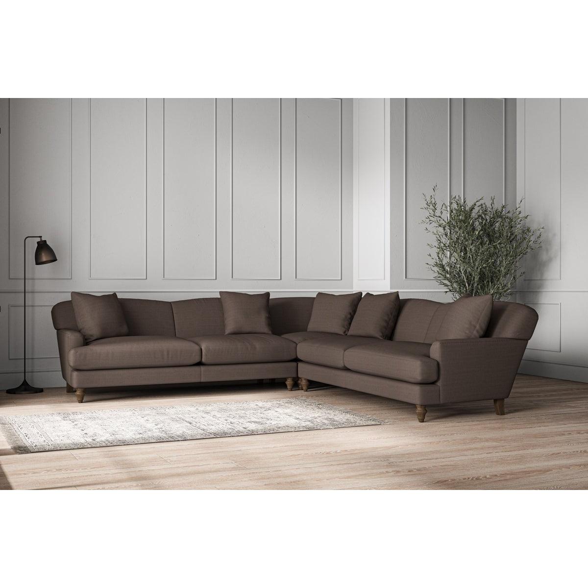 Our Deni grand corner sofa is generously proportioned with deep, sumptuous seat cushions for luxurious comfort. Handcrafted from a solid hardwood frame with high-grade steel serpentine springs and foam and fibre wrap filling, this timeless collection celebrates the best of British quality and design. Fine details include in-built back cushions, hand-turned hardwood feet and a set of five scatter cushions for added comfort. Our upholstery fabrics are chosen for their style and quality, where all fabrics are FR treated for domestic upholstery ensuring peace of mind as well as meeting specialist UK furniture requirements. Our curated colour palette offers a variety of sophisticated muted shades. Please note, our white background cut-out photography is shown in Natural for shape and style reference. Fabric Swatch Ordering We recommend ordering fabric swatches before placing your order, giving you the chance to feel the fabric and see your colour choices within your own home. You can order up to 6 free fabric swatches by clicking here. Before placing your order, it's important to take the time to measure the space you intend to place your made-to-order furniture to ensure it fits properly. You can read more in our Sofa Buying Guide.