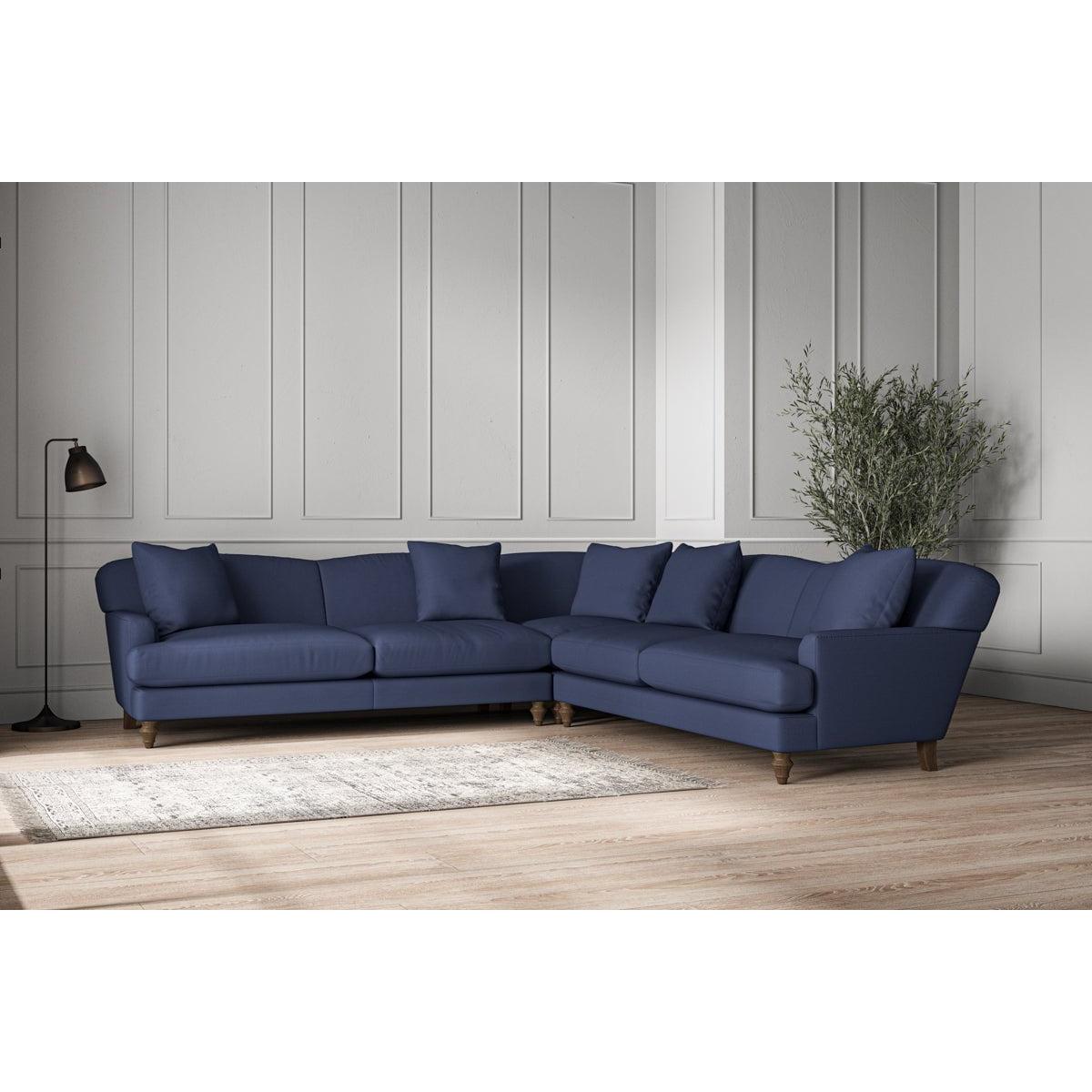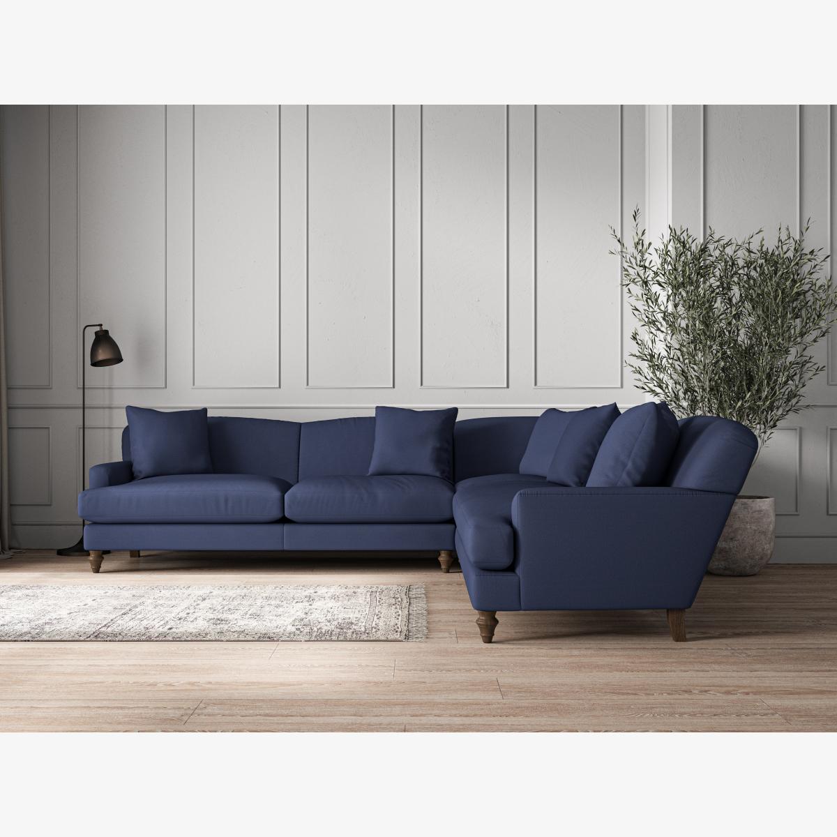 Our Deni grand corner sofa is generously proportioned with deep, sumptuous seat cushions for luxurious comfort. Handcrafted from a solid hardwood frame with high-grade steel serpentine springs and foam and fibre wrap filling, this timeless collection celebrates the best of British quality and design. Fine details include in-built back cushions, hand-turned hardwood feet and a set of five scatter cushions for added comfort. Our upholstery fabrics are chosen for their style and quality, where all fabrics are FR treated for domestic upholstery ensuring peace of mind as well as meeting specialist UK furniture requirements. Our curated colour palette offers a variety of sophisticated muted shades. Please note, our white background cut-out photography is shown in Natural for shape and style reference. Fabric Swatch Ordering We recommend ordering fabric swatches before placing your order, giving you the chance to feel the fabric and see your colour choices within your own home. You can order up to 6 free fabric swatches by clicking here. Before placing your order, it's important to take the time to measure the space you intend to place your made-to-order furniture to ensure it fits properly. You can read more in our Sofa Buying Guide.