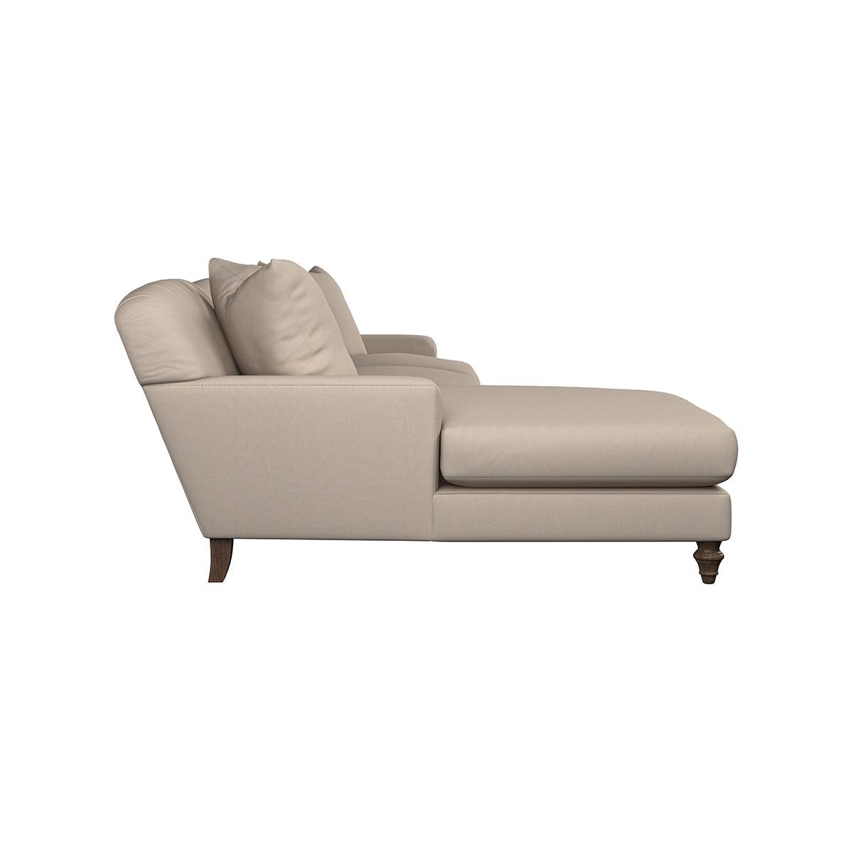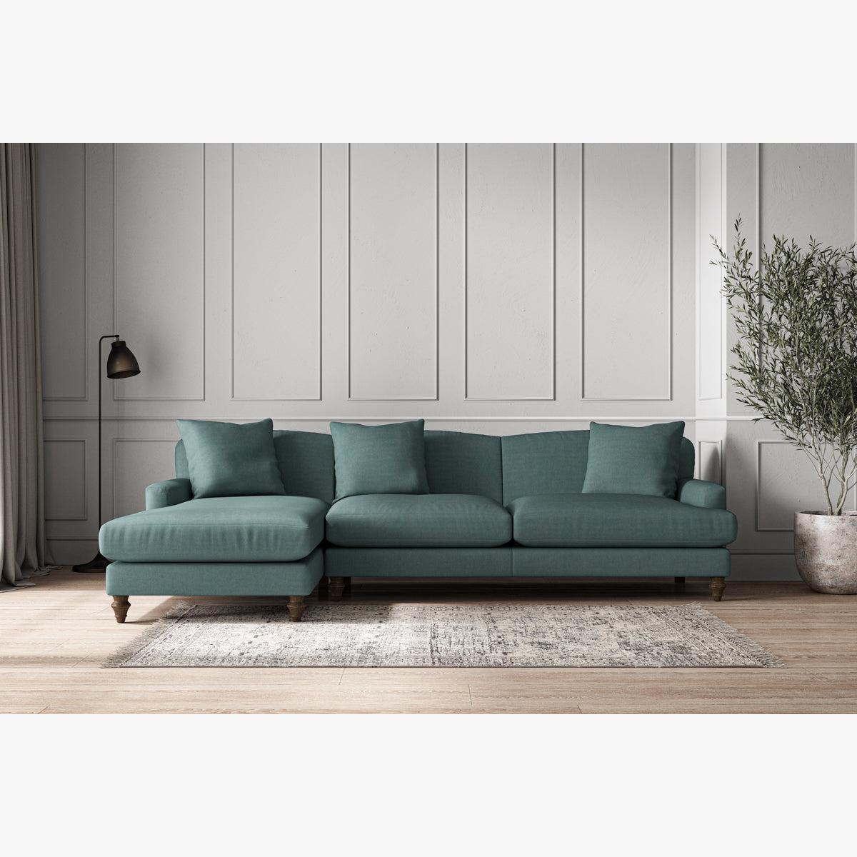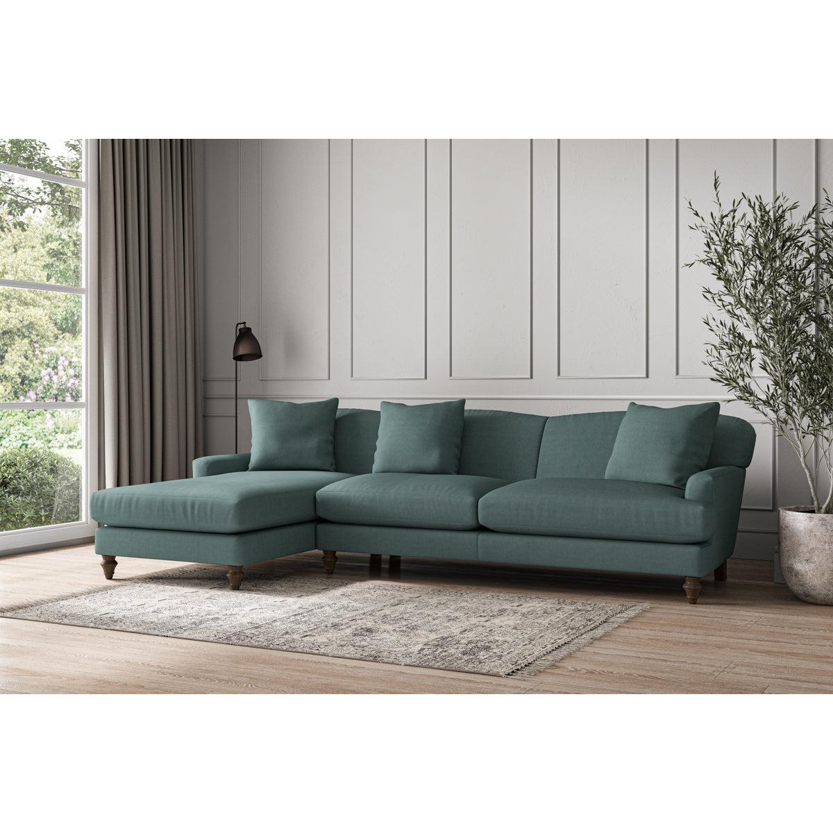 Our Deni grand left hand chaise sofa is generously proportioned with deep, sumptuous seat cushions for luxurious comfort. Handcrafted from a solid hardwood frame with high-grade steel serpentine springs and foam and fibre wrap filling, this timeless collection celebrates the best of British quality and design. Fine details include in-built back cushions, hand-turned hardwood feet and a set of three scatter cushions for added comfort. Our upholstery fabrics are chosen for their style and quality, where all fabrics are FR treated for domestic upholstery ensuring peace of mind as well as meeting specialist UK furniture requirements. Our curated colour palette offers a variety of sophisticated muted shades. Please note, our white background cut-out photography is shown in Natural for shape and style reference. Fabric Swatch Ordering We recommend ordering fabric swatches before placing your order, giving you the chance to feel the fabric and see your colour choices within your own home. You can order up to 6 free fabric swatches by clicking here. Before placing your order, it's important to take the time to measure the space you intend to place your made-to-order furniture to ensure it fits properly. You can read more in our Sofa Buying Guide.