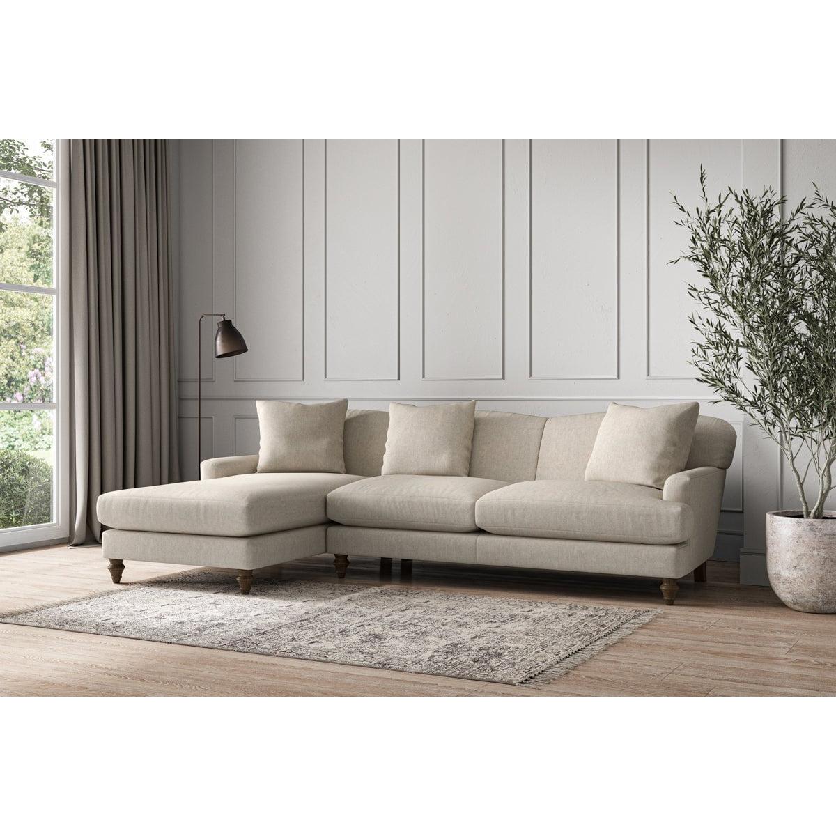 Our Deni large left hand chaise sofa is generously proportioned with deep, sumptuous seat cushions for luxurious comfort. Handcrafted from a solid hardwood frame with high-grade steel serpentine springs and foam and fibre wrap filling, this timeless collection celebrates the best of British quality and design. Fine details include in-built back cushions, hand-turned hardwood feet and a set of three scatter cushions for added comfort. Our upholstery fabrics are sourced from Italy’s finest mills and are chosen for their style and quality. We have selected a beautiful heavyweight, soft washed linen with an outstanding texture. Our linen is perfectly suited to upholstery, with an appealing natural, and tactile feel. It is also heavy and durable. The linen is FR treated for domestic upholstery ensuring peace of mind as well as meeting specialist UK furniture requirements. Our curated colour palette offers a variety of 11 sophisticated muted shades. Please note, our white background cut-out photography is shown in Natural for shape and style reference. Fabric Swatch OrderingWe recommend ordering fabric swatches before placing your order, giving you the chance to feel the fabric and see your colour choices within your own home. You can order up to 6 free fabric swatches by clicking here. it fit?Before placing your order, it's important to take the time to measure the space you intend to place your made-to-order furniture to ensure it fits properly. You can read more in our Sofa Buying Guide.