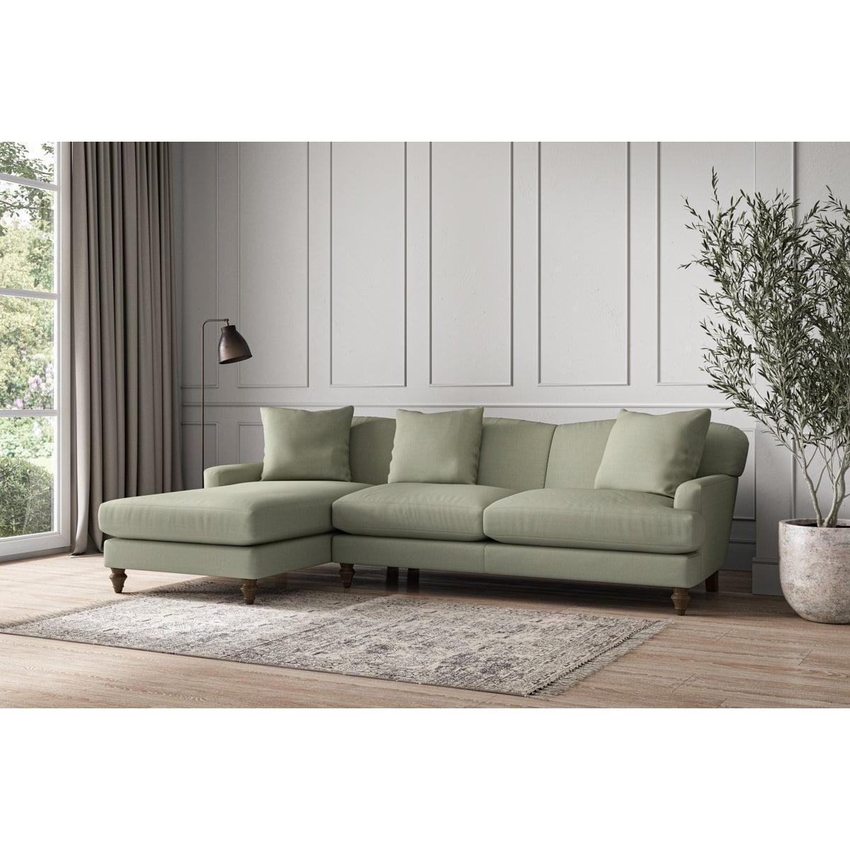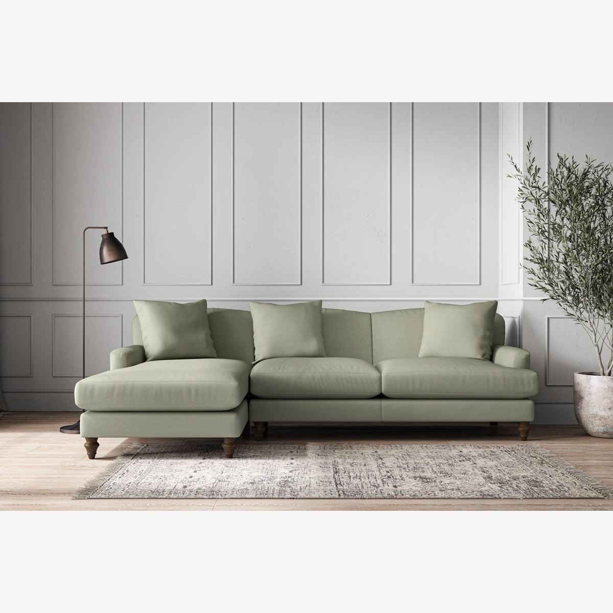 Our Deni large left hand chaise sofa is generously proportioned with deep, sumptuous seat cushions for luxurious comfort. Handcrafted from a solid hardwood frame with high-grade steel serpentine springs and foam and fibre wrap filling, this timeless collection celebrates the best of British quality and design. Fine details include in-built back cushions, hand-turned hardwood feet and a set of three scatter cushions for added comfort. Our upholstery fabrics are chosen for their style and quality, where all fabrics are FR treated for domestic upholstery ensuring peace of mind as well as meeting specialist UK furniture requirements. Our curated colour palette offers a variety of sophisticated muted shades. Please note, our white background cut-out photography is shown in Natural for shape and style reference. Fabric Swatch Ordering We recommend ordering fabric swatches before placing your order, giving you the chance to feel the fabric and see your colour choices within your own home. You can order up to 6 free fabric swatches by clicking here. Will it fit? Before placing your order, it's important to take the time to measure the space you intend to place your made-to-order furniture to ensure it fits properly. You can read more in our You can read more in our Sofa Buying Guide.