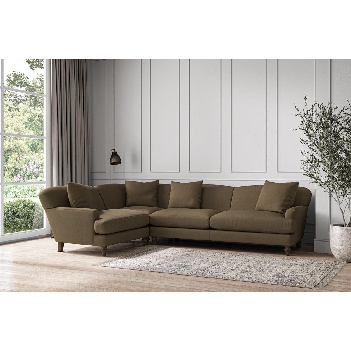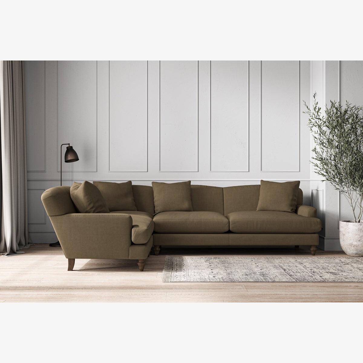 Our Deni grand left hand corner sofa is generously proportioned with deep, sumptuous seat cushions for luxurious comfort. Handcrafted from a solid hardwood frame with high-grade steel serpentine springs and foam and fibre wrap filling, this timeless collection celebrates the best of British quality and design. Fine details include in-built back cushions, hand-turned hardwood feet and a set of four scatter cushions for added comfort. Our upholstery fabrics are sourced from Italy’s finest mills and are chosen for their style and quality. We have selected a beautiful heavyweight, soft washed linen with an outstanding texture. Our linen is perfectly suited to upholstery, with an appealing natural, and tactile feel. It is also heavy and durable. The linen is FR treated for domestic upholstery ensuring peace of mind as well as meeting specialist UK furniture requirements. Our curated colour palette offers a variety of 11 sophisticated muted shades. Please note, our white background cut-out photography is shown in Natural for shape and style reference. Fabric Swatch Ordering We recommend ordering fabric swatches before placing your order, giving you the chance to feel the fabric and see your colour choices within your own home. You can order up to 6 free fabric swatches by clicking here. Before placing your order, it's important to take the time to measure the space you intend to place your made-to-order furniture to ensure it fits properly. You can read more in our Sofa Buying Guide.