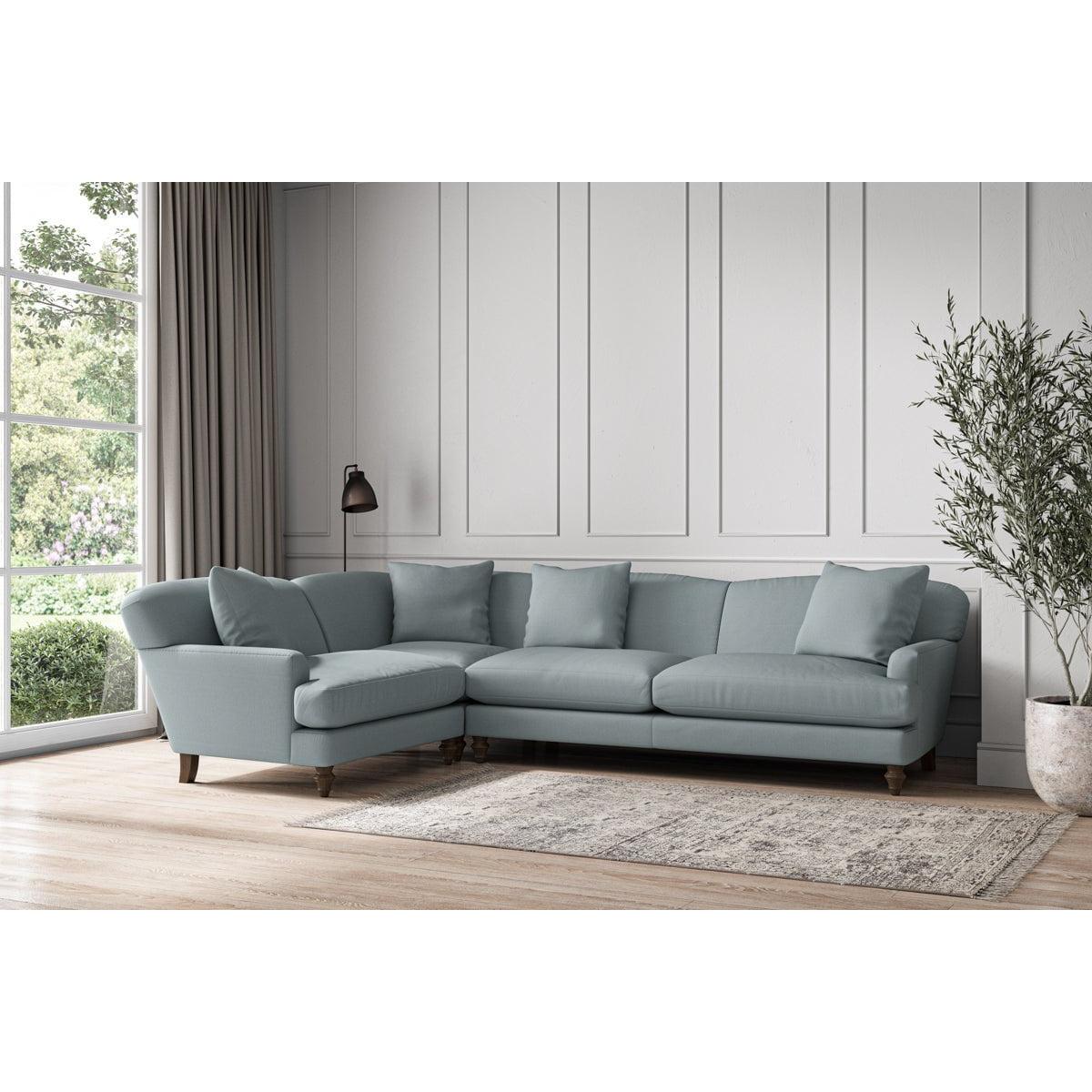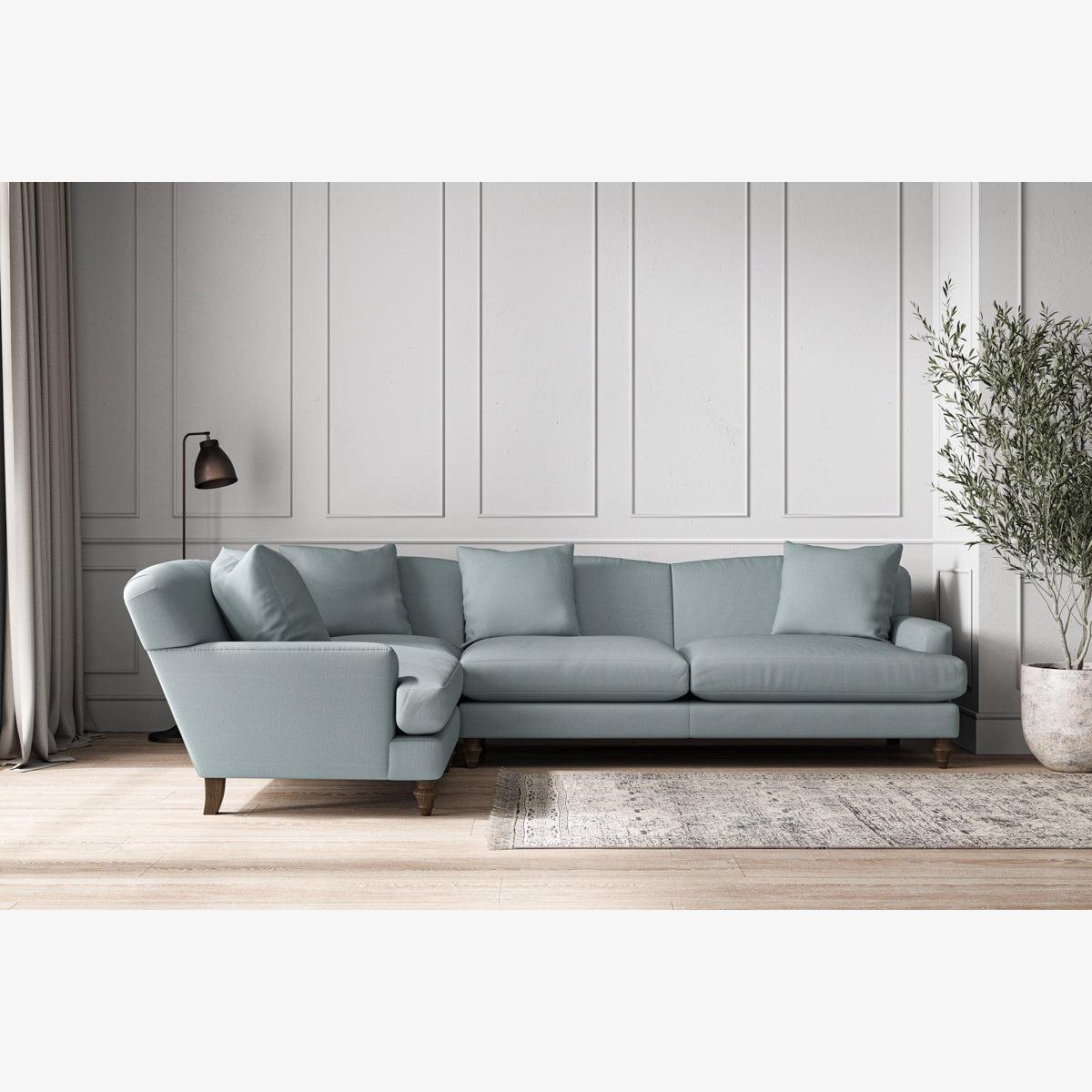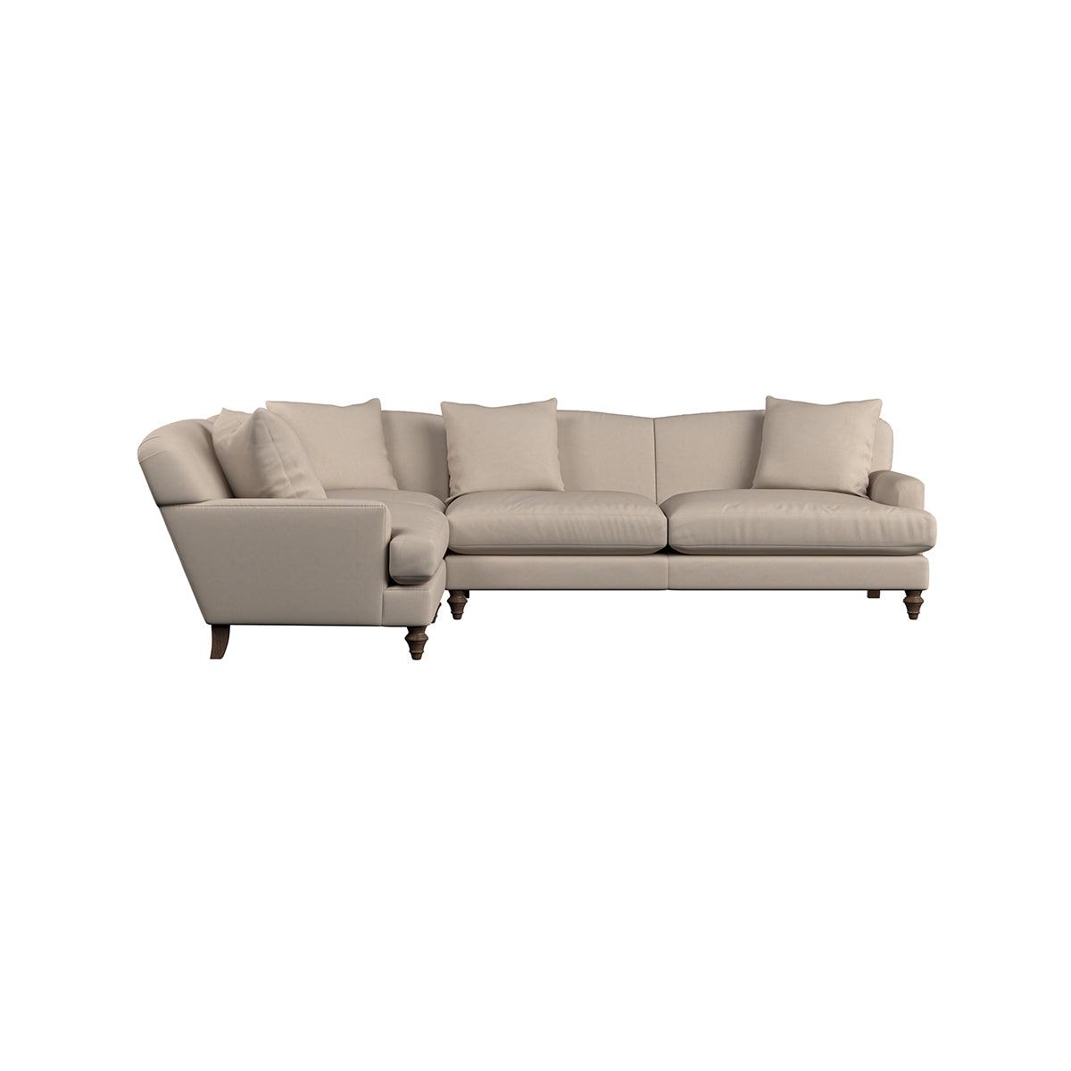 Our Deni grand left hand corner sofa is generously proportioned with deep, sumptuous seat cushions for luxurious comfort. Handcrafted from a solid hardwood frame with high-grade steel serpentine springs and foam and fibre wrap filling, this timeless collection celebrates the best of British quality and design. Fine details include in-built back cushions, hand-turned hardwood feet and a set of four scatter cushions for added comfort. Our upholstery fabrics are chosen for their style and quality, where all fabrics are FR treated for domestic upholstery ensuring peace of mind as well as meeting specialist UK furniture requirements. Our curated colour palette offers a variety of sophisticated muted shades. Please note, our white background cut-out photography is shown in Natural for shape and style reference. Fabric Swatch Ordering We recommend ordering fabric swatches before placing your order, giving you the chance to feel the fabric and see your colour choices within your own home. You can order up to 6 free fabric swatches by clicking here. Before placing your order, it's important to take the time to measure the space you intend to place your made-to-order furniture to ensure it fits properly. You can read more in our Sofa Buying Guide.