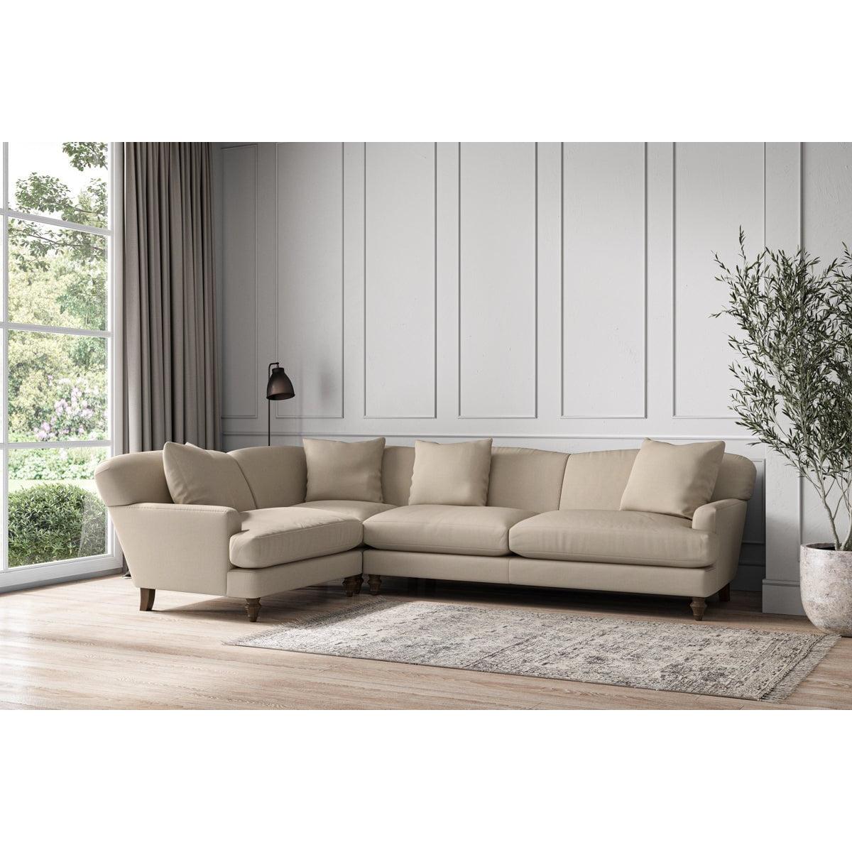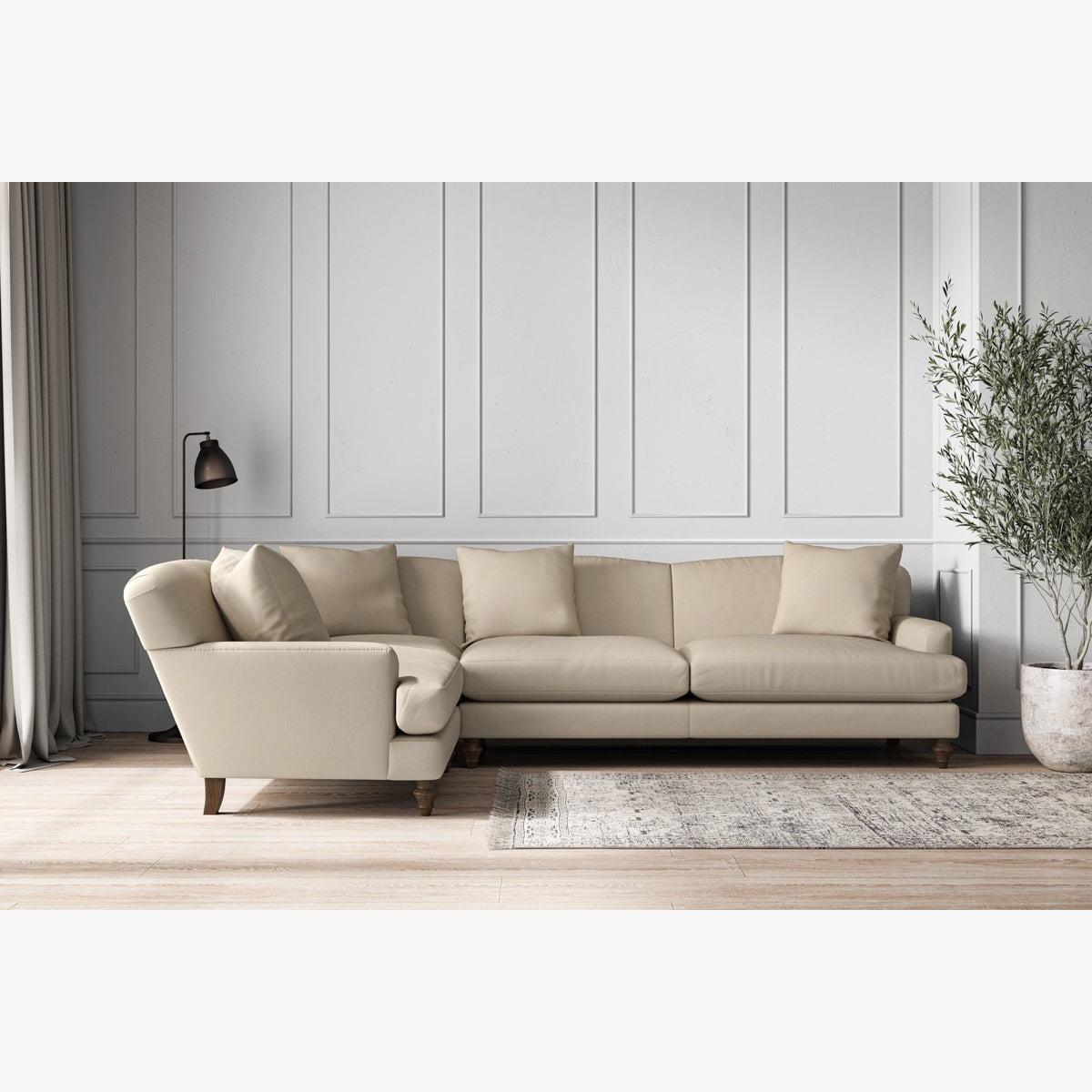 Our Deni grand left hand corner sofa is generously proportioned with deep, sumptuous seat cushions for luxurious comfort. Handcrafted from a solid hardwood frame with high-grade steel serpentine springs and foam and fibre wrap filling, this timeless collection celebrates the best of British quality and design. Fine details include in-built back cushions, hand-turned hardwood feet and a set of four scatter cushions for added comfort. Our upholstery fabrics are chosen for their style and quality, where all fabrics are FR treated for domestic upholstery ensuring peace of mind as well as meeting specialist UK furniture requirements. Our curated colour palette offers a variety of sophisticated muted shades. Please note, our white background cut-out photography is shown in Natural for shape and style reference. Fabric Swatch Ordering We recommend ordering fabric swatches before placing your order, giving you the chance to feel the fabric and see your colour choices within your own home. You can order up to 6 free fabric swatches by clicking here. Before placing your order, it's important to take the time to measure the space you intend to place your made-to-order furniture to ensure it fits properly. You can read more in our Sofa Buying Guide.