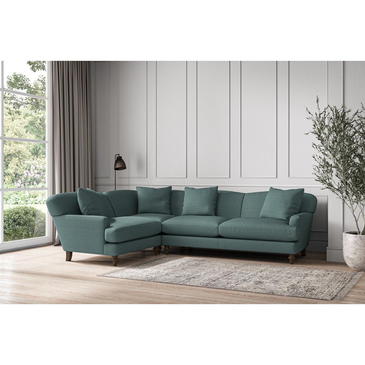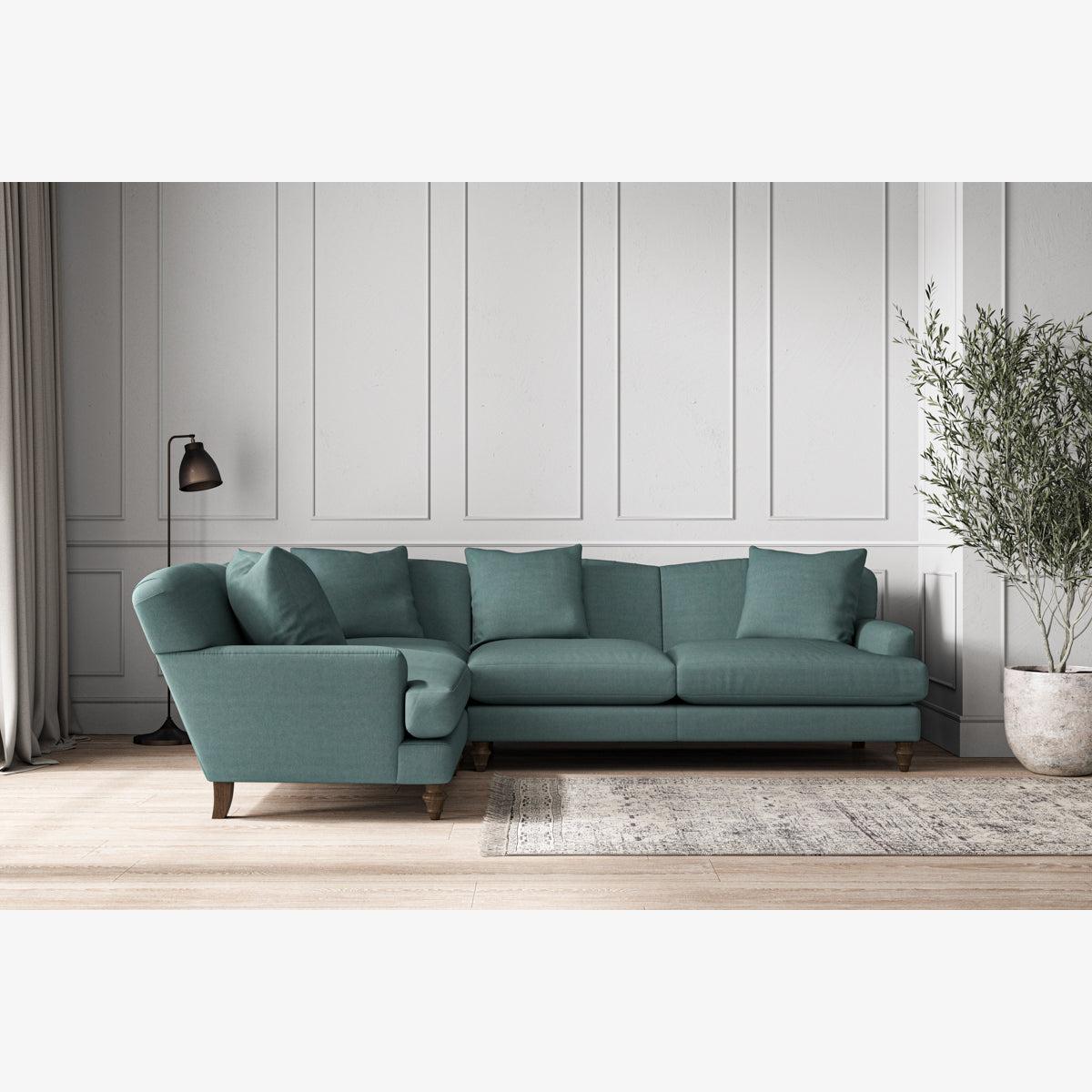 Our Deni large left hand corner sofa is generously proportioned with deep, sumptuous seat cushions for luxurious comfort. Handcrafted from a solid hardwood frame with high-grade steel serpentine springs and foam and fibre wrap filling, this timeless collection celebrates the best of British quality and design. Fine details include in-built back cushions, hand-turned hardwood feet and a set of four scatter cushions for added comfort. Our upholstery fabrics are chosen for their style and quality, where all fabrics are FR treated for domestic upholstery ensuring peace of mind as well as meeting specialist UK furniture requirements. Our curated colour palette offers a variety of sophisticated muted shades. Please note, our white background cut-out photography is shown in Natural for shape and style reference. Fabric Swatch Ordering We recommend ordering fabric swatches before placing your order, giving you the chance to feel the fabric and see your colour choices within your own home. You can order up to 6 free fabric swatches by clicking here. Will it fit? Before placing your order, it's important to take the time to measure the space you intend to place your made-to-order furniture to ensure it fits properly. You can read more in our You can read more in our Sofa Buying Guide.
