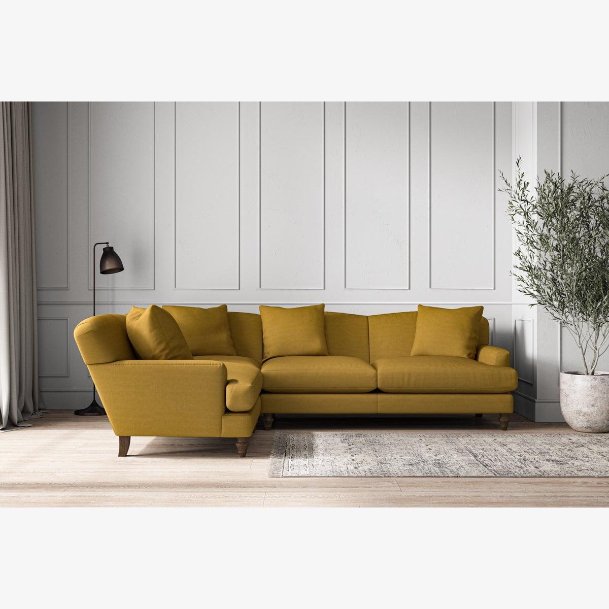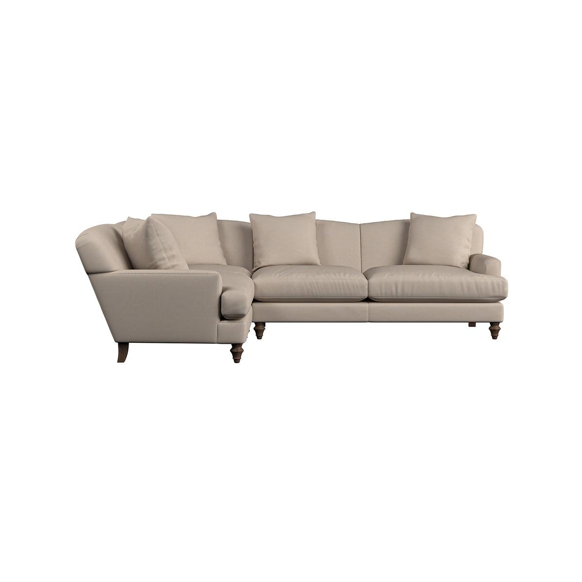 Our Deni large left hand corner sofa is generously proportioned with deep, sumptuous seat cushions for luxurious comfort. Handcrafted from a solid hardwood frame with high-grade steel serpentine springs and foam and fibre wrap filling, this timeless collection celebrates the best of British quality and design. Fine details include in-built back cushions, hand-turned hardwood feet and a set of four scatter cushions for added comfort. Our upholstery fabrics are chosen for their style and quality, where all fabrics are FR treated for domestic upholstery ensuring peace of mind as well as meeting specialist UK furniture requirements. Our curated colour palette offers a variety of sophisticated muted shades. Please note, our white background cut-out photography is shown in Natural for shape and style reference. Fabric Swatch Ordering We recommend ordering fabric swatches before placing your order, giving you the chance to feel the fabric and see your colour choices within your own home. You can order up to 6 free fabric swatches by clicking here. Will it fit? Before placing your order, it's important to take the time to measure the space you intend to place your made-to-order furniture to ensure it fits properly. You can read more in our You can read more in our Sofa Buying Guide.