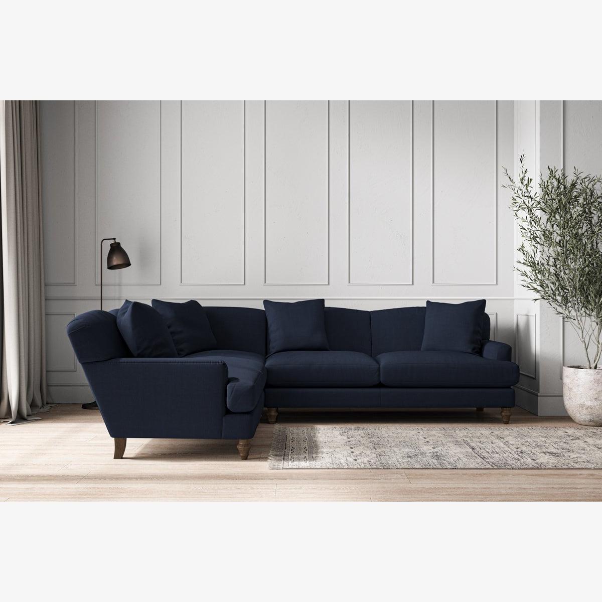 Our Deni super grand left hand corner sofa is generously proportioned with deep, sumptuous seat cushions for luxurious comfort. Handcrafted from a solid hardwood frame with high-grade steel serpentine springs and foam and fibre wrap filling, this timeless collection celebrates the best of British quality and design. Fine details include in-built back cushions, hand-turned hardwood feet and a set of four scatter cushions for added comfort. Our upholstery fabrics are sourced from Italy’s finest mills and are chosen for their style and quality. We have selected a beautiful heavyweight, soft washed linen with an outstanding texture. Our linen is perfectly suited to upholstery, with an appealing natural, and tactile feel. It is also heavy and durable. The linen is FR treated for domestic upholstery ensuring peace of mind as well as meeting specialist UK furniture requirements. Our curated colour palette offers a variety of 11 sophisticated muted shades. Please note, our white background cut-out photography is shown in Natural for shape and style reference. Fabric Swatch Ordering We recommend ordering fabric swatches before placing your order, giving you the chance to feel the fabric and see your colour choices within your own home. You can order up to 6 free fabric swatches by clicking here. Before placing your order, it's important to take the time to measure the space you intend to place your made-to-order furniture to ensure it fits properly. You can read more in our Sofa Buying Guide.
