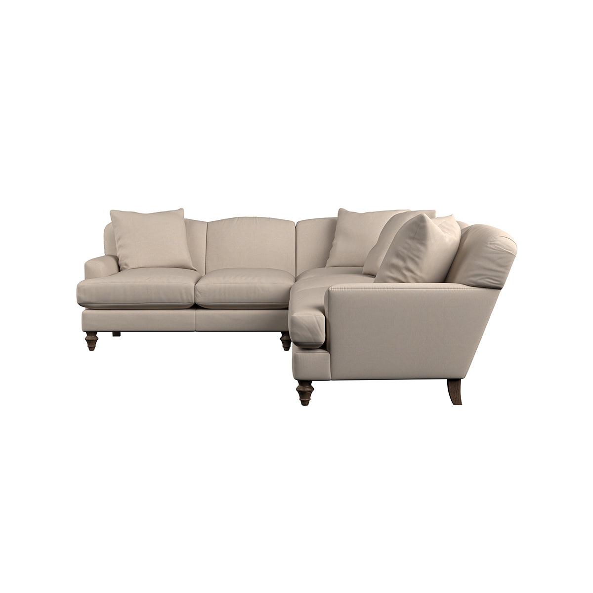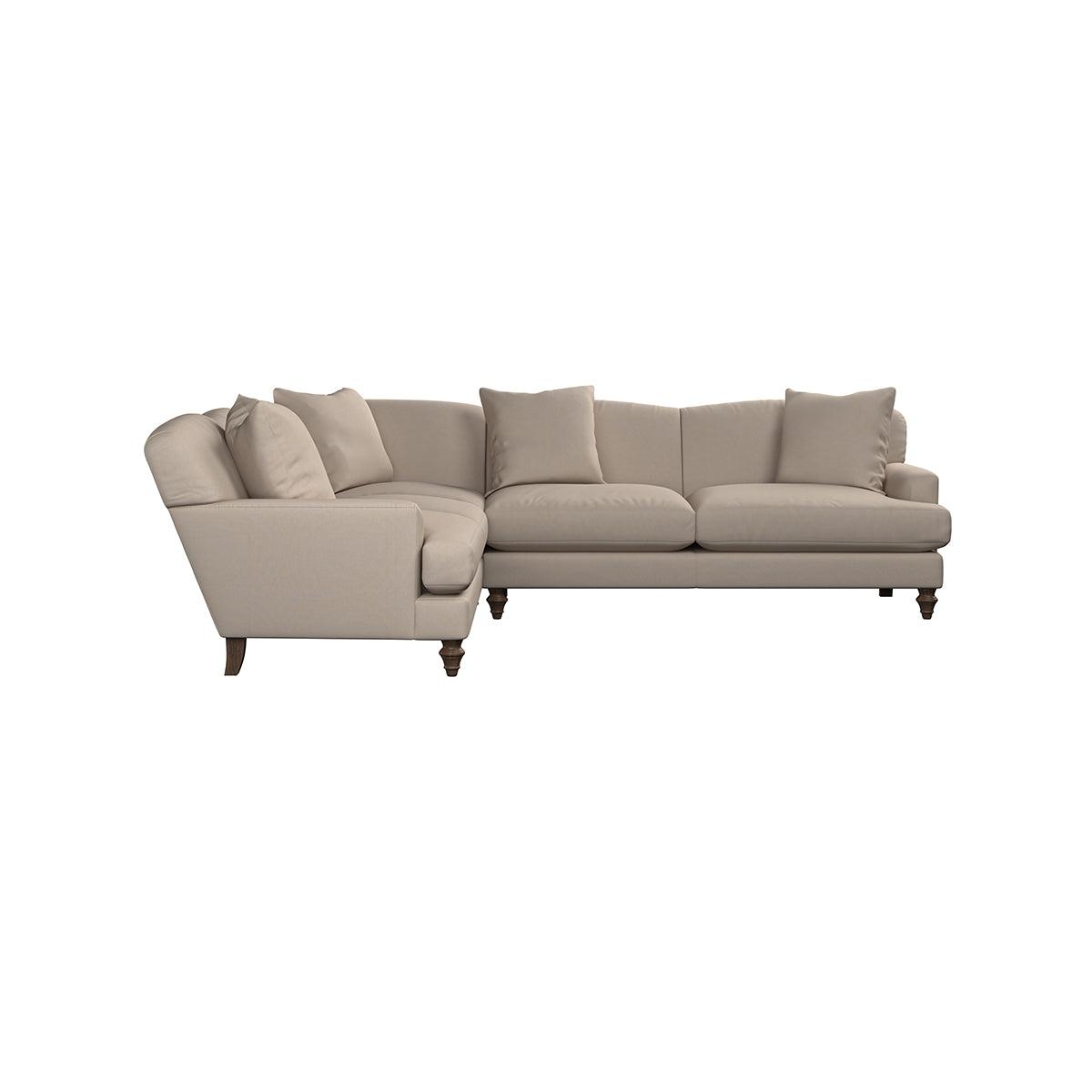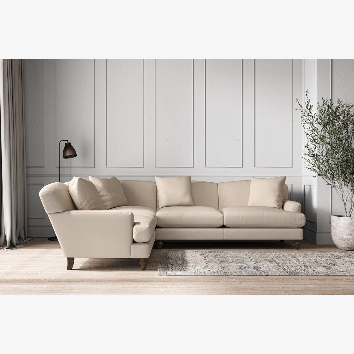 Our Deni super grand left hand corner sofa is generously proportioned with deep, sumptuous seat cushions for luxurious comfort. Handcrafted from a solid hardwood frame with high-grade steel serpentine springs and foam and fibre wrap filling, this timeless collection celebrates the best of British quality and design. Fine details include in-built back cushions, hand-turned hardwood feet and a set of four scatter cushions for added comfort. Our upholstery fabrics are chosen for their style and quality, where all fabrics are FR treated for domestic upholstery ensuring peace of mind as well as meeting specialist UK furniture requirements. Our curated colour palette offers a variety of sophisticated muted shades. Please note, our white background cut-out photography is shown in Natural for shape and style reference. Fabric Swatch Ordering We recommend ordering fabric swatches before placing your order, giving you the chance to feel the fabric and see your colour choices within your own home. You can order up to 6 free fabric swatches by clicking here. Before placing your order, it's important to take the time to measure the space you intend to place your made-to-order furniture to ensure it fits properly. You can read more in our Sofa Buying Guide.