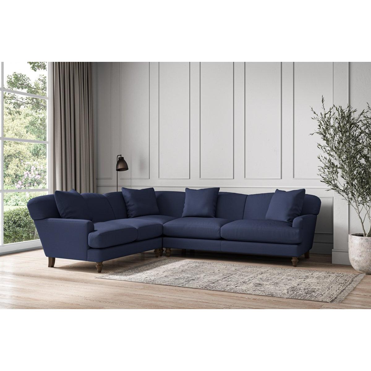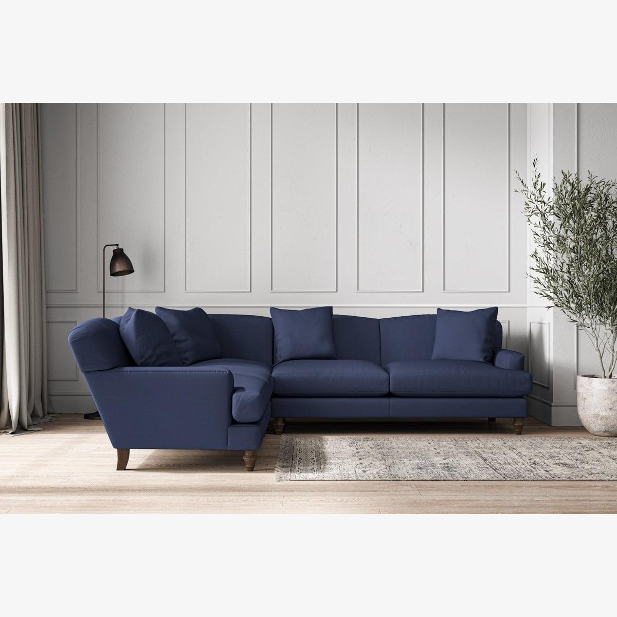 Our Deni super grand left hand corner sofa is generously proportioned with deep, sumptuous seat cushions for luxurious comfort. Handcrafted from a solid hardwood frame with high-grade steel serpentine springs and foam and fibre wrap filling, this timeless collection celebrates the best of British quality and design. Fine details include in-built back cushions, hand-turned hardwood feet and a set of four scatter cushions for added comfort. Our upholstery fabrics are chosen for their style and quality, where all fabrics are FR treated for domestic upholstery ensuring peace of mind as well as meeting specialist UK furniture requirements. Our curated colour palette offers a variety of sophisticated muted shades. Please note, our white background cut-out photography is shown in Natural for shape and style reference. Fabric Swatch Ordering We recommend ordering fabric swatches before placing your order, giving you the chance to feel the fabric and see your colour choices within your own home. You can order up to 6 free fabric swatches by clicking here. Before placing your order, it's important to take the time to measure the space you intend to place your made-to-order furniture to ensure it fits properly. You can read more in our Sofa Buying Guide.