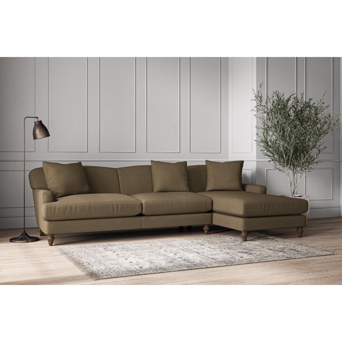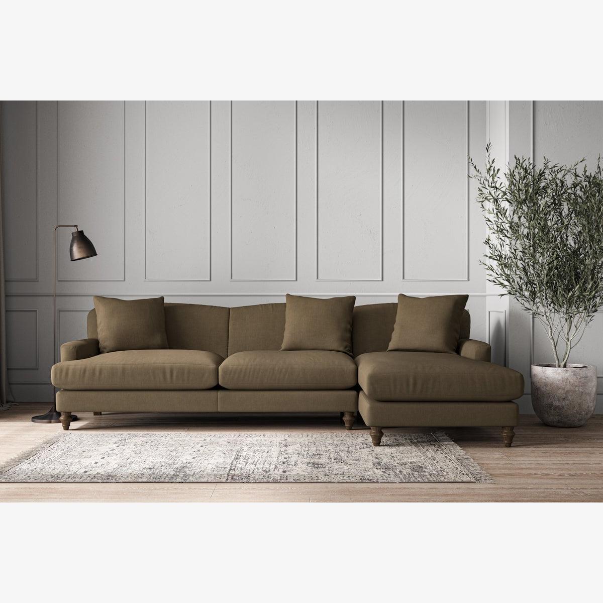 Our Deni grand left hand corner sofa is generously proportioned with deep, sumptuous seat cushions for luxurious comfort. Handcrafted from a solid hardwood frame with high-grade steel serpentine springs and foam and fibre wrap filling, this timeless collection celebrates the best of British quality and design. Fine details include in-built back cushions, hand-turned hardwood feet and a set of four scatter cushions for added comfort. Our upholstery fabrics are sourced from Italy’s finest mills and are chosen for their style and quality. We have selected a beautiful heavyweight, soft washed linen with an outstanding texture. Our linen is perfectly suited to upholstery, with an appealing natural, and tactile feel. It is also heavy and durable. The linen is FR treated for domestic upholstery ensuring peace of mind as well as meeting specialist UK furniture requirements. Our curated colour palette offers a variety of 11 sophisticated muted shades. Please note, our white background cut-out photography is shown in Natural for shape and style reference. Fabric Swatch Ordering We recommend ordering fabric swatches before placing your order, giving you the chance to feel the fabric and see your colour choices within your own home. You can order up to 6 free fabric swatches by clicking here. Before placing your order, it's important to take the time to measure the space you intend to place your made-to-order furniture to ensure it fits properly. You can read more in our Sofa Buying Guide.