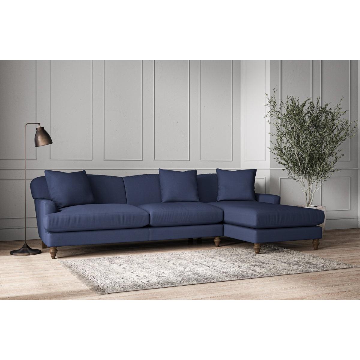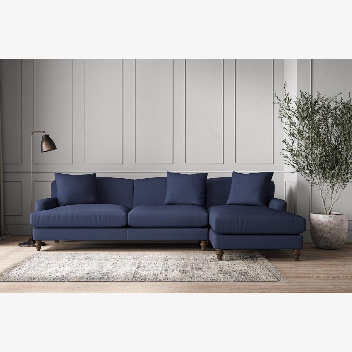 Our Deni grand right hand chaise sofa is generously proportioned with deep, sumptuous seat cushions for luxurious comfort. Handcrafted from a solid hardwood frame with high-grade steel serpentine springs and foam and fibre wrap filling, this timeless collection celebrates the best of British quality and design. Fine details include in-built back cushions, hand-turned hardwood feet and a set of three scatter cushions for added comfort. Our upholstery fabrics are chosen for their style and quality, where all fabrics are FR treated for domestic upholstery ensuring peace of mind as well as meeting specialist UK furniture requirements. Our curated colour palette offers a variety of sophisticated muted shades. Please note, our white background cut-out photography is shown in Natural for shape and style reference. Fabric Swatch Ordering We recommend ordering fabric swatches before placing your order, giving you the chance to feel the fabric and see your colour choices within your own home. You can order up to 6 free fabric swatches by clicking here. Before placing your order, it's important to take the time to measure the space you intend to place your made-to-order furniture to ensure it fits properly. You can read more in our Sofa Buying Guide.