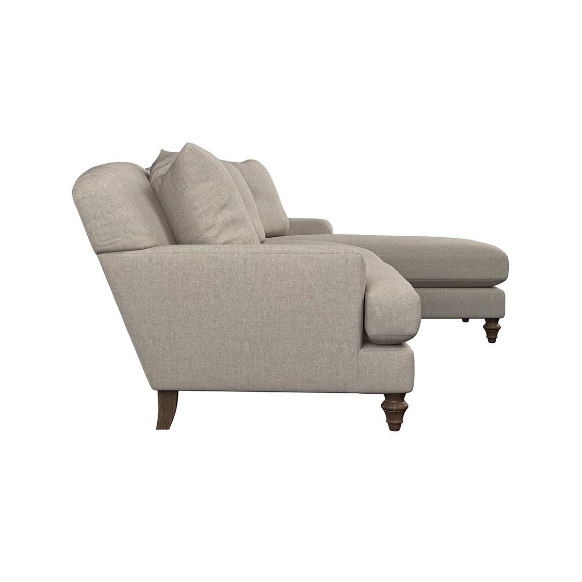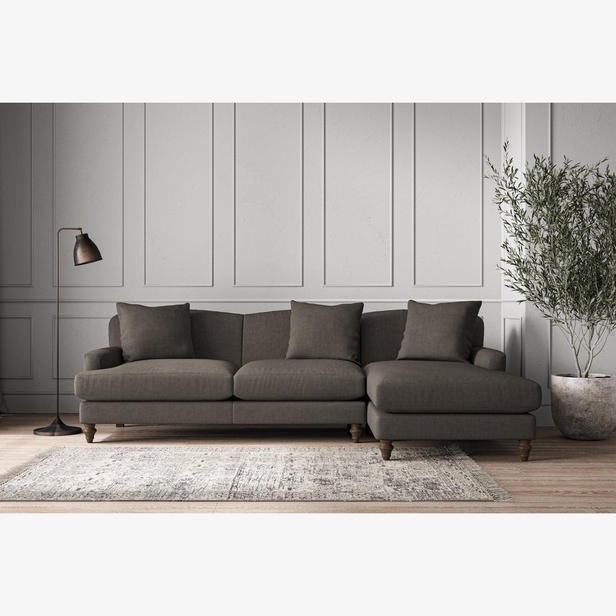Our Deni large right hand chaise sofa is generously proportioned with deep, sumptuous seat cushions for luxurious comfort. Handcrafted from a solid hardwood frame with high-grade steel serpentine springs and foam and fibre wrap filling, this timeless collection celebrates the best of British quality and design. Fine details include in-built back cushions, hand-turned hardwood feet and a set of three scatter cushions for added comfort. Our upholstery fabrics are sourced from Italy’s finest mills and are chosen for their style and quality. We have selected a beautiful heavyweight, soft washed linen with an outstanding texture. Our linen is perfectly suited to upholstery, with an appealing natural, and tactile feel. It is also heavy and durable. The linen is FR treated for domestic upholstery ensuring peace of mind as well as meeting specialist UK furniture requirements. Our curated colour palette offers a variety of 11 sophisticated muted shades. Please note, our white background cut-out photography is shown in Natural for shape and style reference. Fabric Swatch Ordering We recommend ordering fabric swatches before placing your order, giving you the chance to feel the fabric and see your colour choices within your own home. You can order up to 6 free fabric swatches by clicking here. Before placing your order, it's important to take the time to measure the space you intend to place your made-to-order furniture to ensure it fits properly. You can read more in our Sofa Buying Guide.