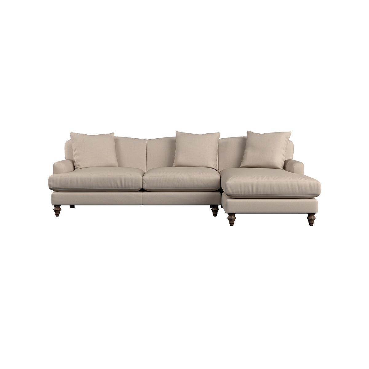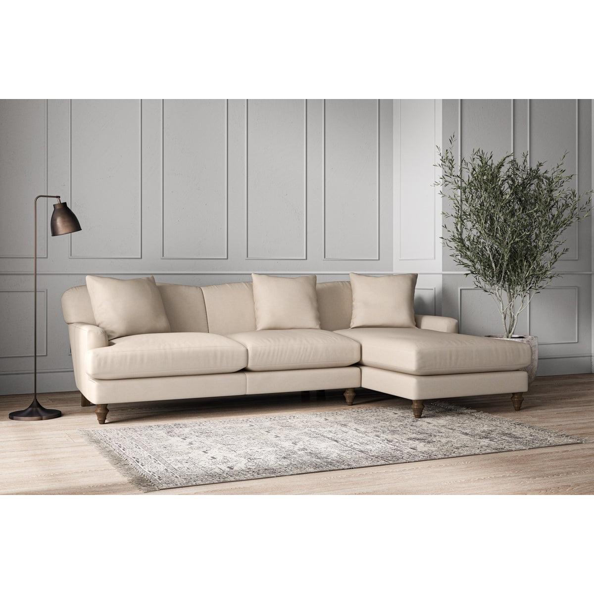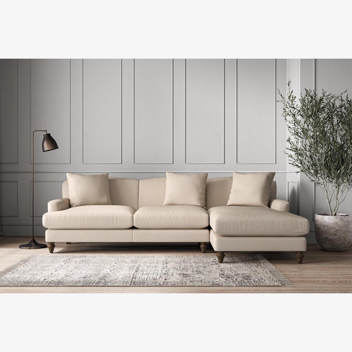 Our Deni large right hand chaise sofa is generously proportioned with deep, sumptuous seat cushions for luxurious comfort. Handcrafted from a solid hardwood frame with high-grade steel serpentine springs and foam and fibre wrap filling, this timeless collection celebrates the best of British quality and design. Fine details include in-built back cushions, hand-turned hardwood feet and a set of three scatter cushions for added comfort. Our upholstery fabrics are chosen for their style and quality, where all fabrics are FR treated for domestic upholstery ensuring peace of mind as well as meeting specialist UK furniture requirements. Our curated colour palette offers a variety of sophisticated muted shades. Please note, our white background cut-out photography is shown in Natural for shape and style reference. Fabric Swatch OrderingWe recommend ordering fabric swatches before placing your order, giving you the chance to feel the fabric and see your colour choices within your own home. You can order up to 6 free fabric swatches by clicking here. it fit?Before placing your order, it's important to take the time to measure the space you intend to place your made-to-order furniture to ensure it fits properly. You can read more in our You can read more in our Sofa Buying Guide.