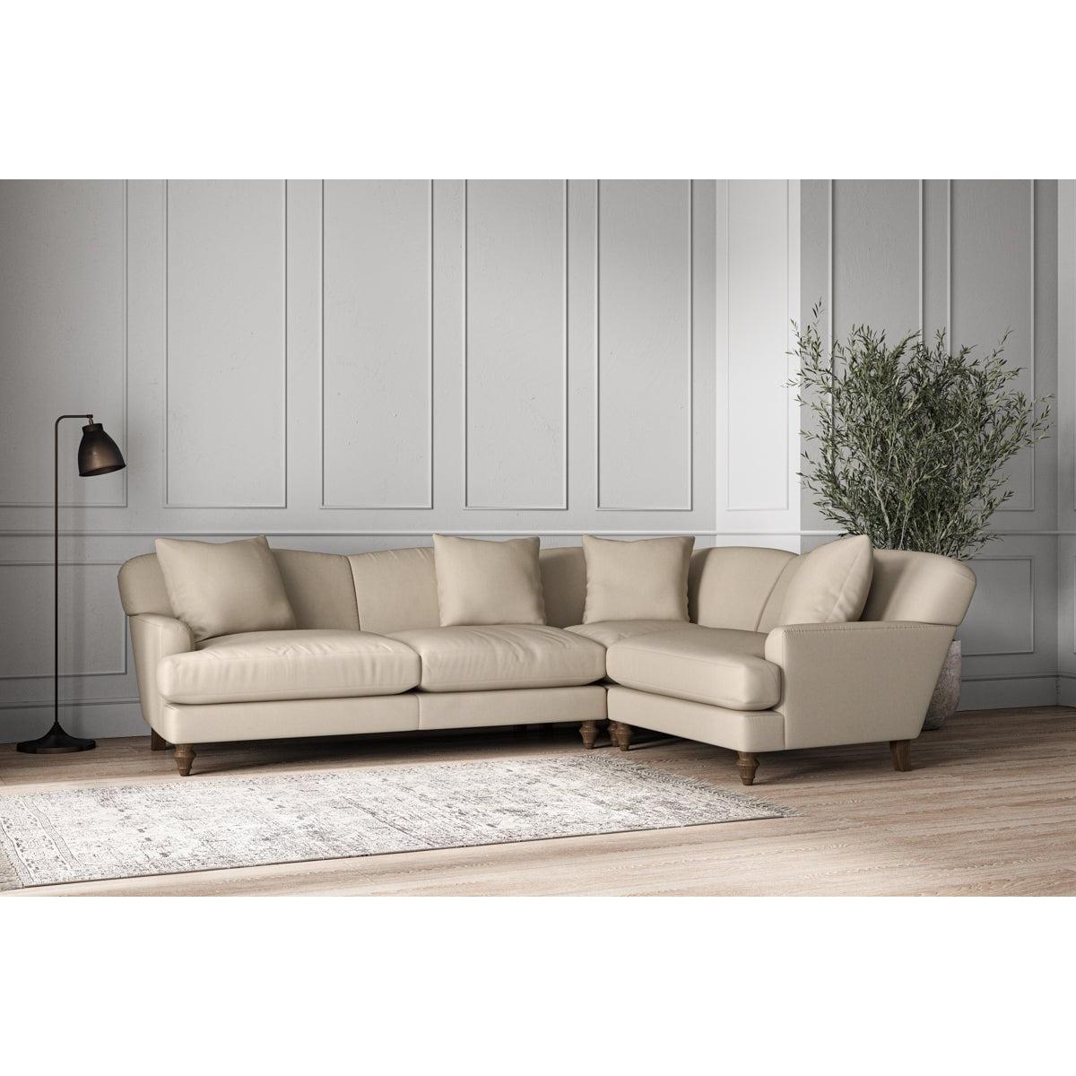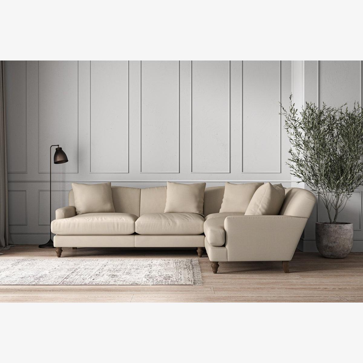 Our Deni large right hand corner sofa is generously proportioned with deep, sumptuous seat cushions for luxurious comfort. Handcrafted from a solid hardwood frame with high-grade steel serpentine springs and foam and fibre wrap filling, this timeless collection celebrates the best of British quality and design. Fine details include in-built back cushions, hand-turned hardwood feet and a set of four scatter cushions for added comfort. Our upholstery fabrics are chosen for their style and quality, where all fabrics are FR treated for domestic upholstery ensuring peace of mind as well as meeting specialist UK furniture requirements. Our curated colour palette offers a variety of sophisticated muted shades. Please note, our white background cut-out photography is shown in Natural for shape and style reference. Fabric Swatch Ordering We recommend ordering fabric swatches before placing your order, giving you the chance to feel the fabric and see your colour choices within your own home. You can order up to 6 free fabric swatches by clicking here. Will it fit? Before placing your order, it's important to take the time to measure the space you intend to place your made-to-order furniture to ensure it fits properly. You can read more in our You can read more in our Sofa Buying Guide.