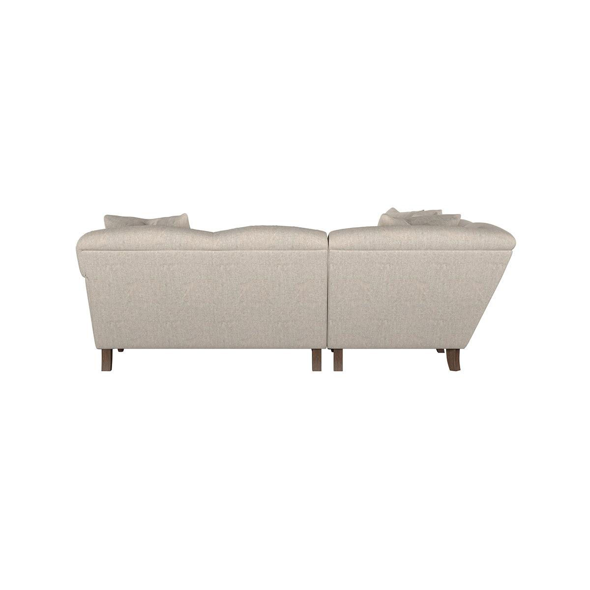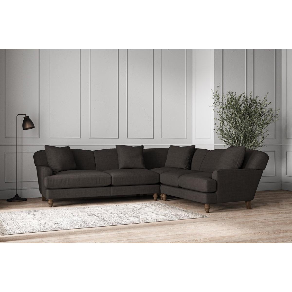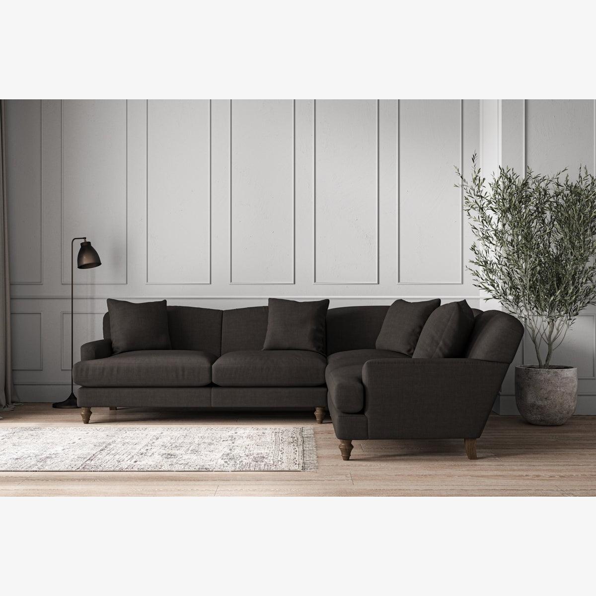 Our Deni super grand right hand corner sofa is generously proportioned with deep, sumptuous seat cushions for luxurious comfort. Handcrafted from a solid hardwood frame with high-grade steel serpentine springs and foam and fibre wrap filling, this timeless collection celebrates the best of British quality and design. Fine details include in-built back cushions, hand-turned hardwood feet and a set of four scatter cushions for added comfort. Our upholstery fabrics are sourced from Italy’s finest mills and are chosen for their style and quality. We have selected a beautiful heavyweight, soft washed linen with an outstanding texture. Our linen is perfectly suited to upholstery, with an appealing natural, and tactile feel. It is also heavy and durable. The linen is FR treated for domestic upholstery ensuring peace of mind as well as meeting specialist UK furniture requirements. Our curated colour palette offers a variety of 11 sophisticated muted shades. Please note, our white background cut-out photography is shown in Natural for shape and style reference. Fabric Swatch Ordering We recommend ordering fabric swatches before placing your order, giving you the chance to feel the fabric and see your colour choices within your own home. You can order up to 6 free fabric swatches by clicking here. Before placing your order, it's important to take the time to measure the space you intend to place your made-to-order furniture to ensure it fits properly. You can read more in our Sofa Buying Guide.