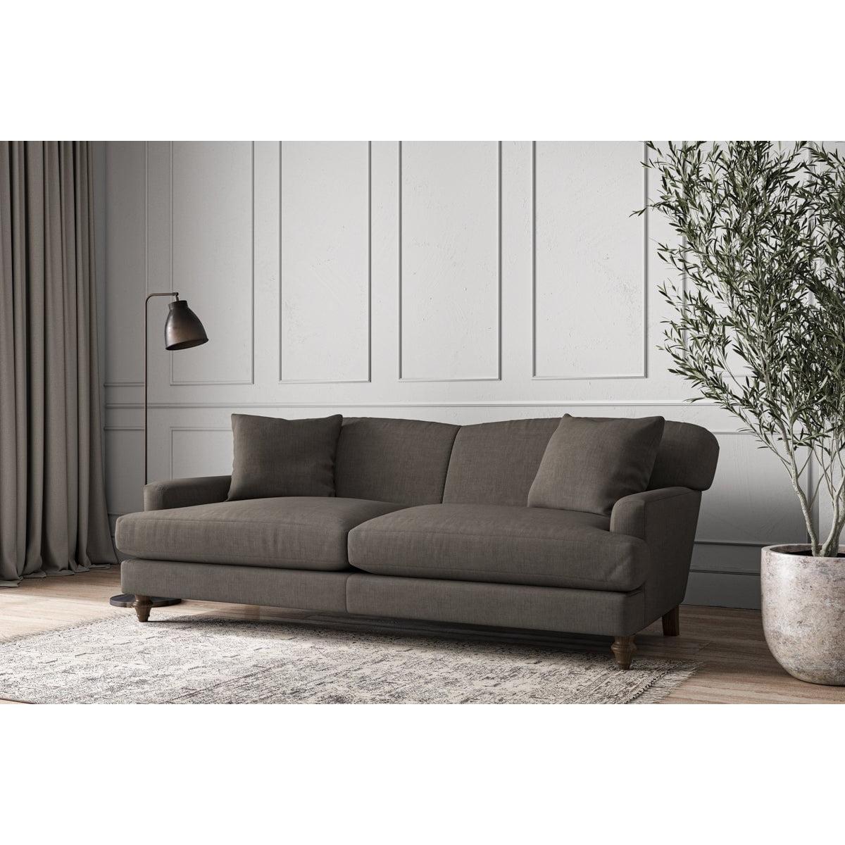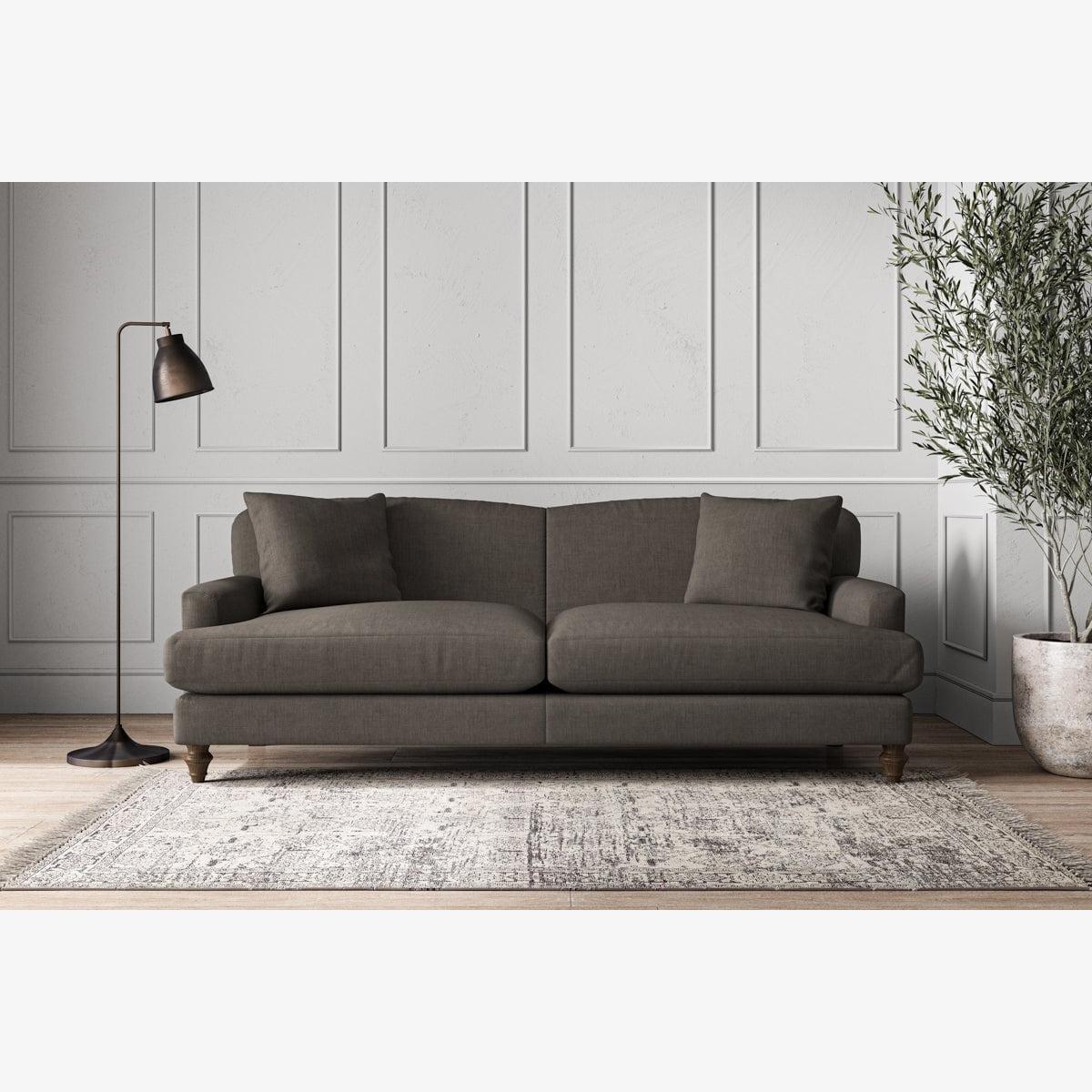 Our Deni grand sofa is generously proportioned with deep, sumptuous seat cushions for luxurious comfort. Handcrafted from a solid hardwood frame with high-grade steel serpentine springs and foam and fibre wrap filling, this timeless collection celebrates the best of British quality and design. Fine details include in-built back cushions, hand-turned hardwood feet and a set of two scatter cushions for added comfort. Our upholstery fabrics are sourced from Italy’s finest mills and are chosen for their style and quality. We have selected a beautiful heavyweight, soft washed linen with an outstanding texture. Our linen is perfectly suited to upholstery, with an appealing natural, and tactile feel. It is also heavy and durable. The linen is FR treated for domestic upholstery ensuring peace of mind as well as meeting specialist UK furniture requirements. Our curated colour palette offers a variety of 11 sophisticated muted shades. Please note, our white background cut-out photography is shown in Natural for shape and style reference. Fabric Swatch Ordering We recommend ordering fabric swatches before placing your order, giving you the chance to feel the fabric and see your colour choices within your own home. You can order up to 6 free fabric swatches by clicking here. Before placing your order, it's important to take the time to measure the space you intend to place your made-to-order furniture to ensure it fits properly. You can read more in our Sofa Buying Guide.