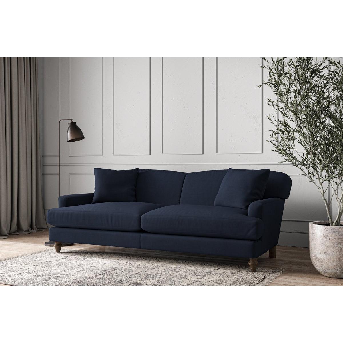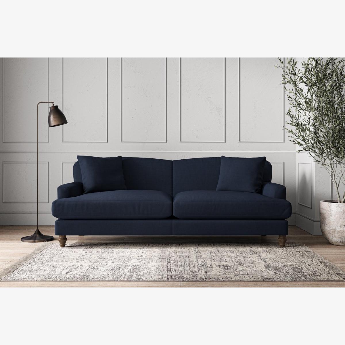 Our Deni grand sofa is generously proportioned with deep, sumptuous seat cushions for luxurious comfort. Handcrafted from a solid hardwood frame with high-grade steel serpentine springs and foam and fibre wrap filling, this timeless collection celebrates the best of British quality and design. Fine details include in-built back cushions, hand-turned hardwood feet and a set of two scatter cushions for added comfort. Our upholstery fabrics are sourced from Italy’s finest mills and are chosen for their style and quality. We have selected a beautiful heavyweight, soft washed linen with an outstanding texture. Our linen is perfectly suited to upholstery, with an appealing natural, and tactile feel. It is also heavy and durable. The linen is FR treated for domestic upholstery ensuring peace of mind as well as meeting specialist UK furniture requirements. Our curated colour palette offers a variety of 11 sophisticated muted shades. Please note, our white background cut-out photography is shown in Natural for shape and style reference. Fabric Swatch Ordering We recommend ordering fabric swatches before placing your order, giving you the chance to feel the fabric and see your colour choices within your own home. You can order up to 6 free fabric swatches by clicking here. Before placing your order, it's important to take the time to measure the space you intend to place your made-to-order furniture to ensure it fits properly. You can read more in our Sofa Buying Guide.
