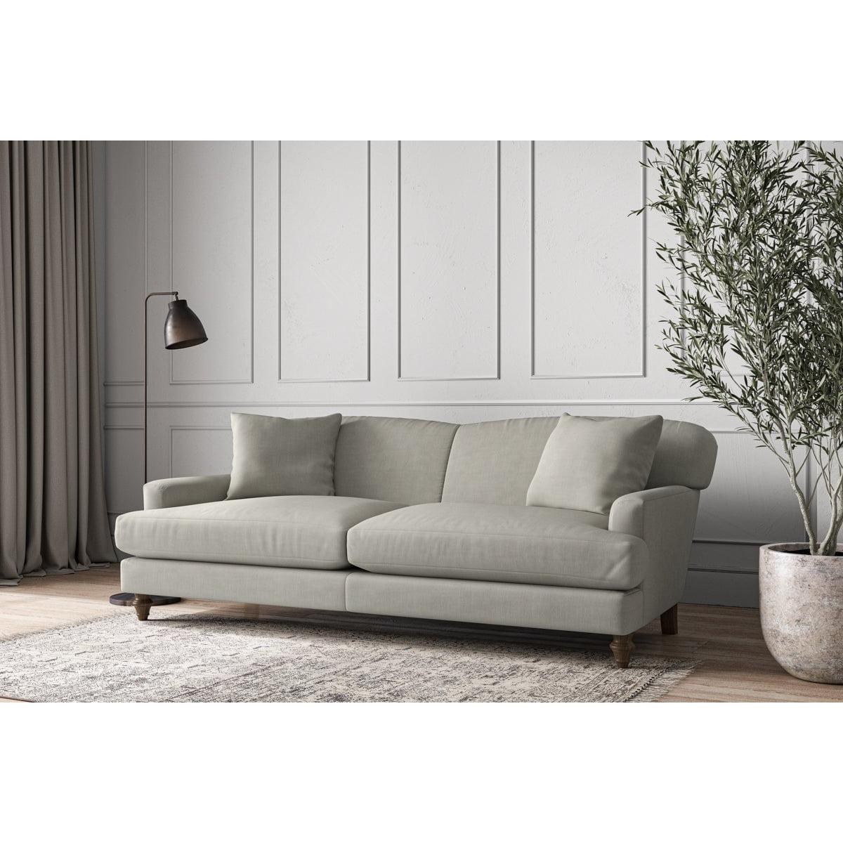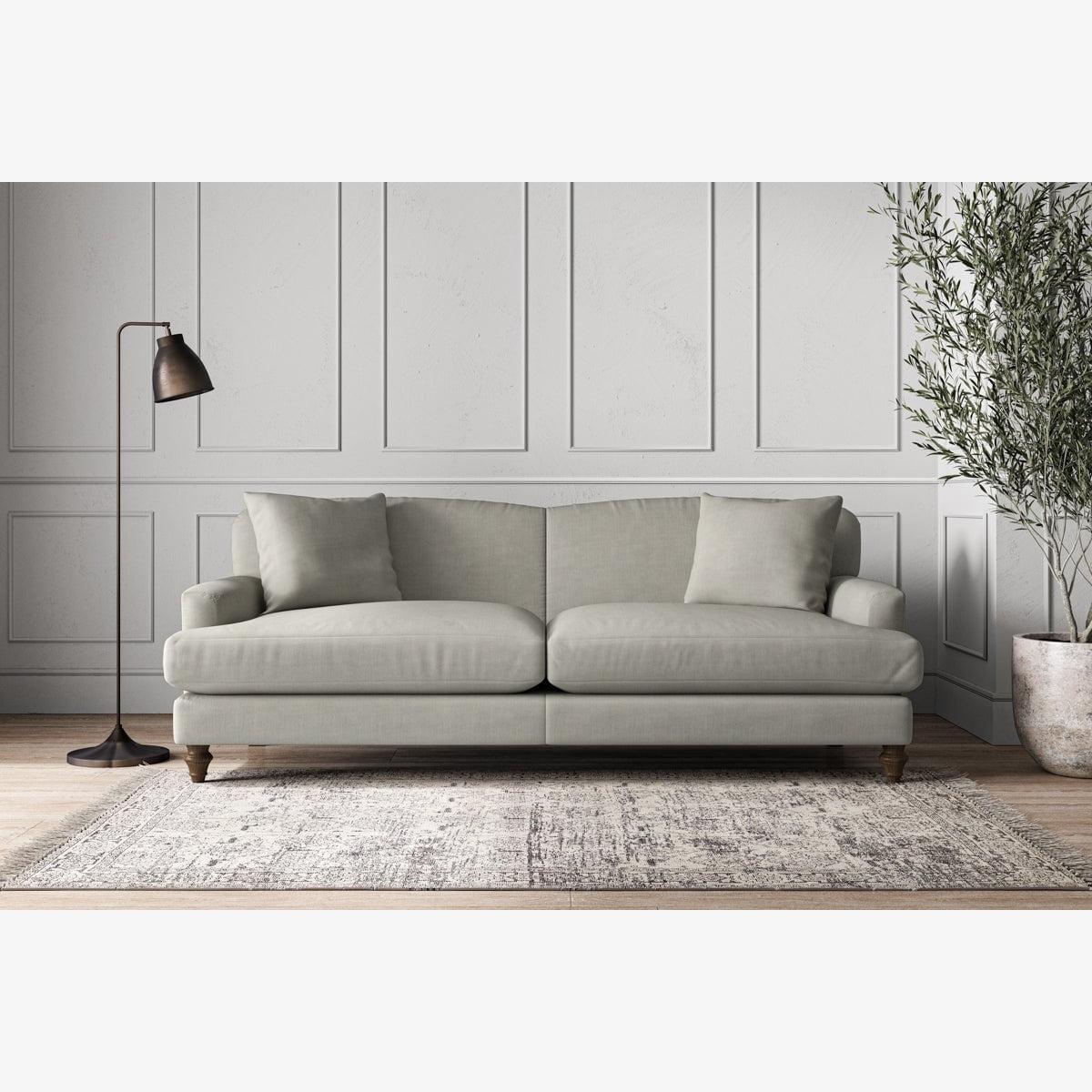 Our Deni grand sofa is generously proportioned with deep, sumptuous seat cushions for luxurious comfort. Handcrafted from a solid hardwood frame with high-grade steel serpentine springs and foam and fibre wrap filling, this timeless collection celebrates the best of British quality and design. Fine details include in-built back cushions, hand-turned hardwood feet and a set of two scatter cushions for added comfort. Our upholstery fabrics are sourced from Italy’s finest mills and are chosen for their style and quality. We have selected a beautiful heavyweight, soft washed linen with an outstanding texture. Our linen is perfectly suited to upholstery, with an appealing natural, and tactile feel. It is also heavy and durable. The linen is FR treated for domestic upholstery ensuring peace of mind as well as meeting specialist UK furniture requirements. Our curated colour palette offers a variety of 11 sophisticated muted shades. Please note, our white background cut-out photography is shown in Natural for shape and style reference. Fabric Swatch Ordering We recommend ordering fabric swatches before placing your order, giving you the chance to feel the fabric and see your colour choices within your own home. You can order up to 6 free fabric swatches by clicking here. Before placing your order, it's important to take the time to measure the space you intend to place your made-to-order furniture to ensure it fits properly. You can read more in our Sofa Buying Guide.