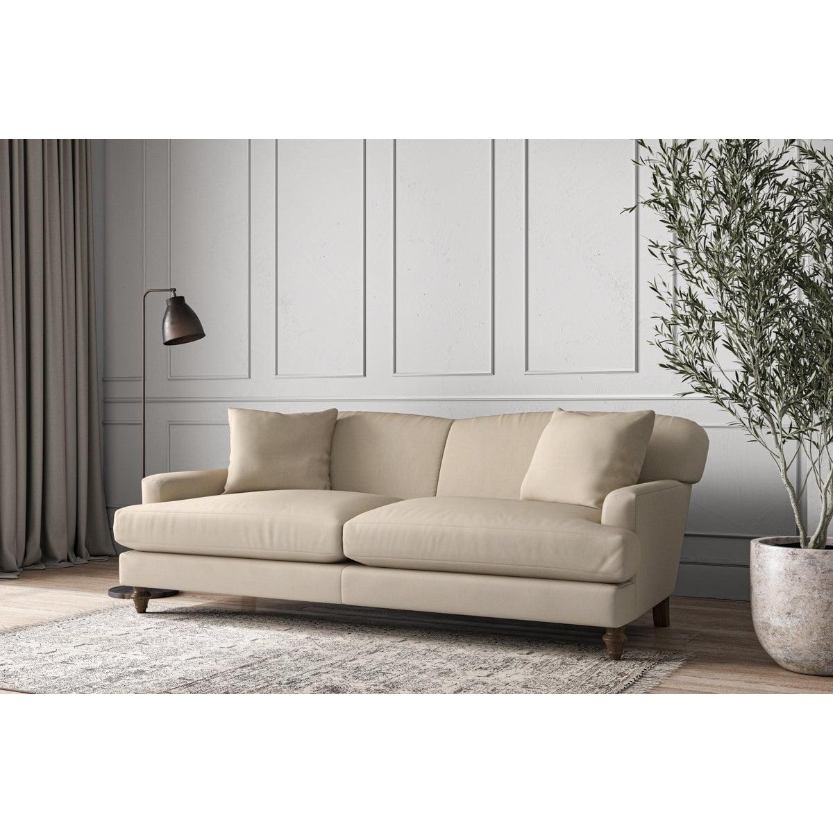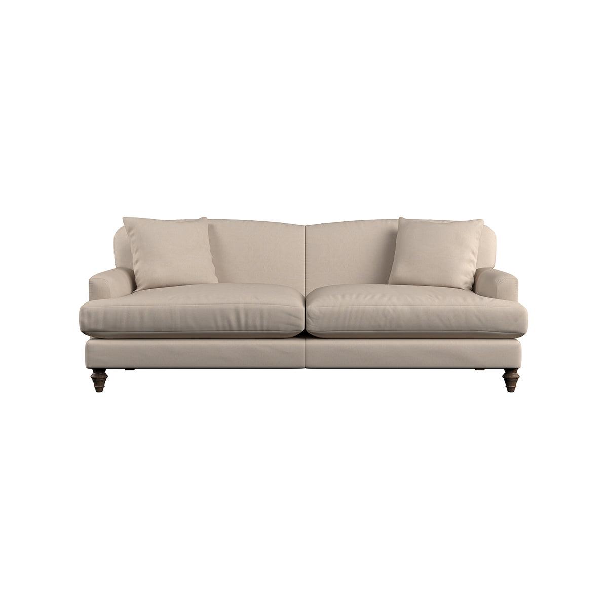 Our Deni grand sofa is generously proportioned with deep, sumptuous seat cushions for luxurious comfort. Handcrafted from a solid hardwood frame with high-grade steel serpentine springs and foam and fibre wrap filling, this timeless collection celebrates the best of British quality and design. Fine details include in-built back cushions, hand-turned hardwood feet and a set of two scatter cushions for added comfort. Our upholstery fabrics are chosen for their style and quality, where all fabrics are FR treated for domestic upholstery ensuring peace of mind as well as meeting specialist UK furniture requirements. Our curated colour palette offers a variety of sophisticated muted shades. Please note, our white background cut-out photography is shown in Natural for shape and style reference. Fabric Swatch Ordering We recommend ordering fabric swatches before placing your order, giving you the chance to feel the fabric and see your colour choices within your own home. You can order up to 6 free fabric swatches by clicking here. Before placing your order, it's important to take the time to measure the space you intend to place your made-to-order furniture to ensure it fits properly. You can read more in our Sofa Buying Guide.