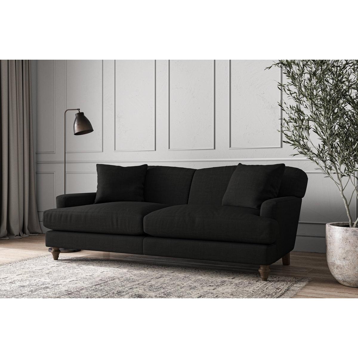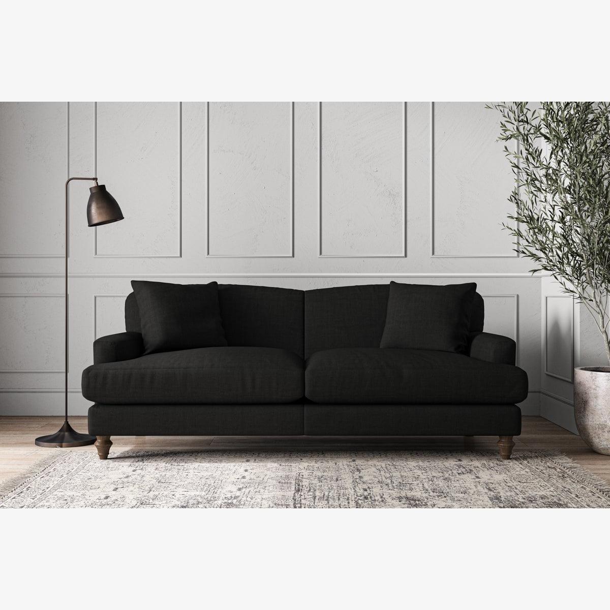 Our Deni large sofa is generously proportioned with deep, sumptuous seat cushions for luxurious comfort. Handcrafted from a solid hardwood frame with high-grade steel serpentine springs and foam and fibre wrap filling, this timeless collection celebrates the best of British quality and design. Fine details include in-built back cushions, hand-turned hardwood feet and two scatter cushions for added comfort. Our upholstery fabrics are sourced from Italy’s finest mills and are chosen for their style and quality. We have selected a beautiful heavyweight, soft washed linen with an outstanding texture. Our linen is perfectly suited to upholstery, with an appealing natural, and tactile feel. It is also heavy and durable. The linen is FR treated for domestic upholstery ensuring peace of mind as well as meeting specialist UK furniture requirements. Our curated colour palette offers a variety of 11 sophisticated muted shades. Please note, our white background cut-out photography is shown in Natural for shape and style reference. Fabric Swatch Ordering We recommend ordering fabric swatches before placing your order, giving you the chance to feel the fabric and see your colour choices within your own home. You can order up to 6 free fabric swatches by clicking here. Before placing your order, it's important to take the time to measure the space you intend to place your made-to-order furniture to ensure it fits properly. You can read more in our Sofa Buying Guide.